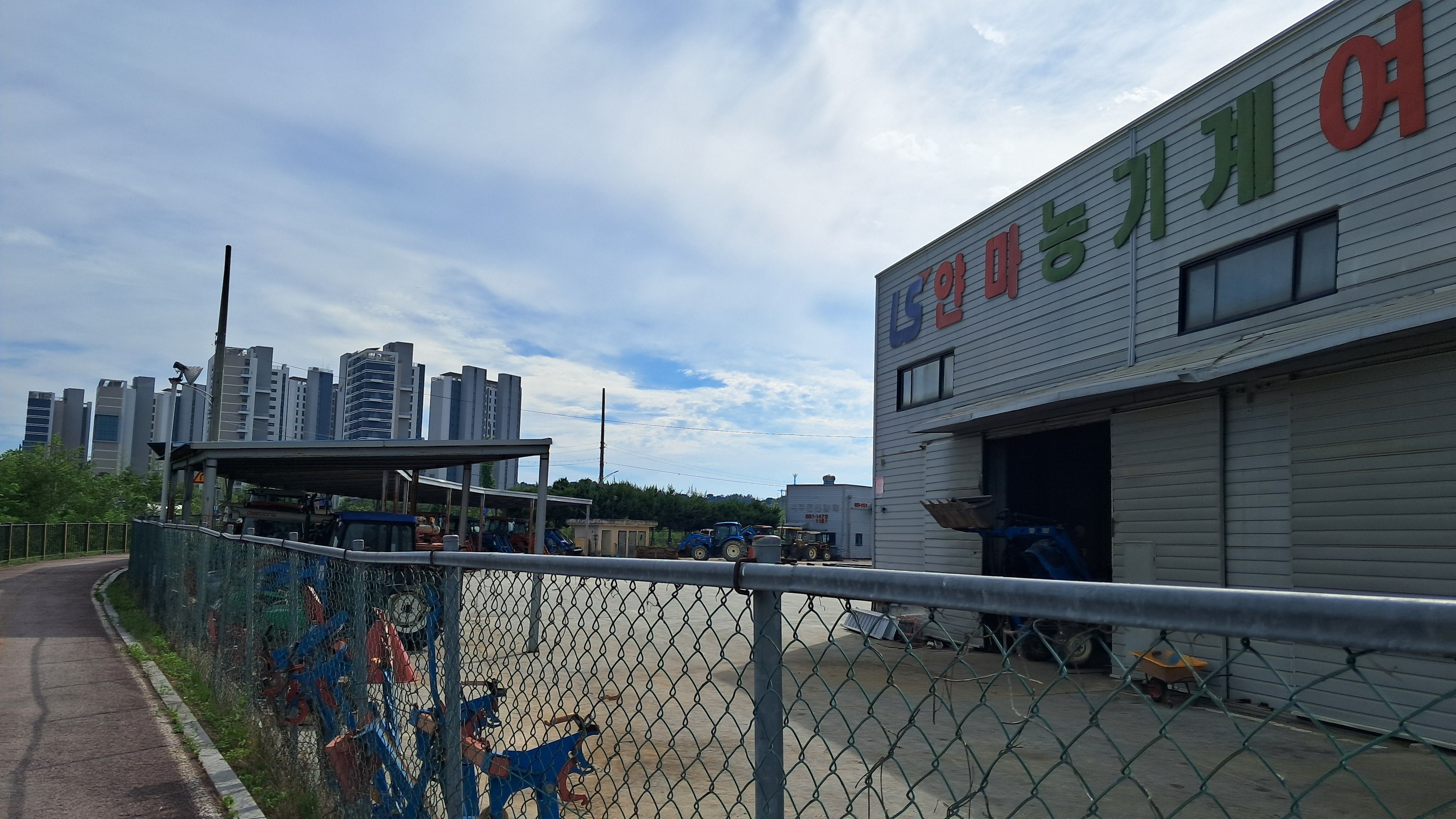 하천을 따라 병원을 지나고 농기계 판매 및 정비소를 지나갑니다.