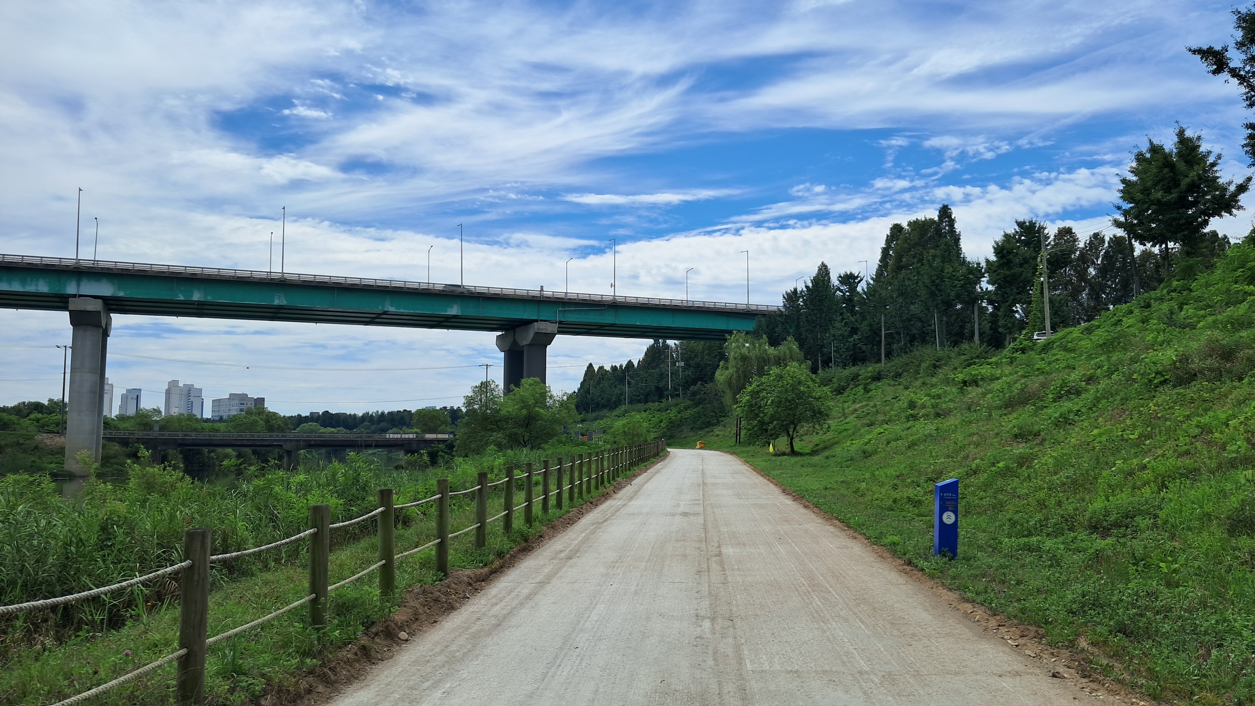 다리를 건너면 나무가 우거진 자전거길과 도보길을 걸을 수 있습니다.