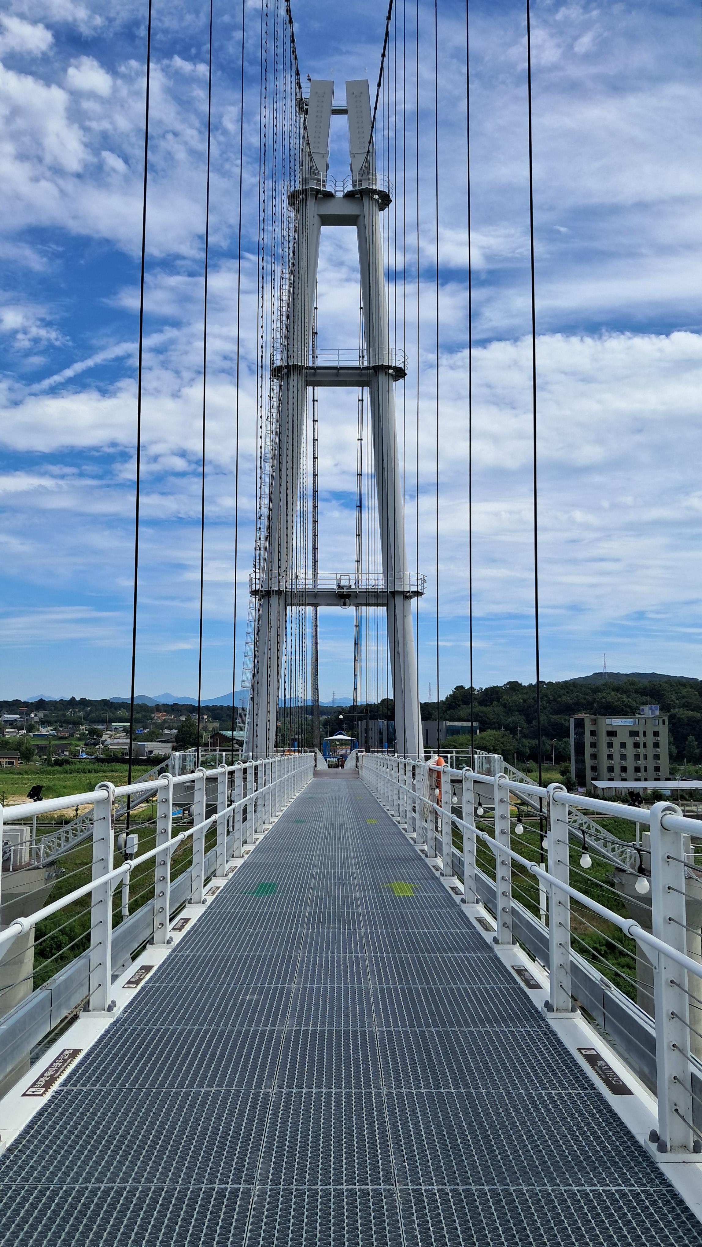 두 개의 큰 기둥에 와이어로 설치된 다리입니다.