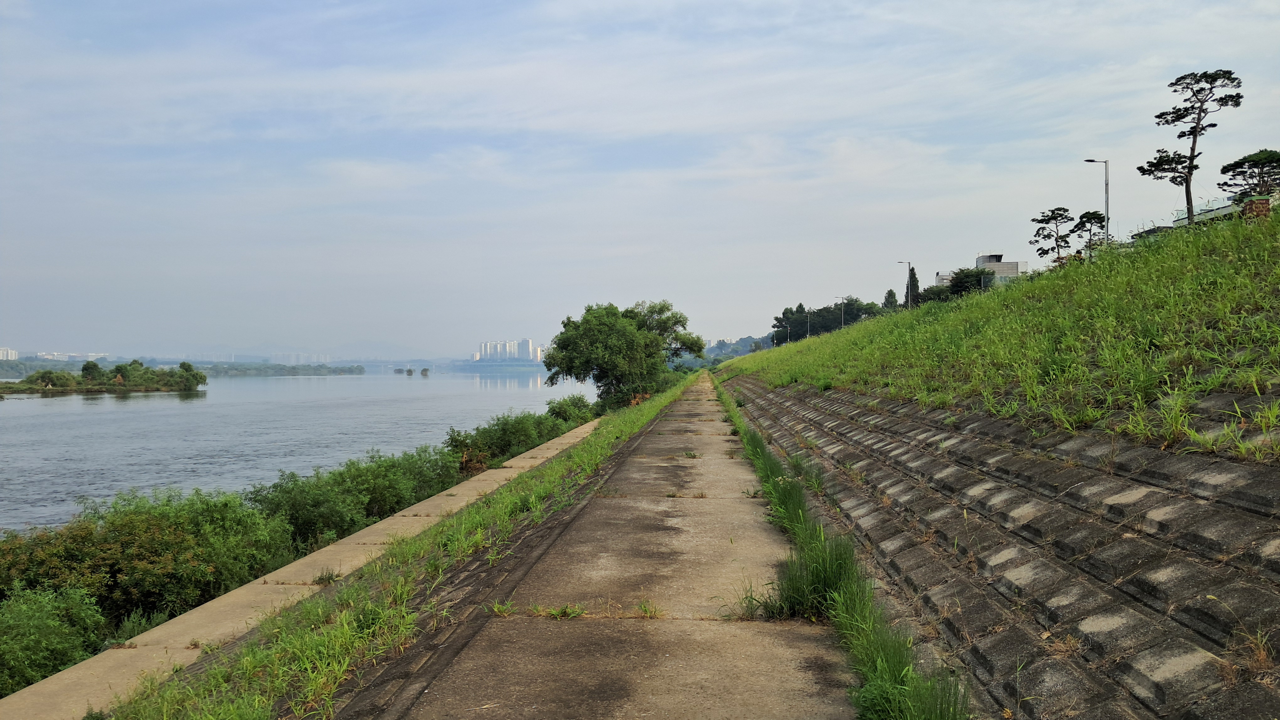 제방의 중간 부분으로 걸어가는 길도 무더위와의 동행입니다.