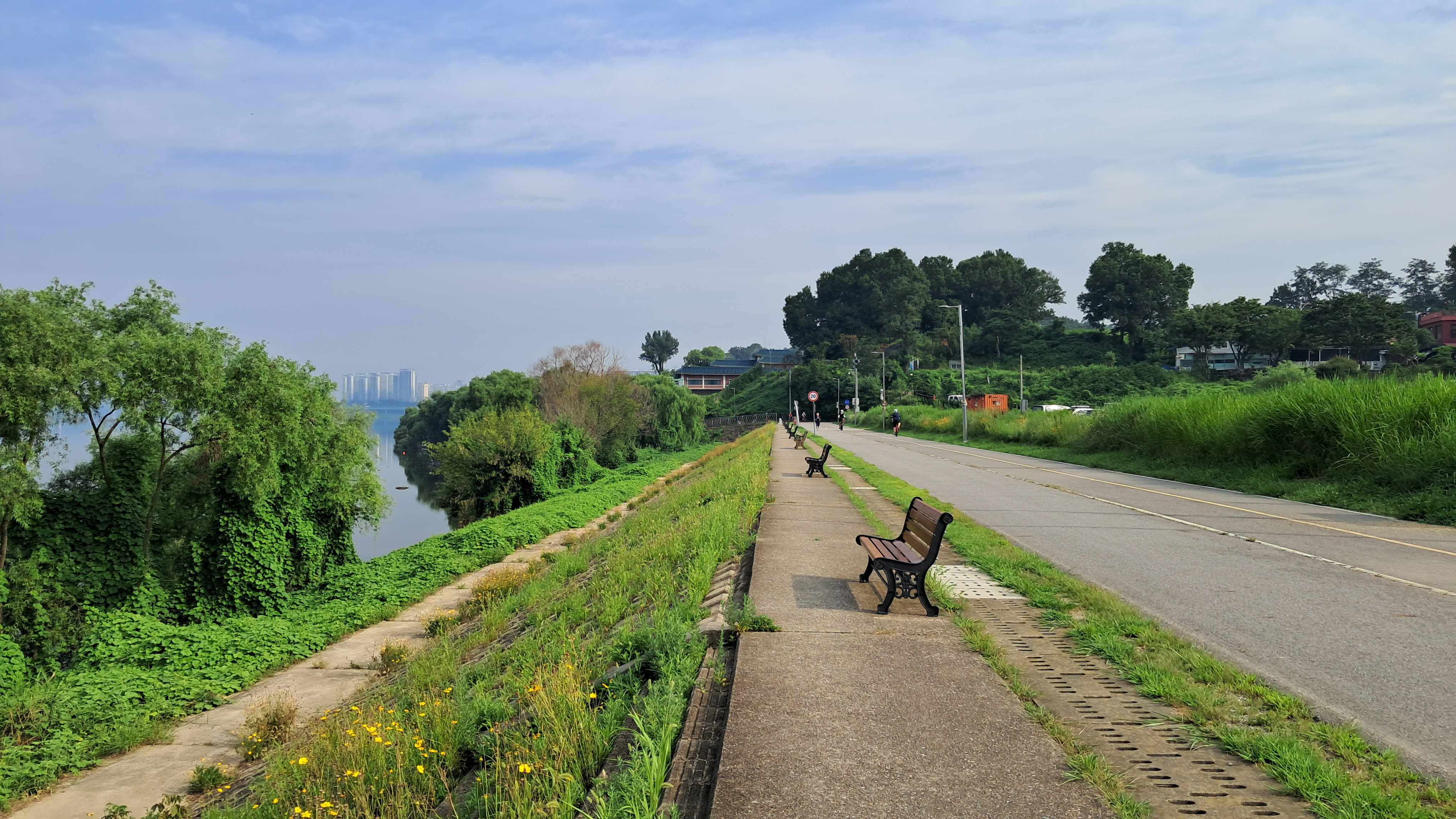 강변을 따라 조성된 넓은 공원은 푸른 잔디로 가득합니다.