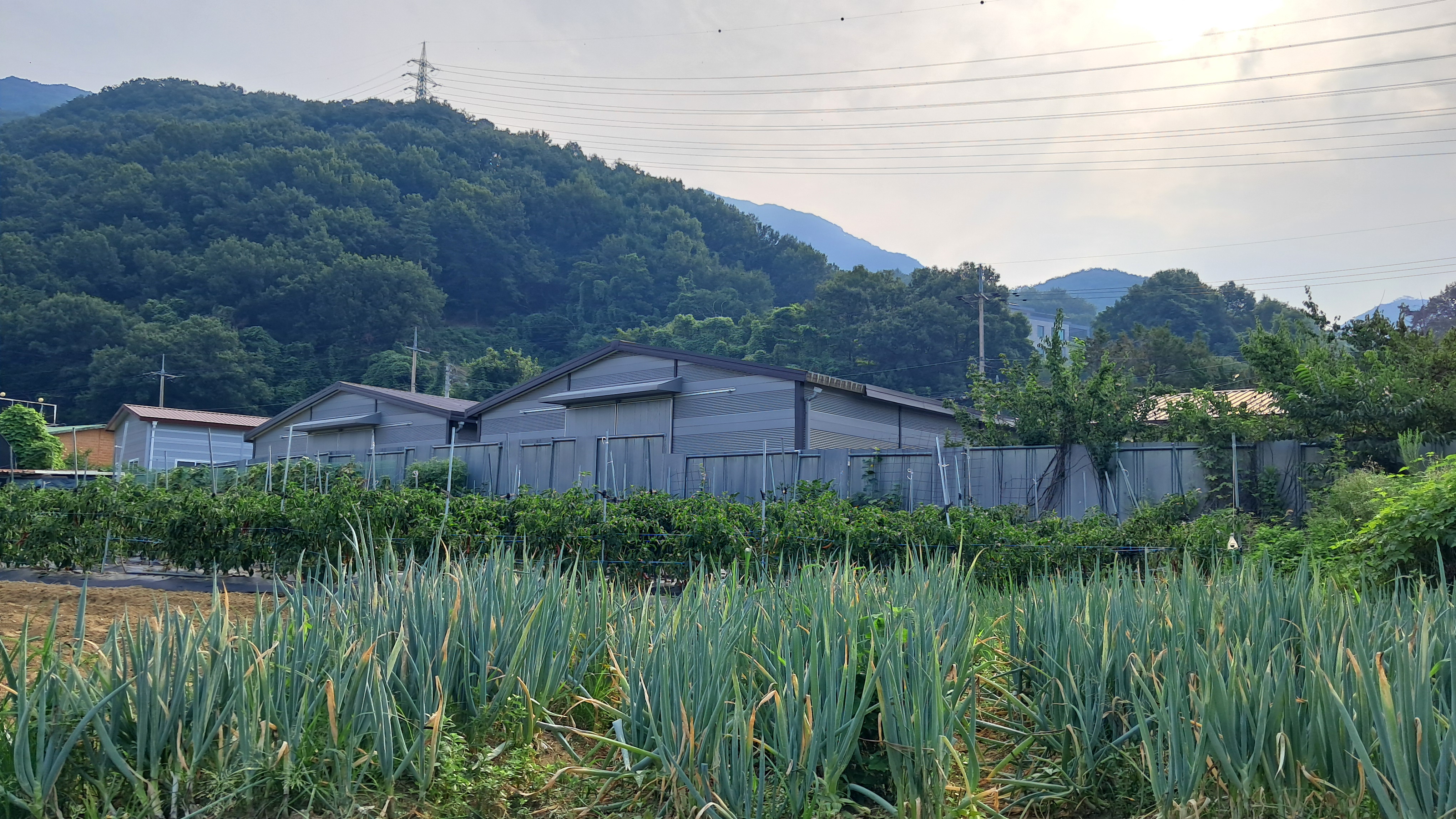 한강을 앞에 두고 예봉산을 배경으로 밭에는 대파가 한여름의 에너지를 받으며 잘 자라나고 있습니다.