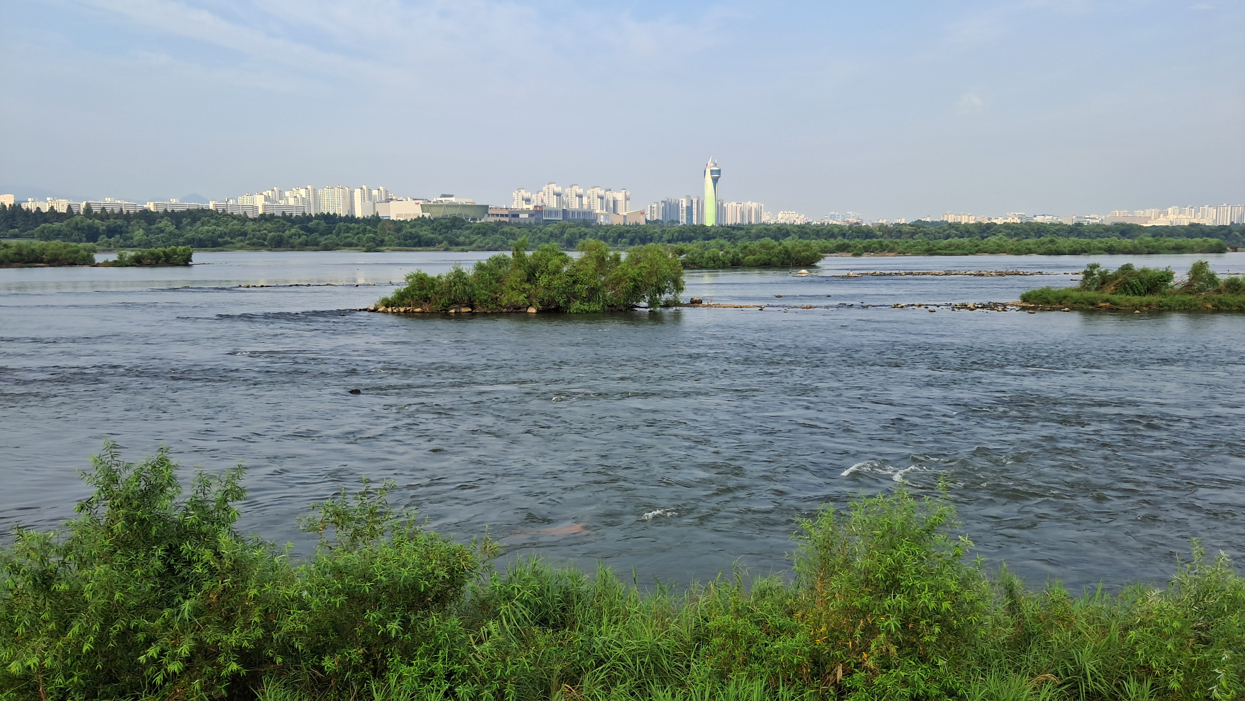 한강 위에 여러 개의 섬이 떠있는 것이 보입니다.
