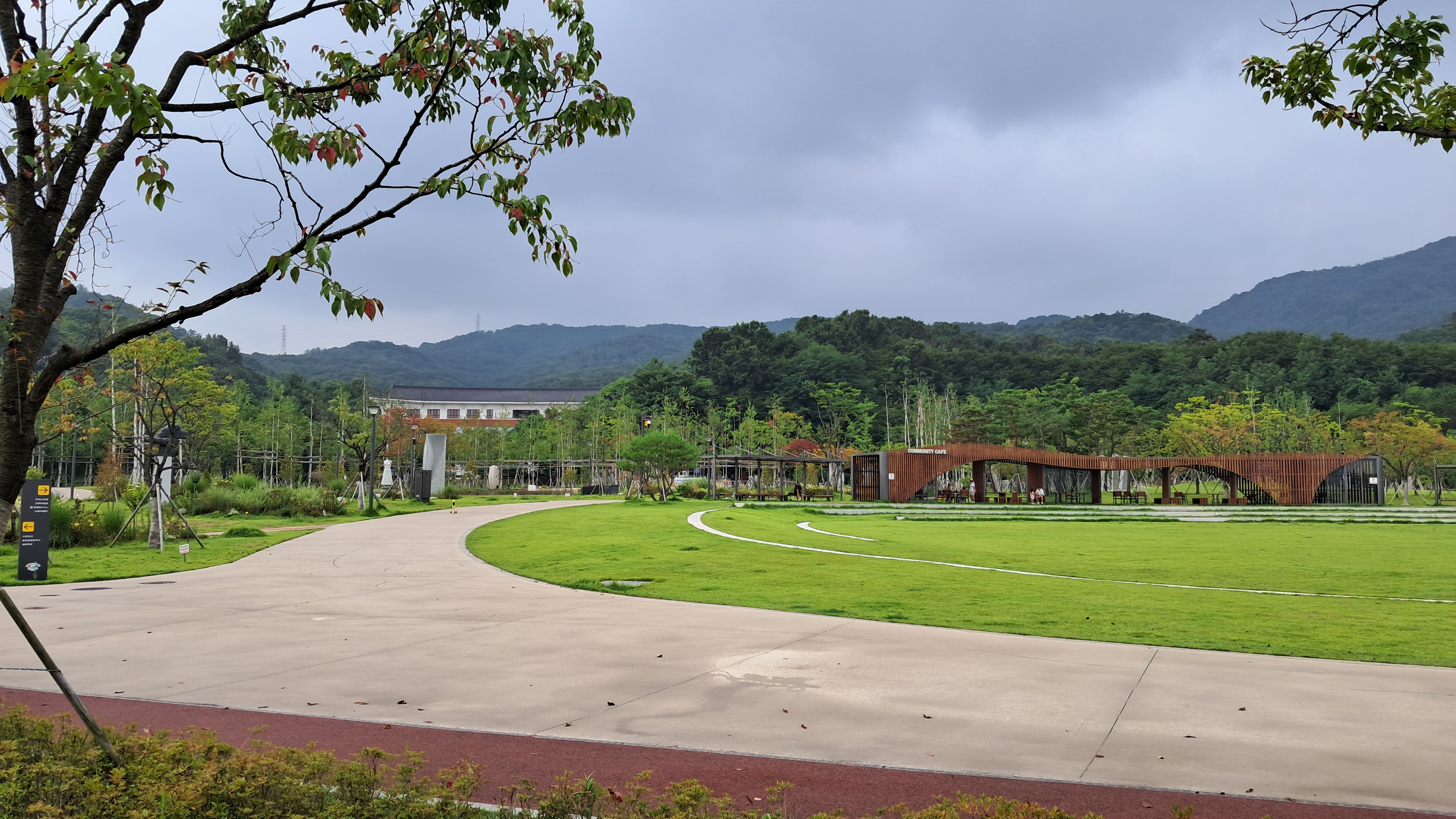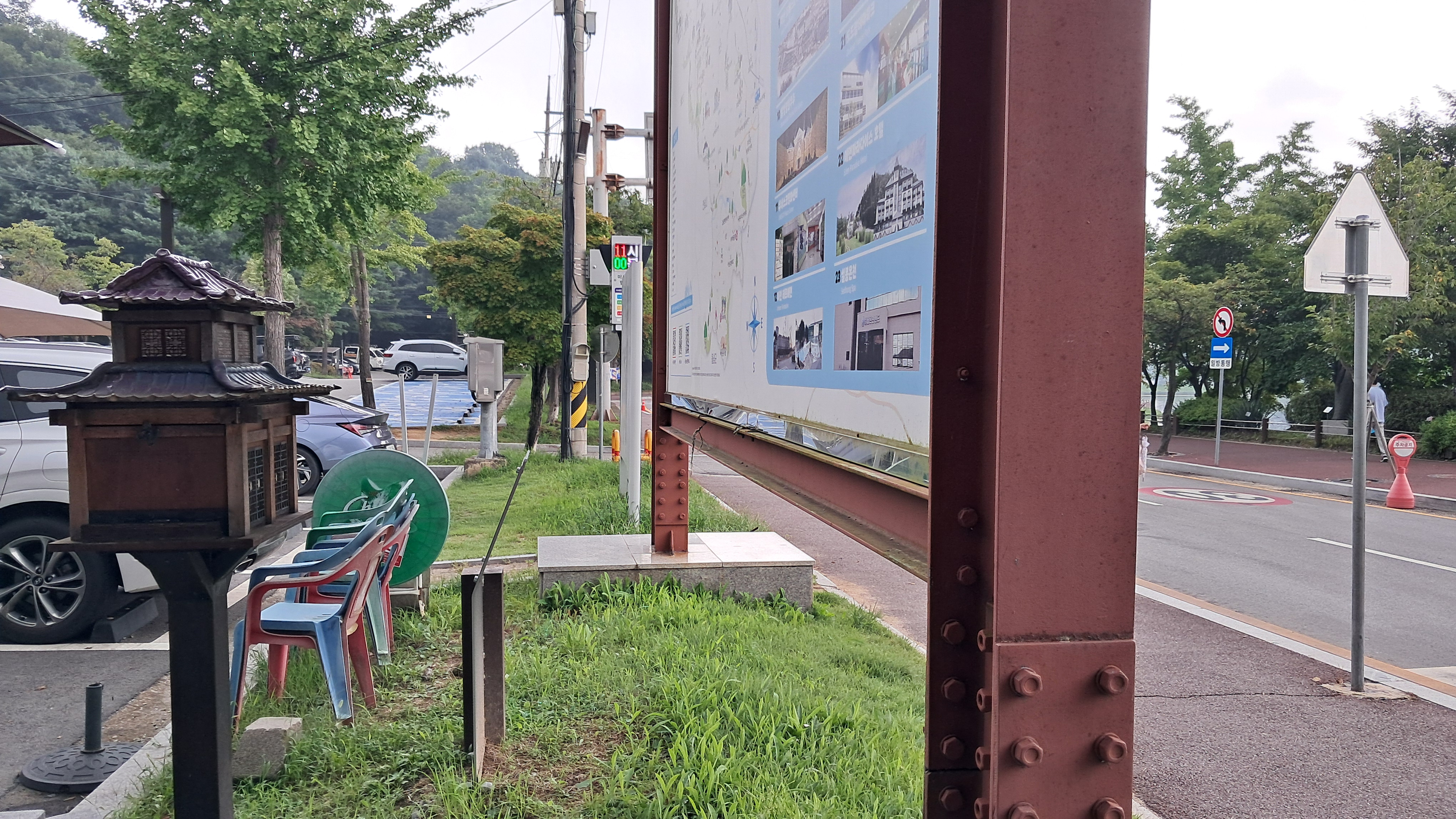 서둘러서 앞에 보이는 쉼터로 달려가서 자리에 앉았습니다.