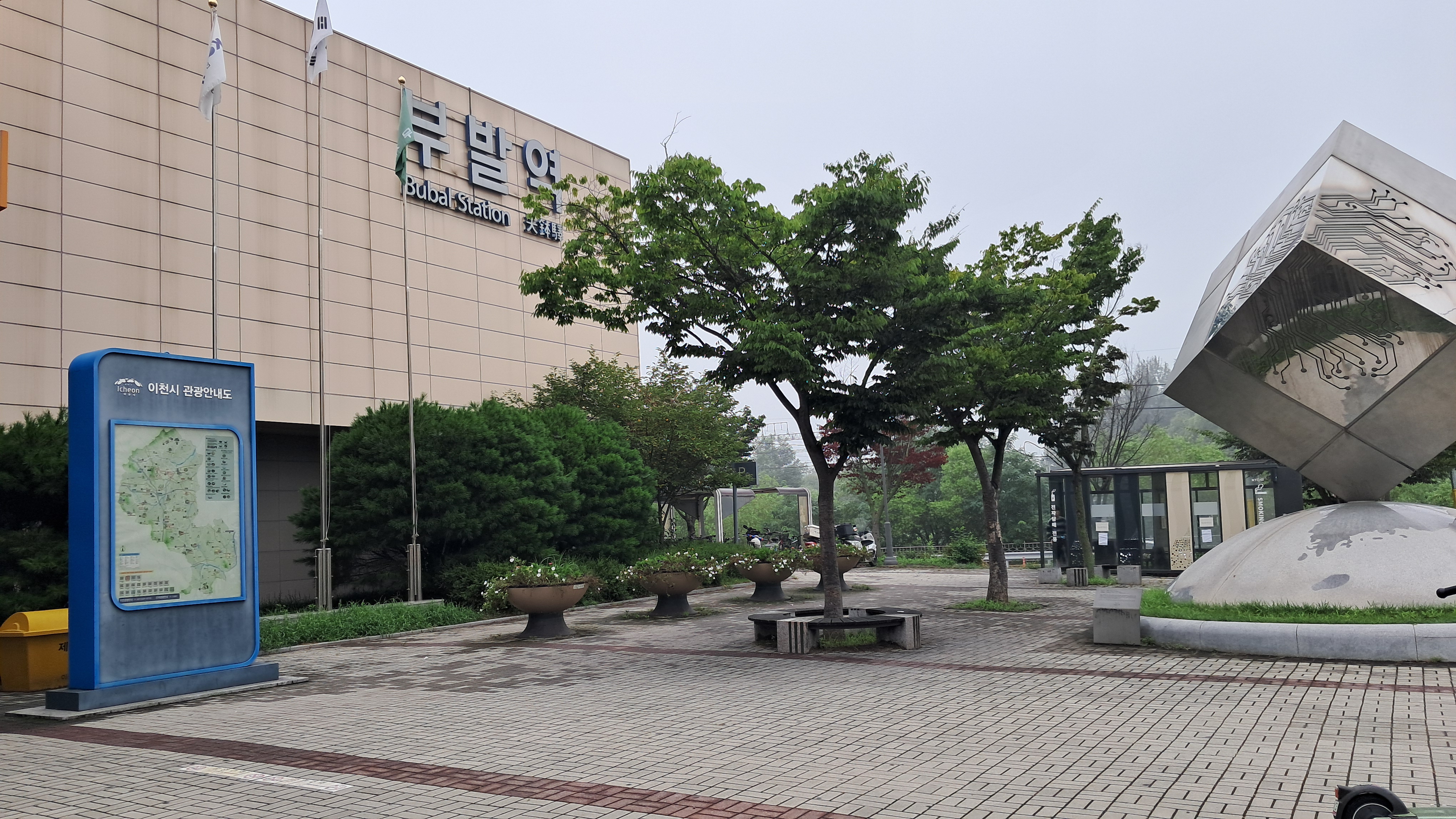 역사 앞에 조형물이 반도체기판 모양이네요.