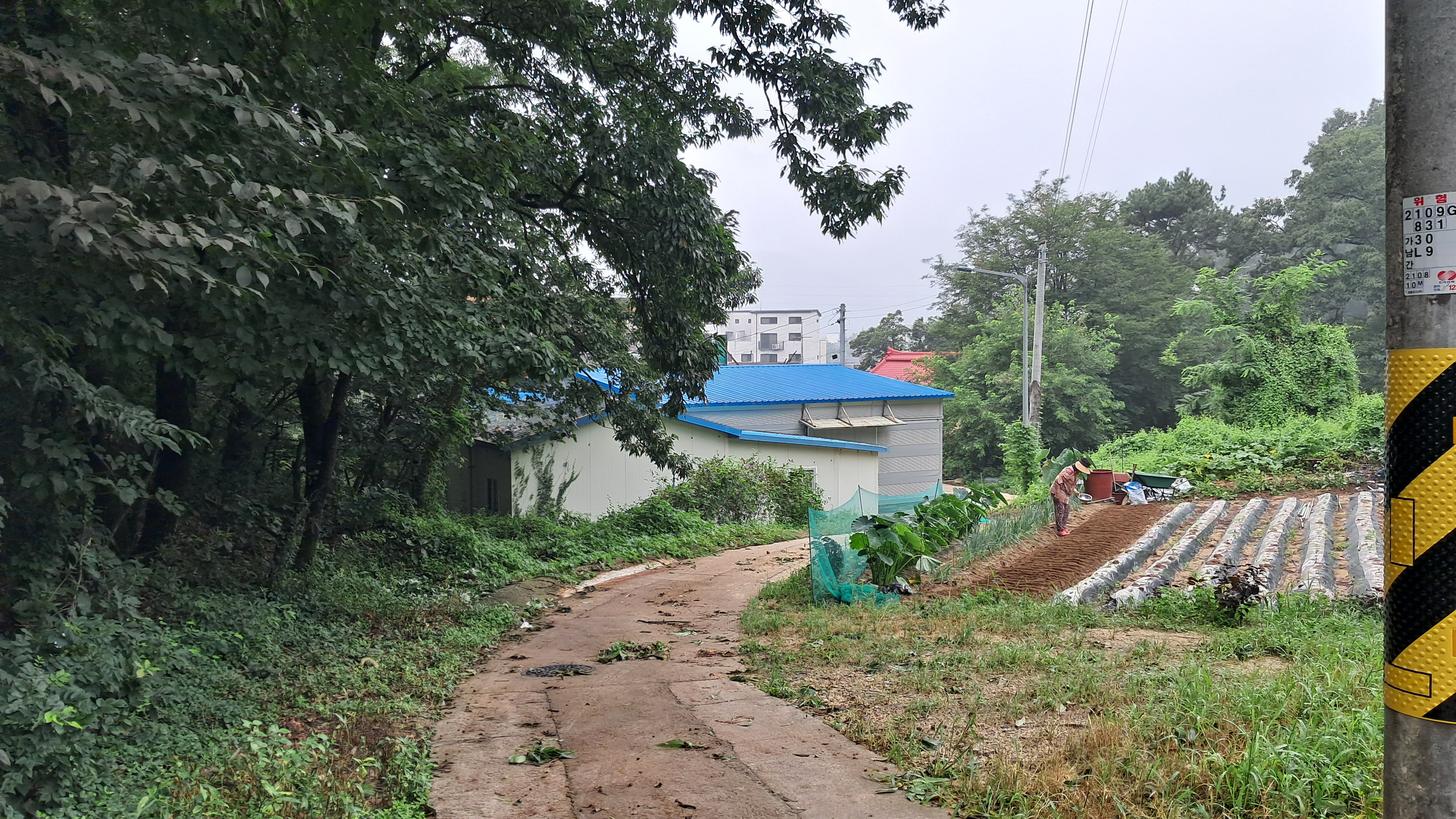 좌측으로 숲이 있고 몇몇 가옥이 있는 길을 따라갑니다.