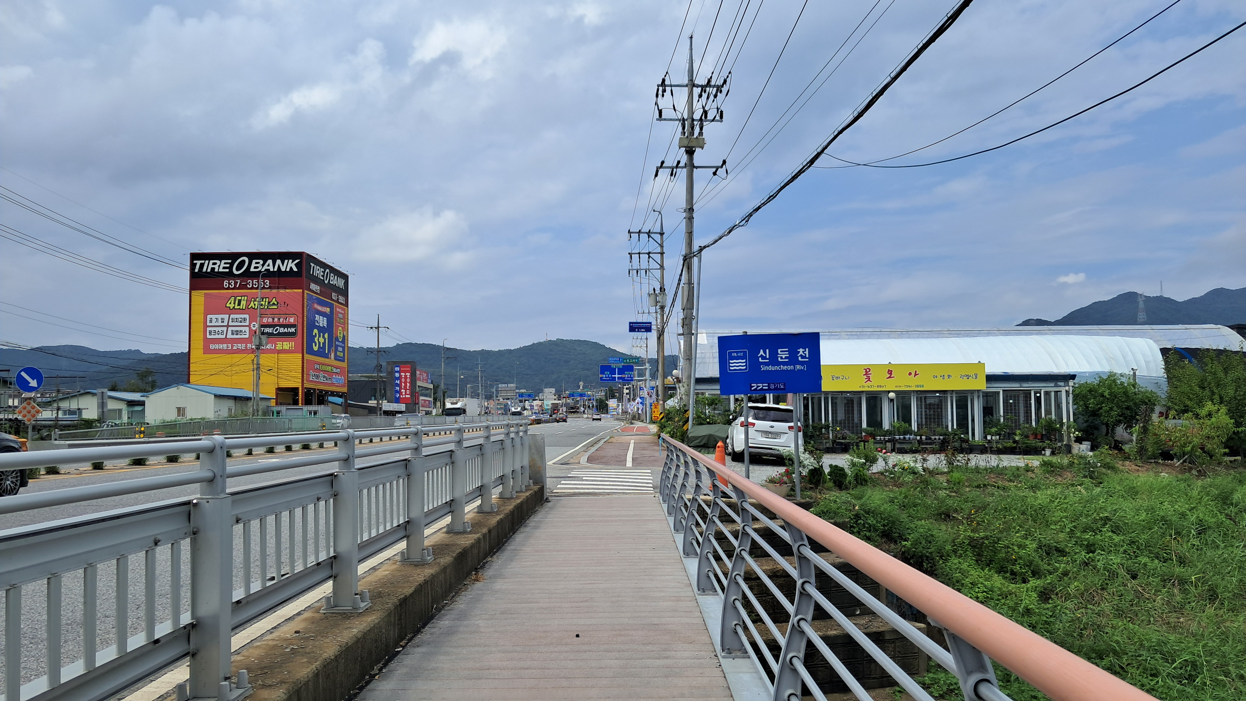 신둔천을 넘는 다리를 건너서 도로를 따라 걸어갑니다.