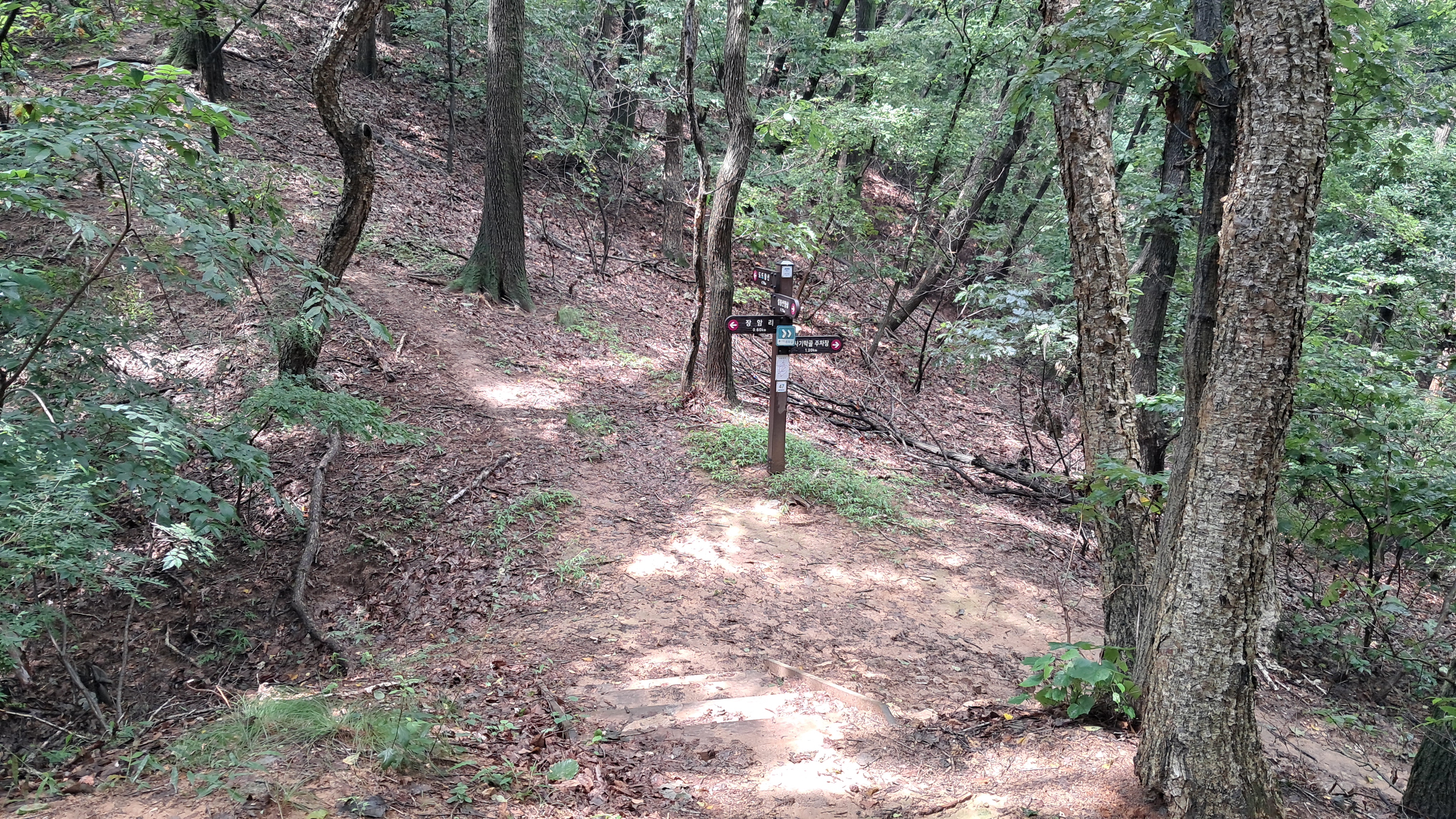 한동안 가파른 산길을 내려가면 사기막골 주차장 방향은 우측을 향합니다.