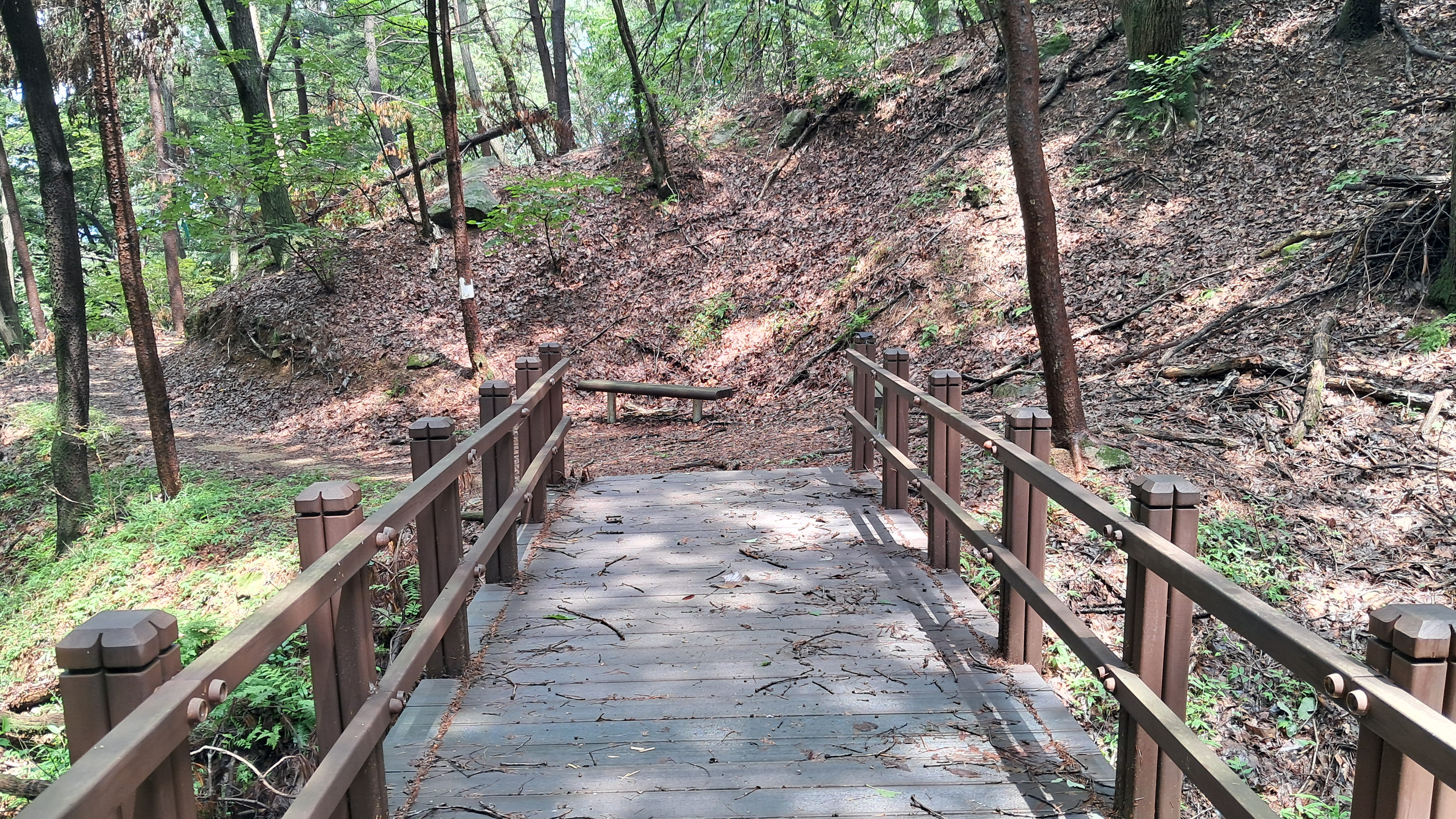 두 갈래의 계곡물이 만나는 곳에 설치된 나무다리를 건넙니다.