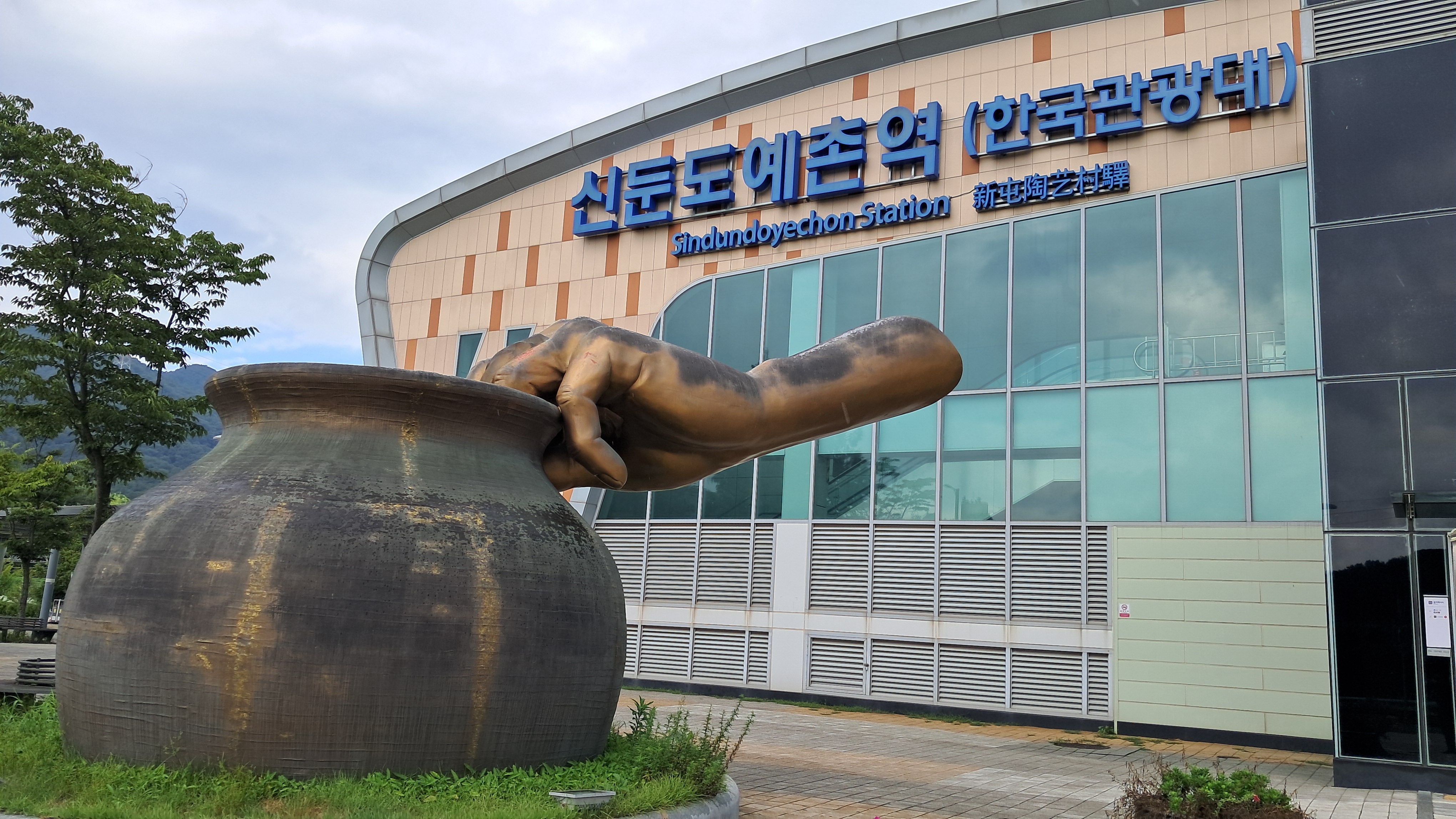 역사 앞에는 도자기를 빚는 모양의 작품이 설치되어 있습니다.