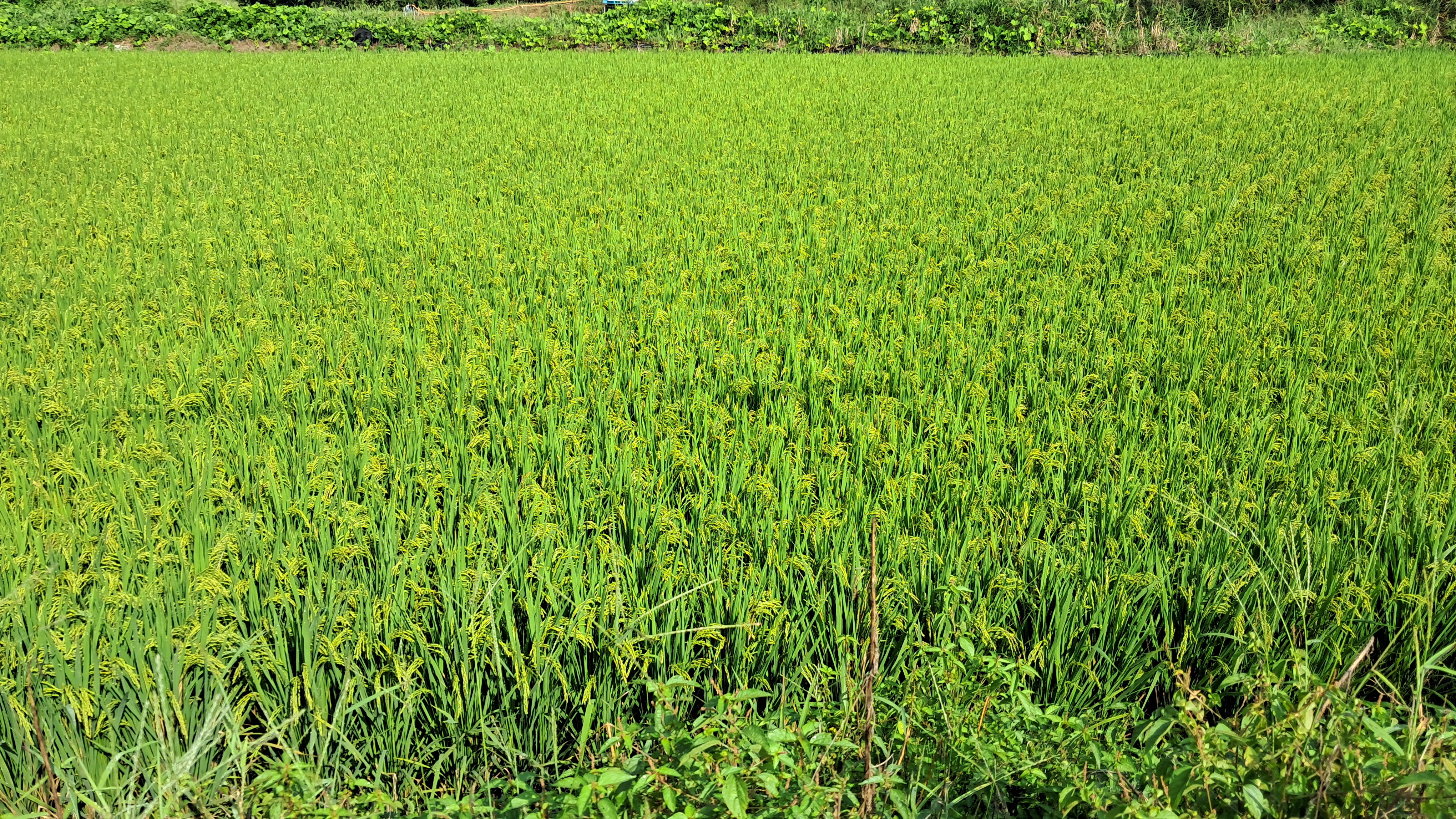 길옆 논에서의 푸른 벼는 알알이 쌀을 주렁주렁 매달고 있습니다.