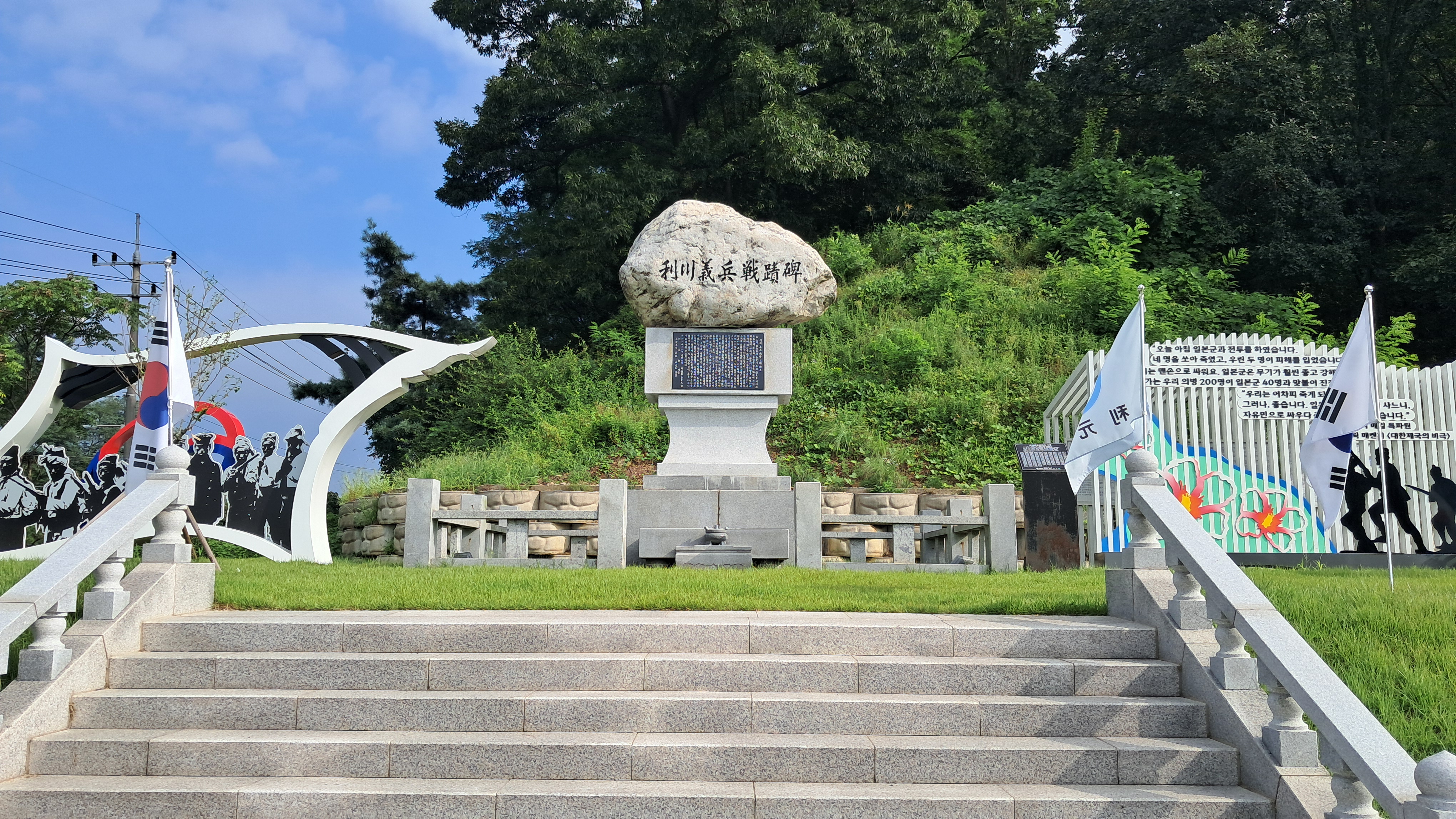 의병 전적비에서 추모의 마음을 표하고 우측 조형물의 글귀를 읽습니다.