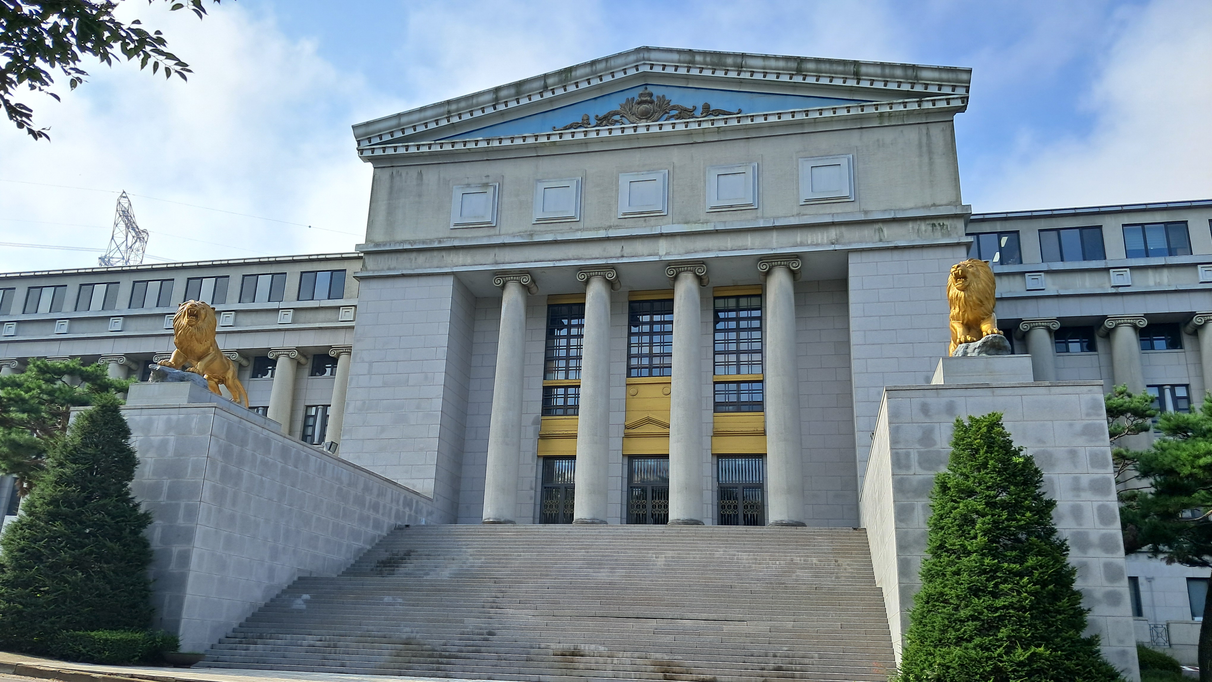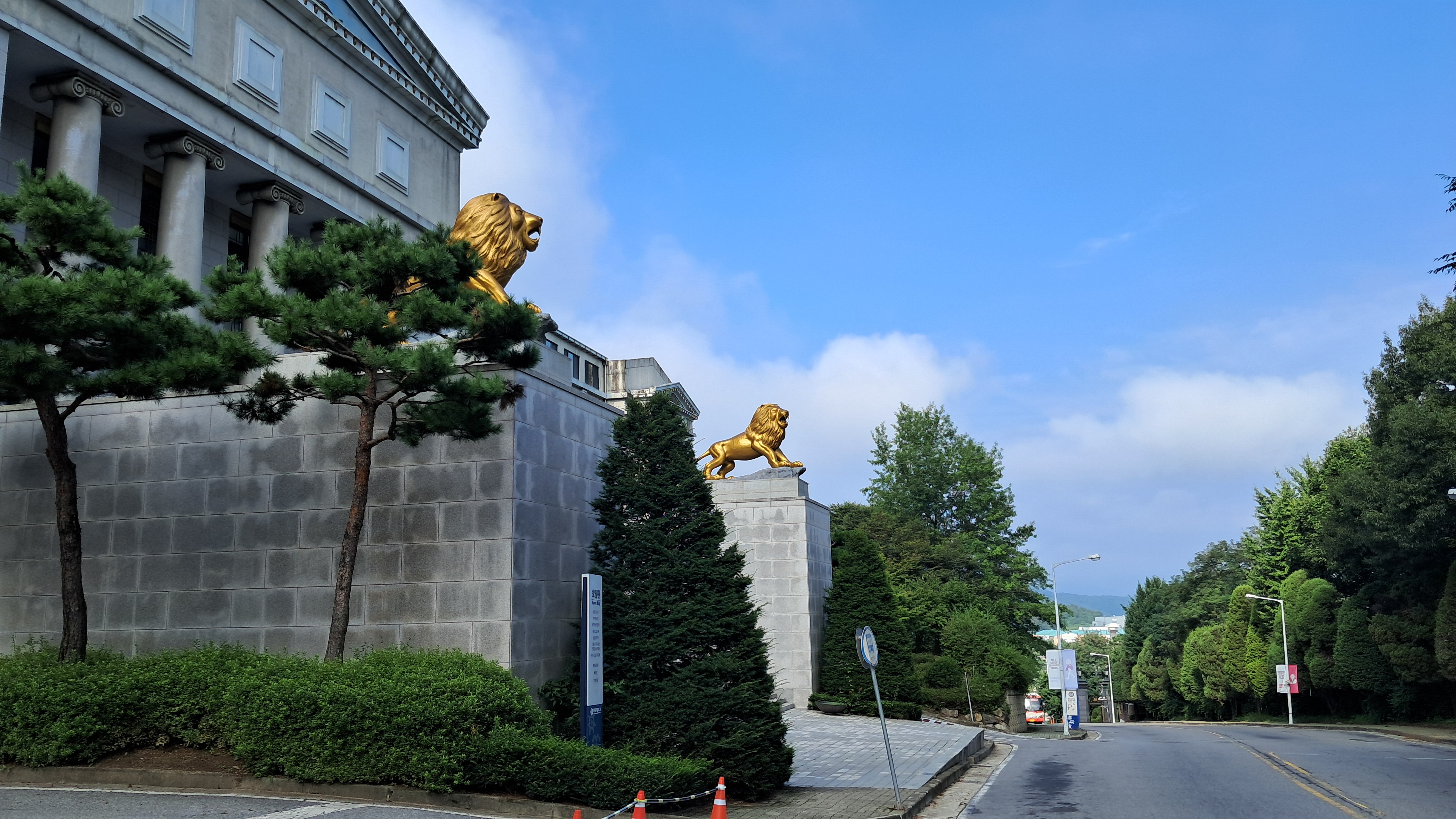 멋진 황금사자 두 마리가 신전형태의 건물 앞을 지키고 있습니다.