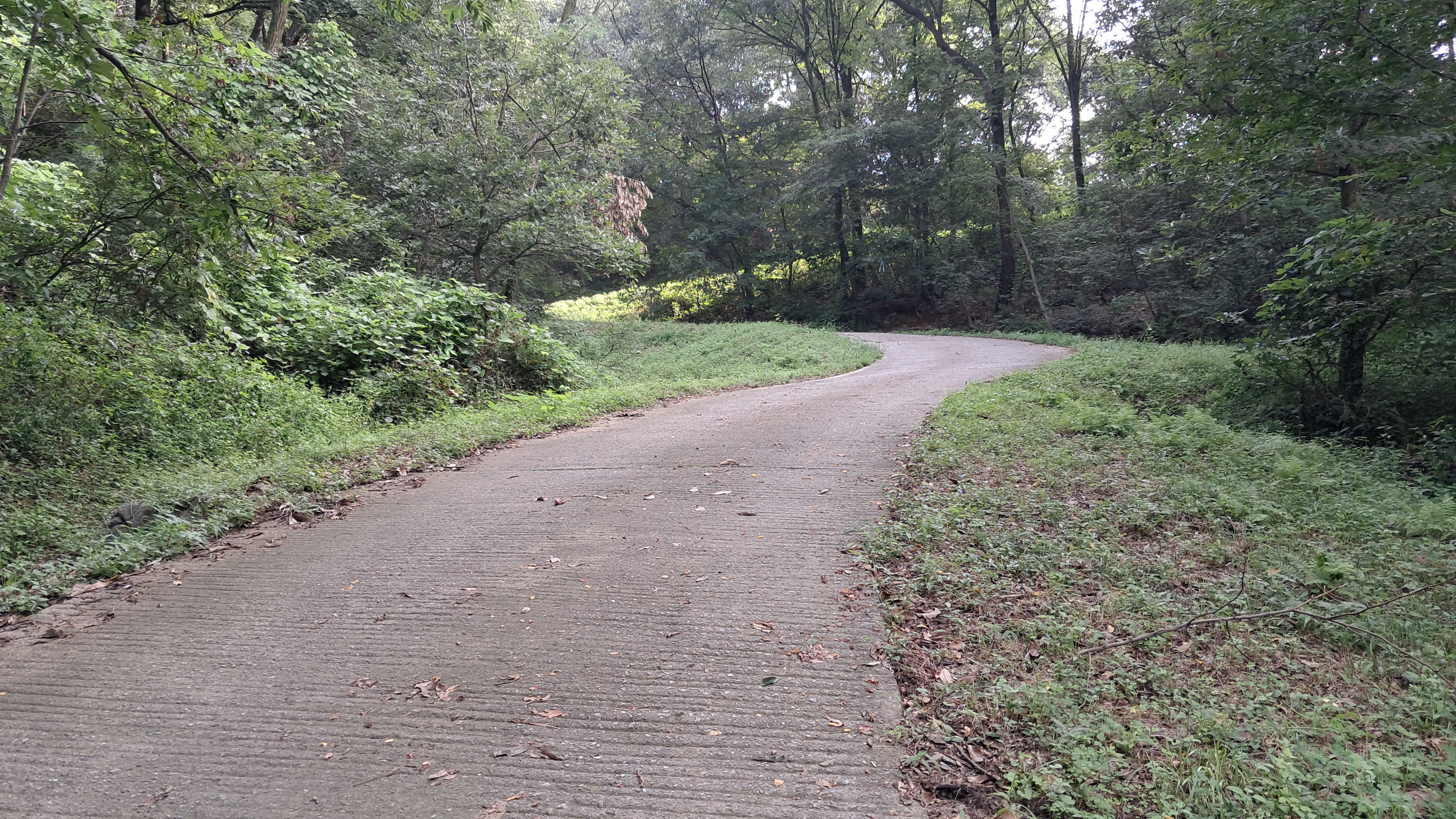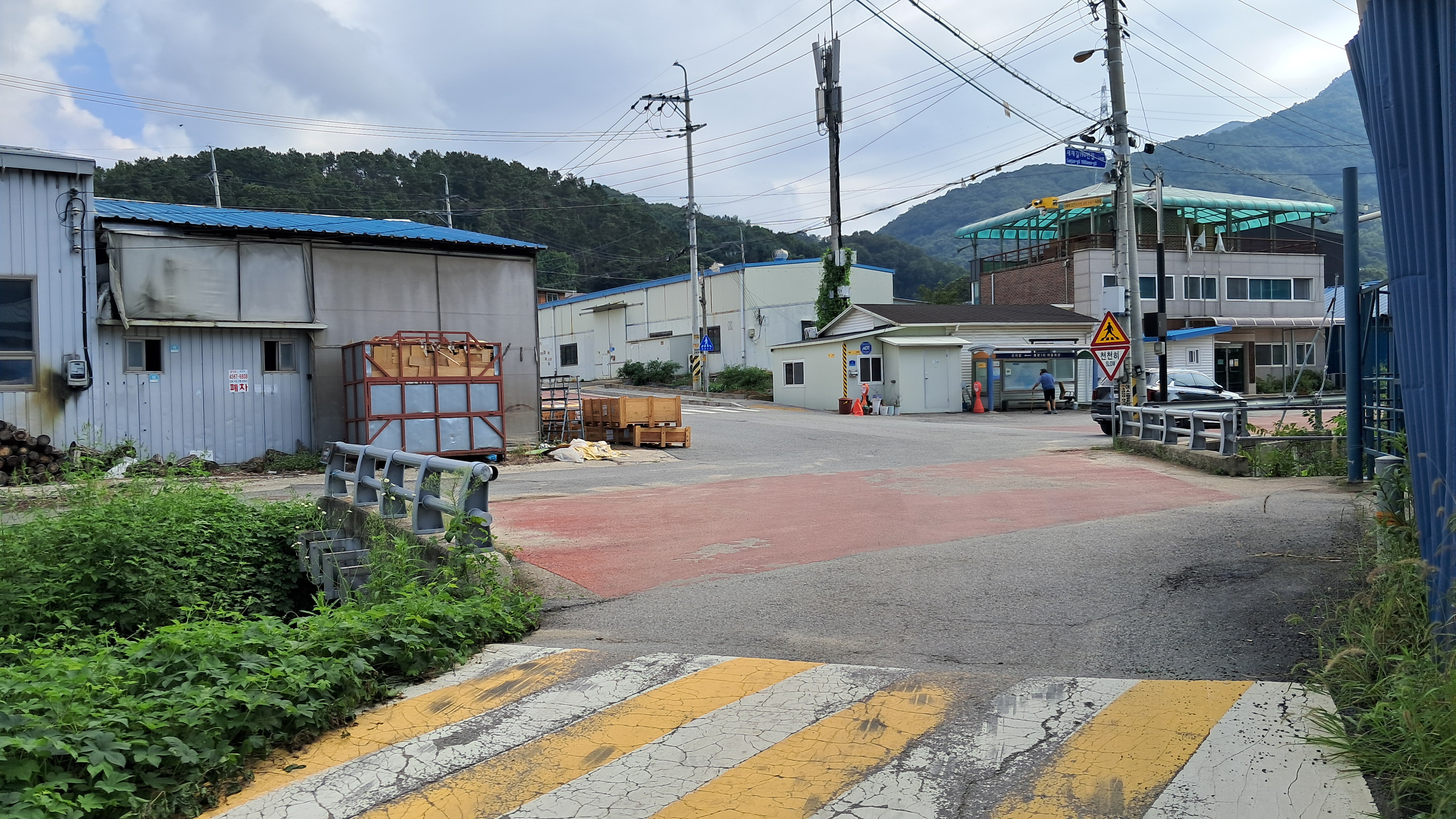 고갯길을 올라가서 공장 지대를 지나갑니다.