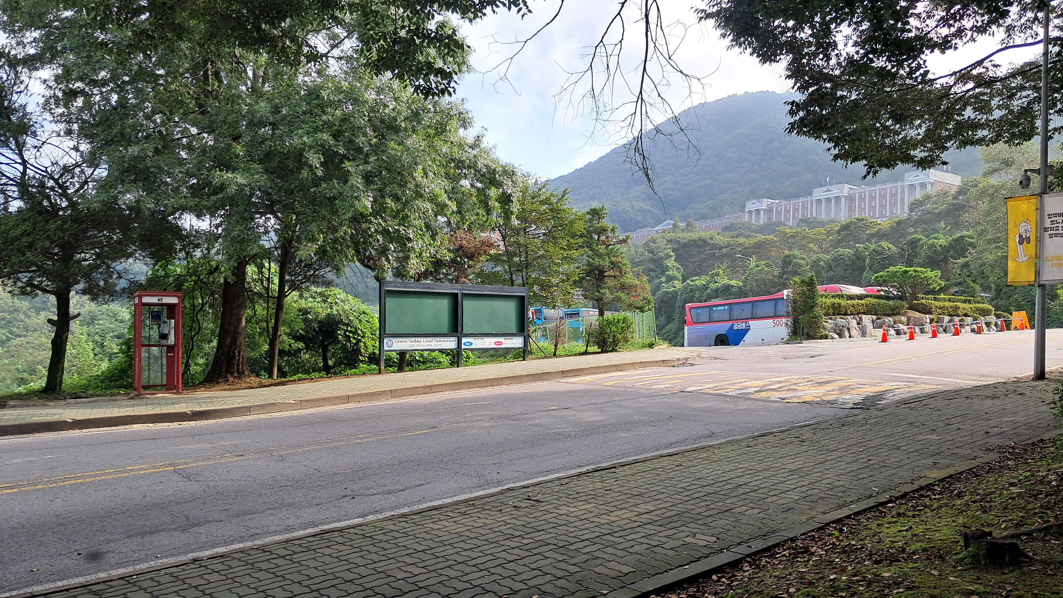 종점의 버스 정거장에는 어르신 한분이 자리를 잡고 있습니다.