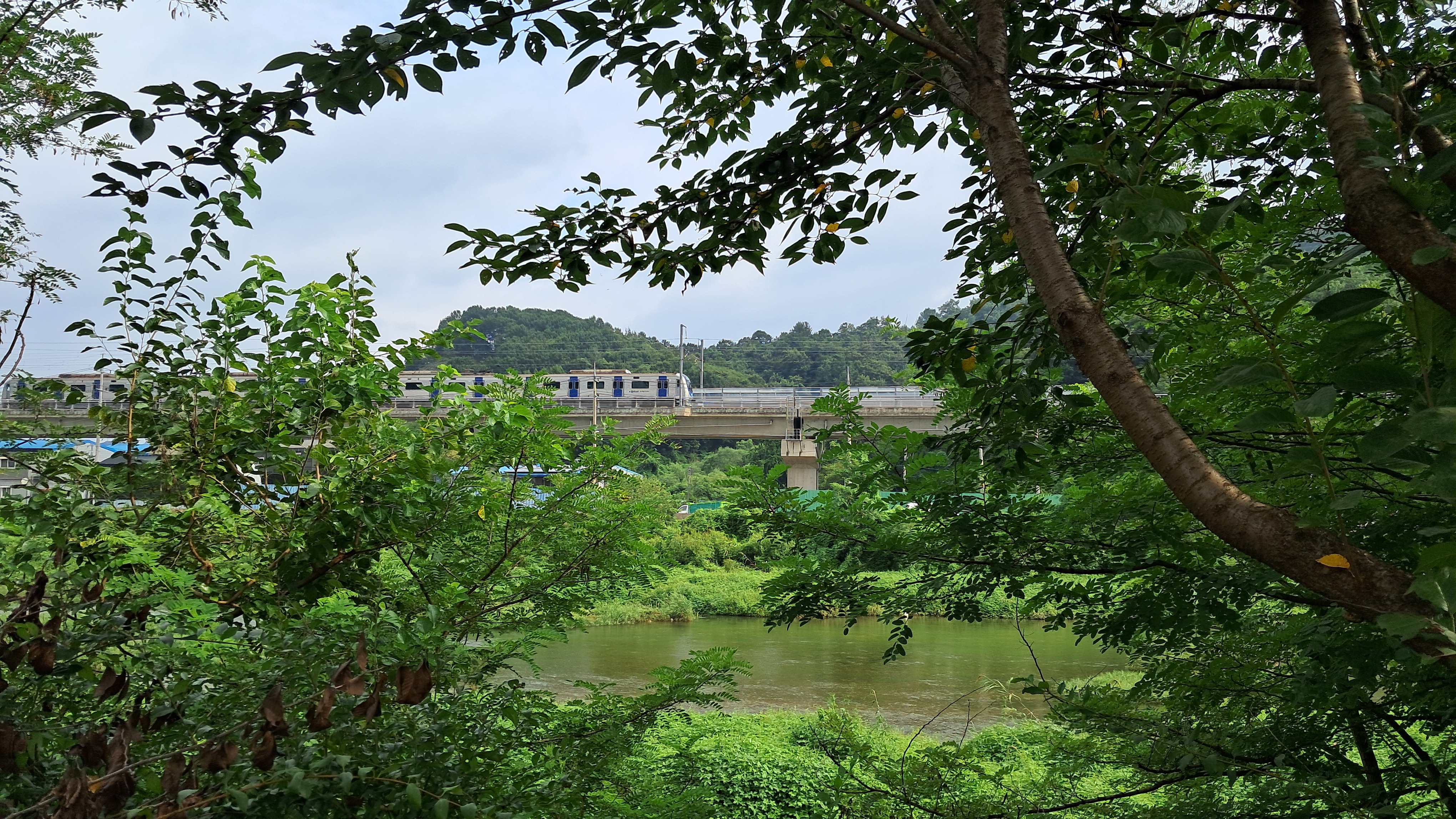 초월역에서 다음역인 경기광주역으로 향하는 방향은 산이 가로막고 있고 하천은 산을 돌아 광주시내로 향합니다.
