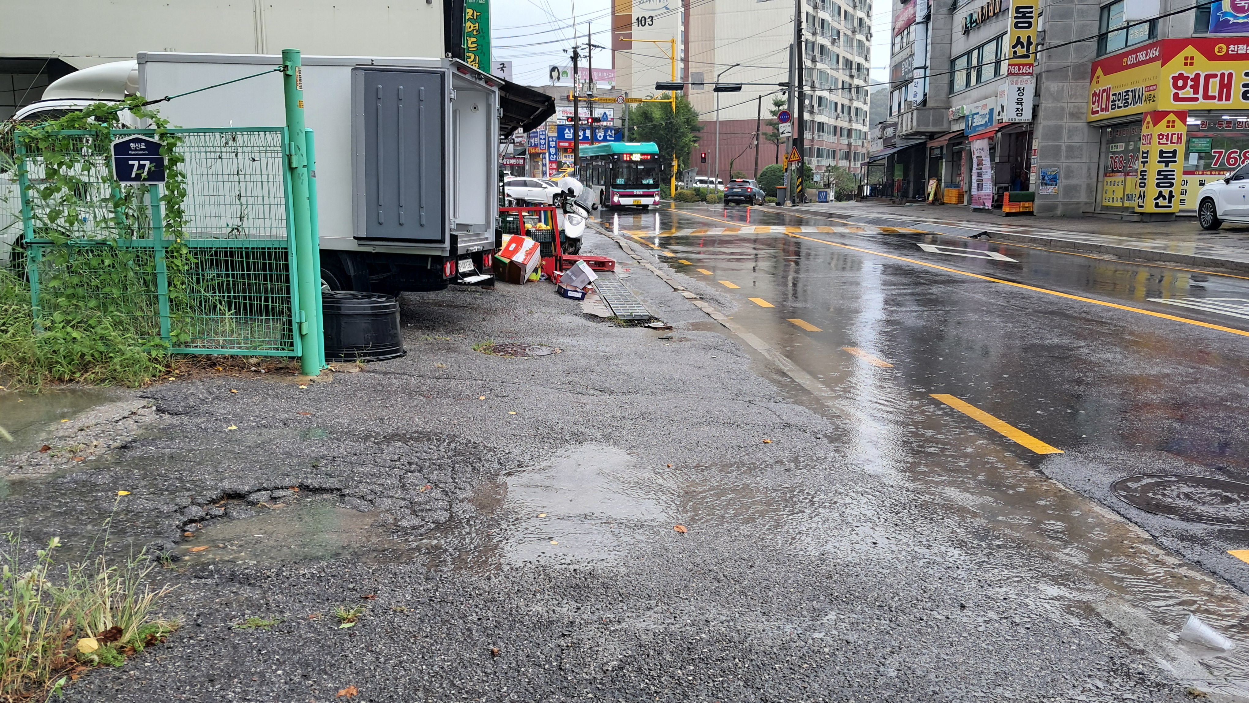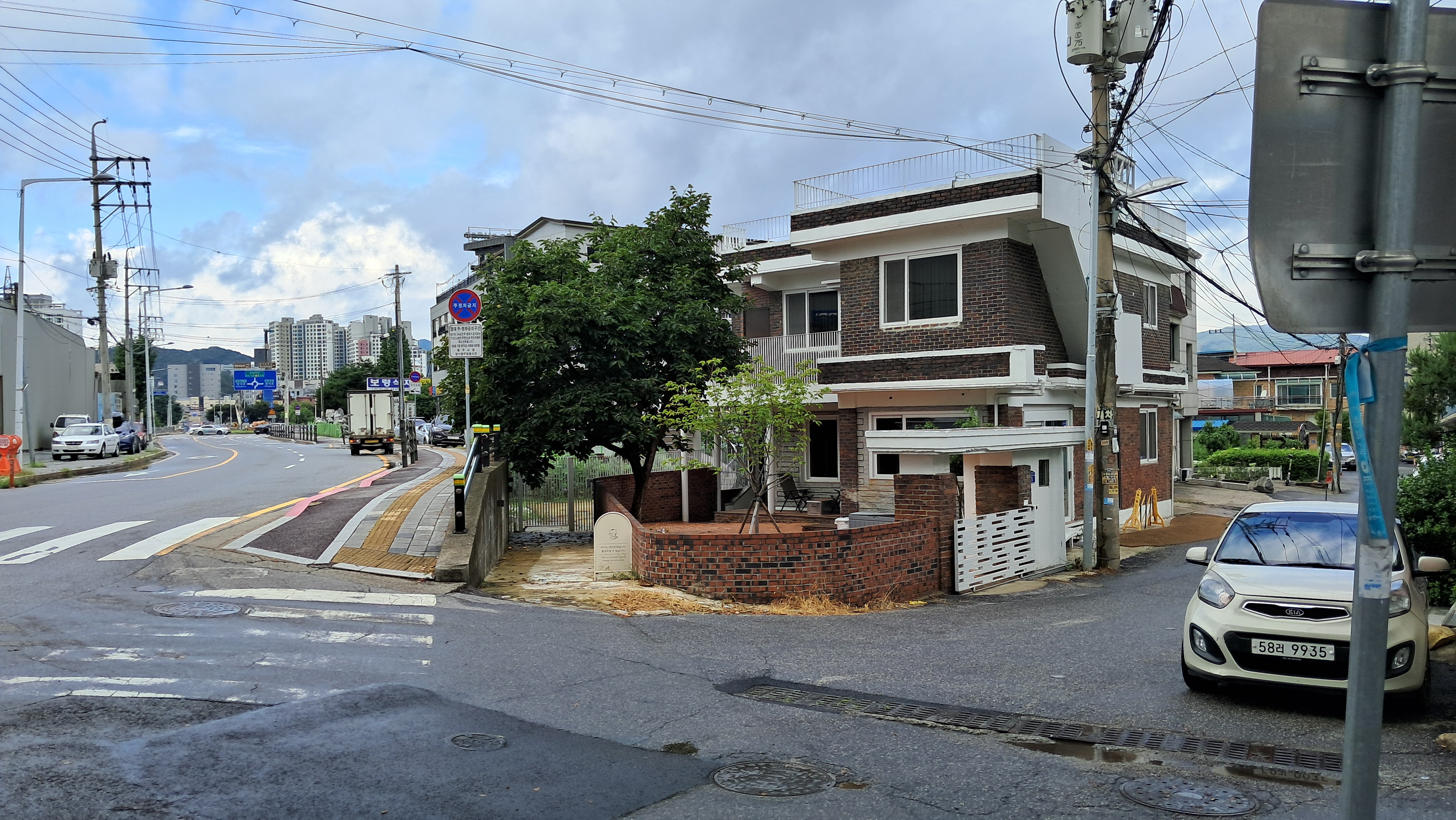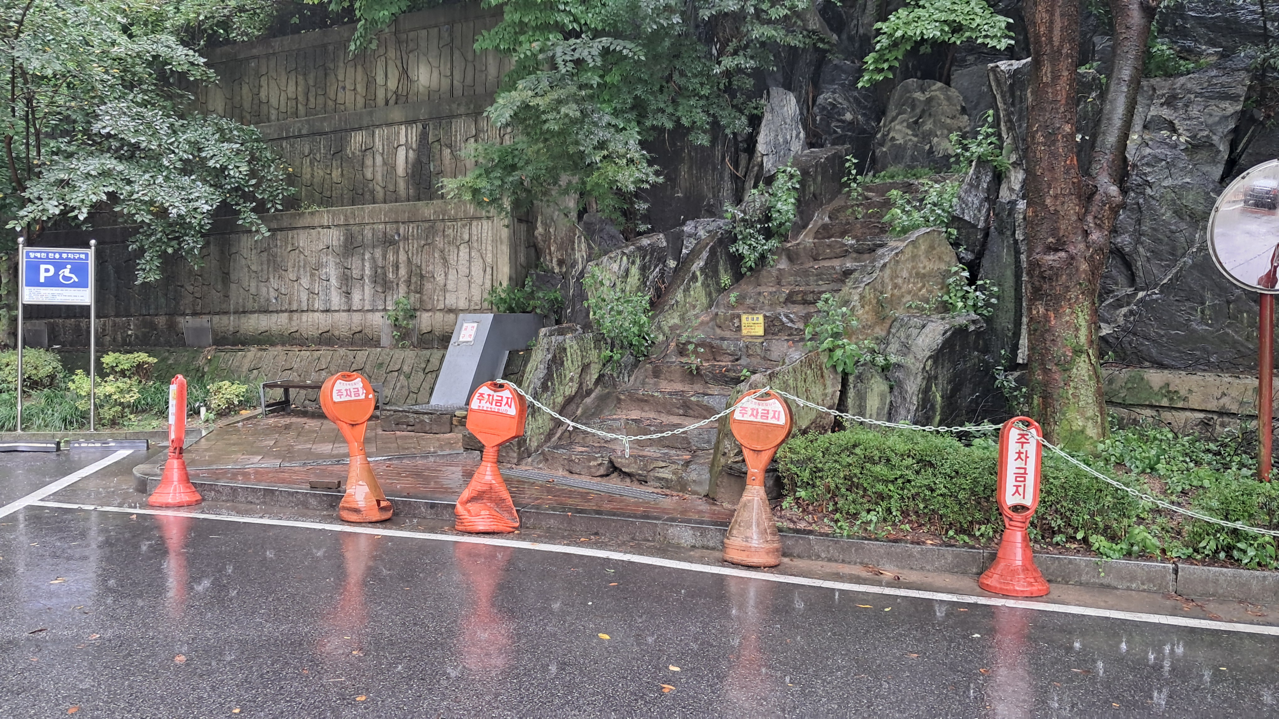 쏟아지는 비를 맞으며 걷다 보니 방향을 잡기도 어렵고 안내띠도 보이지 않아 아파트 단지 깊숙한 곳까지 가버렸습니다.