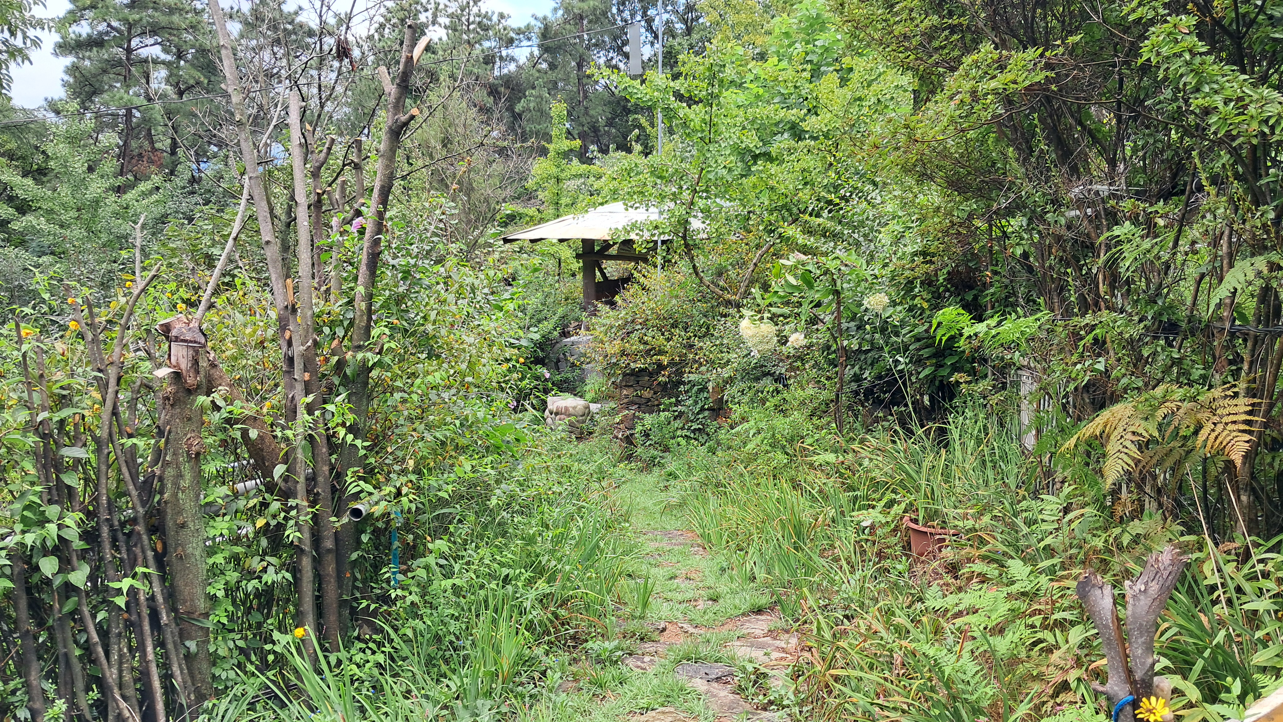 산길의 끝에 건물이 보이기 시작합니다.