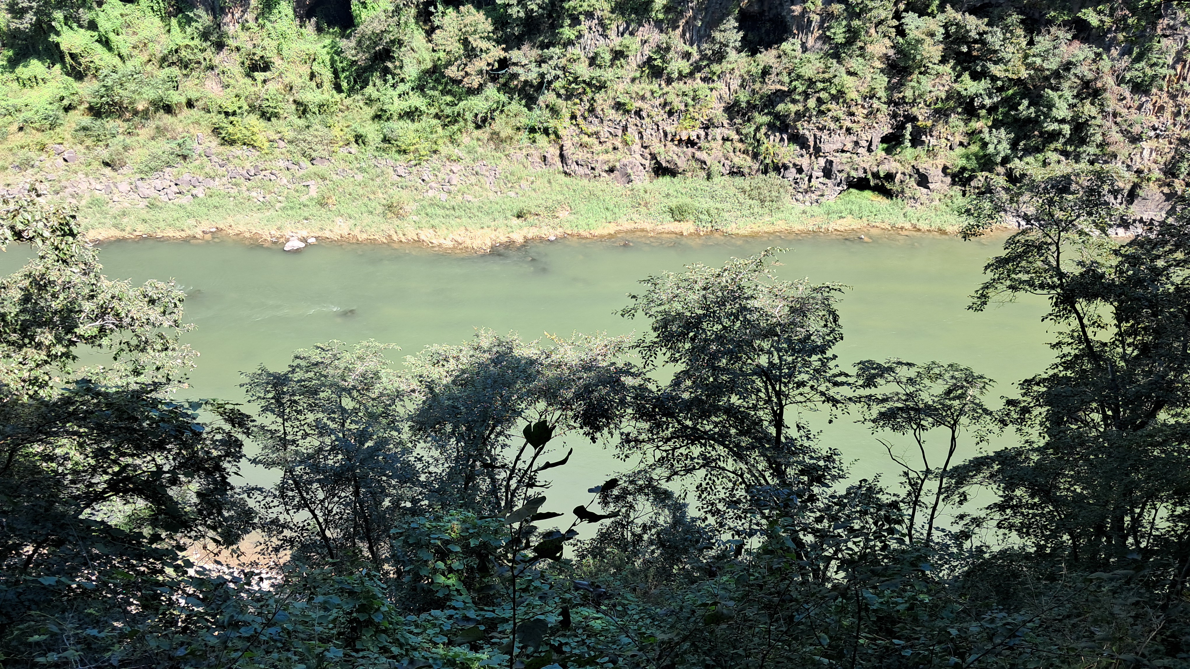 태양 아래 멍우리 협곡으로 빛나는 강물이 힘찬 소리와 함께 흘러들어 갑니다.
