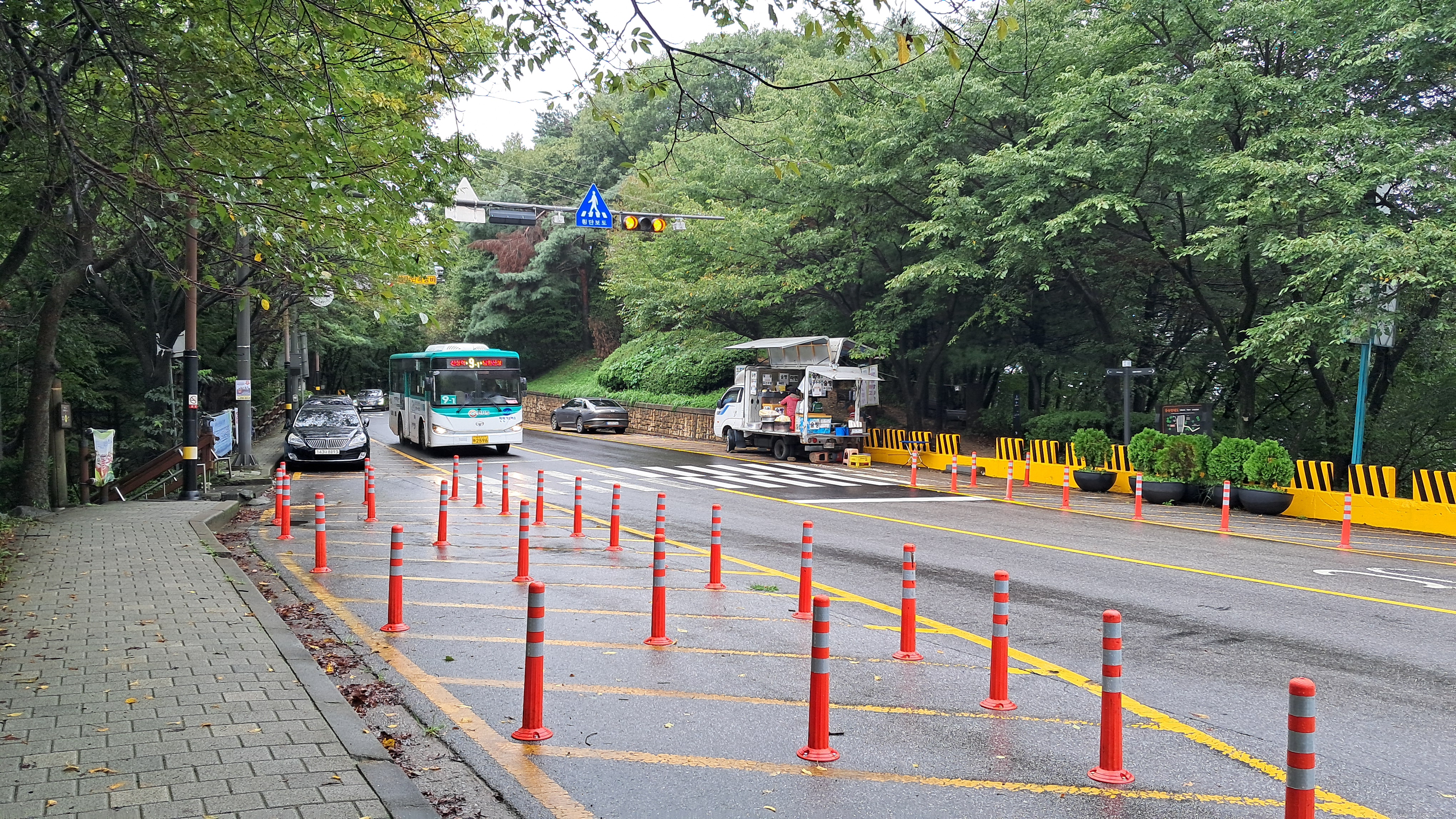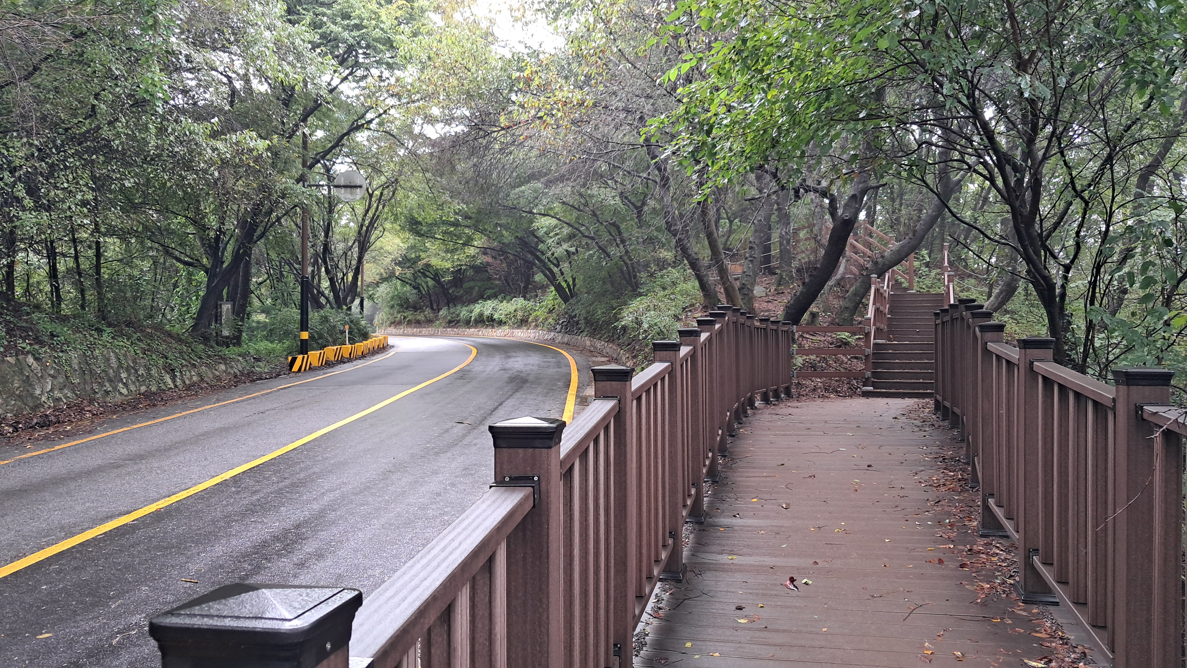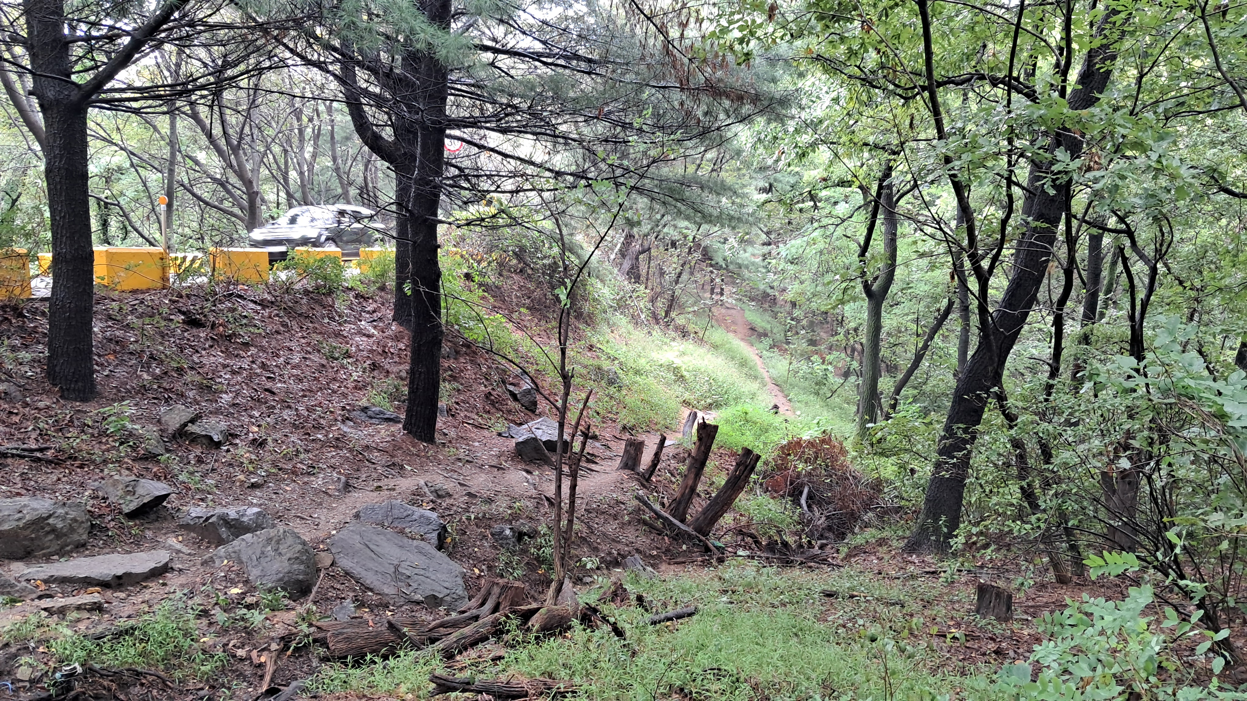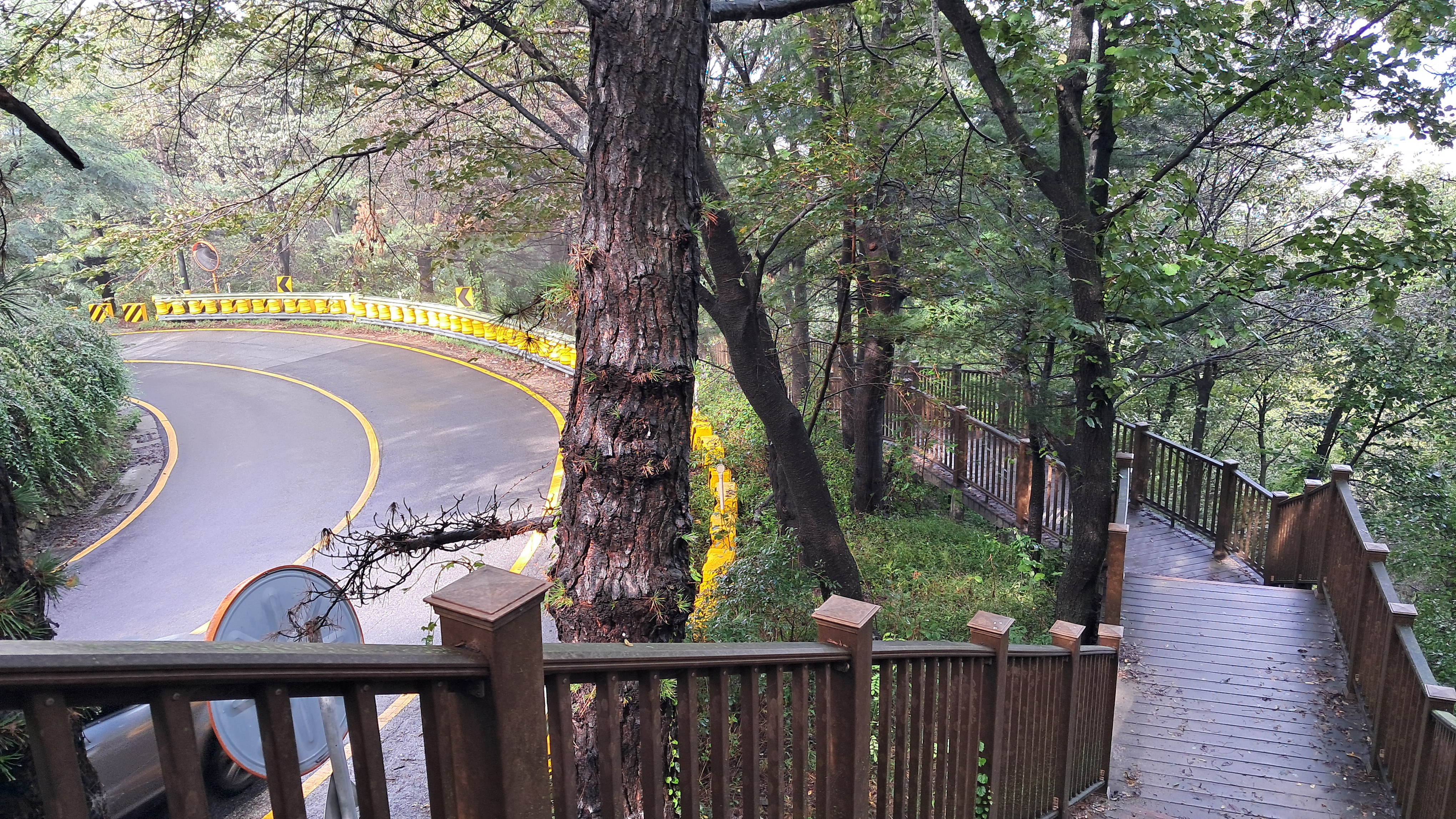 등산로는 나무계단으로 만들어져 있고 가파를 도로를 오르내리는 자동차들을 볼 수 있습니다.