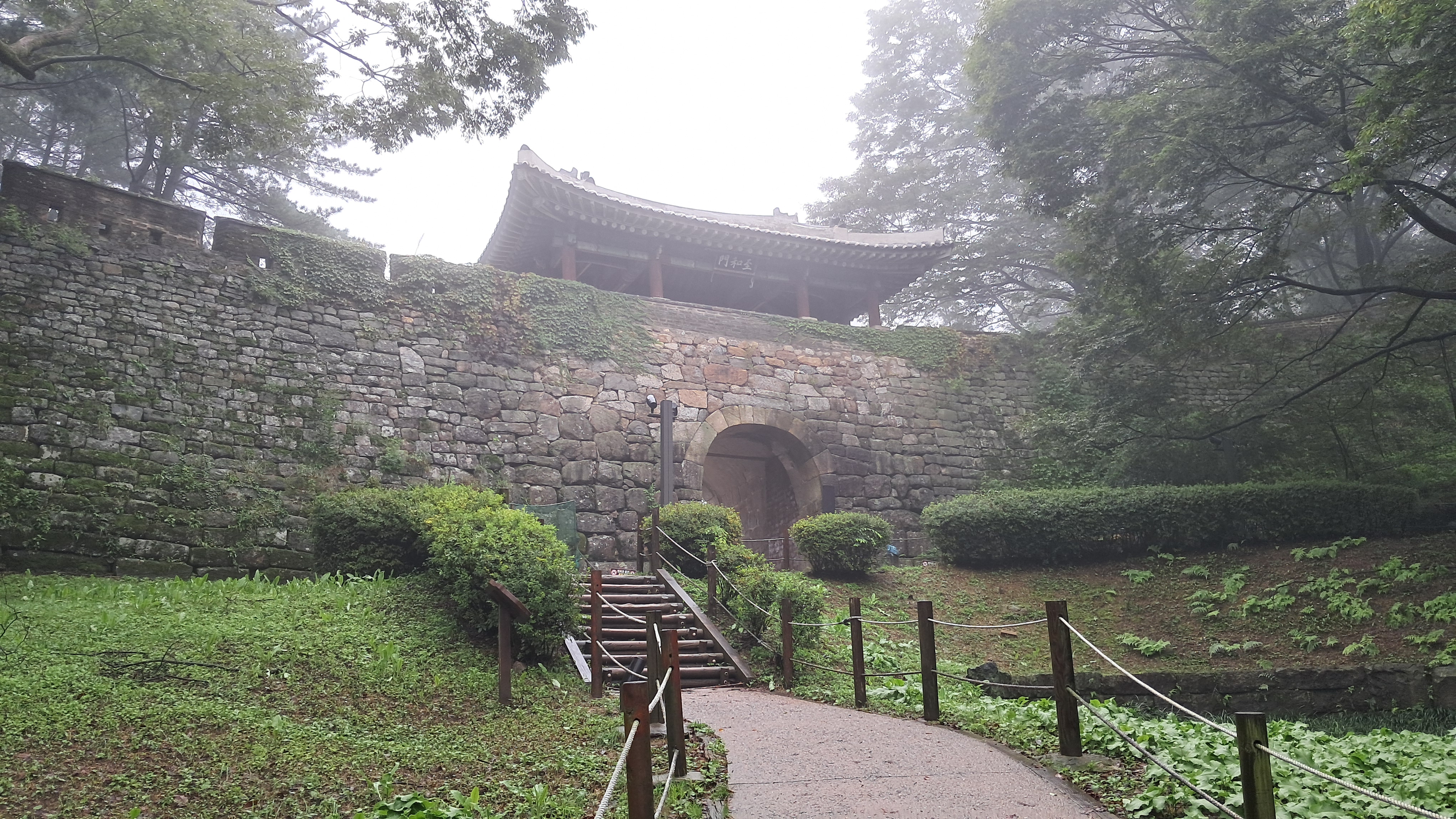 구름이 휩싸인 성곽의 대문의 풍경도 운치 있고 멋집니다.
