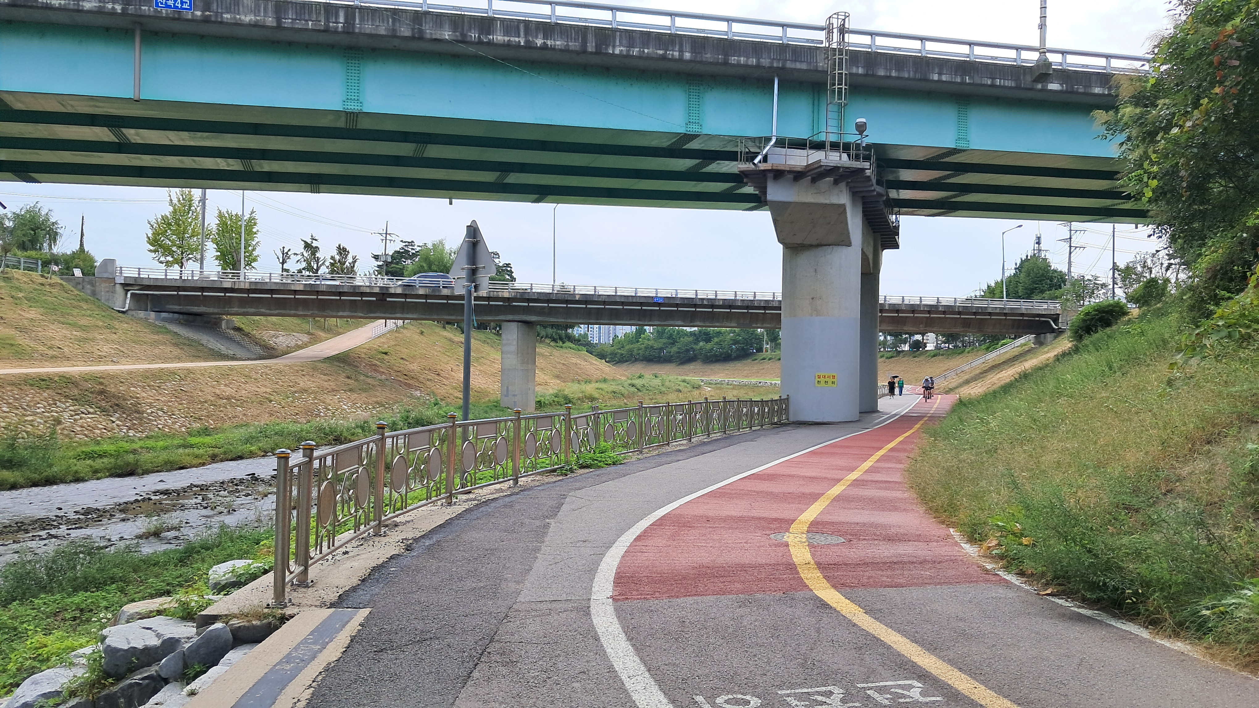 산곡천을 조금 걸어가다가 산곡 2교 앞에서 재방 위로 올라옵니다.