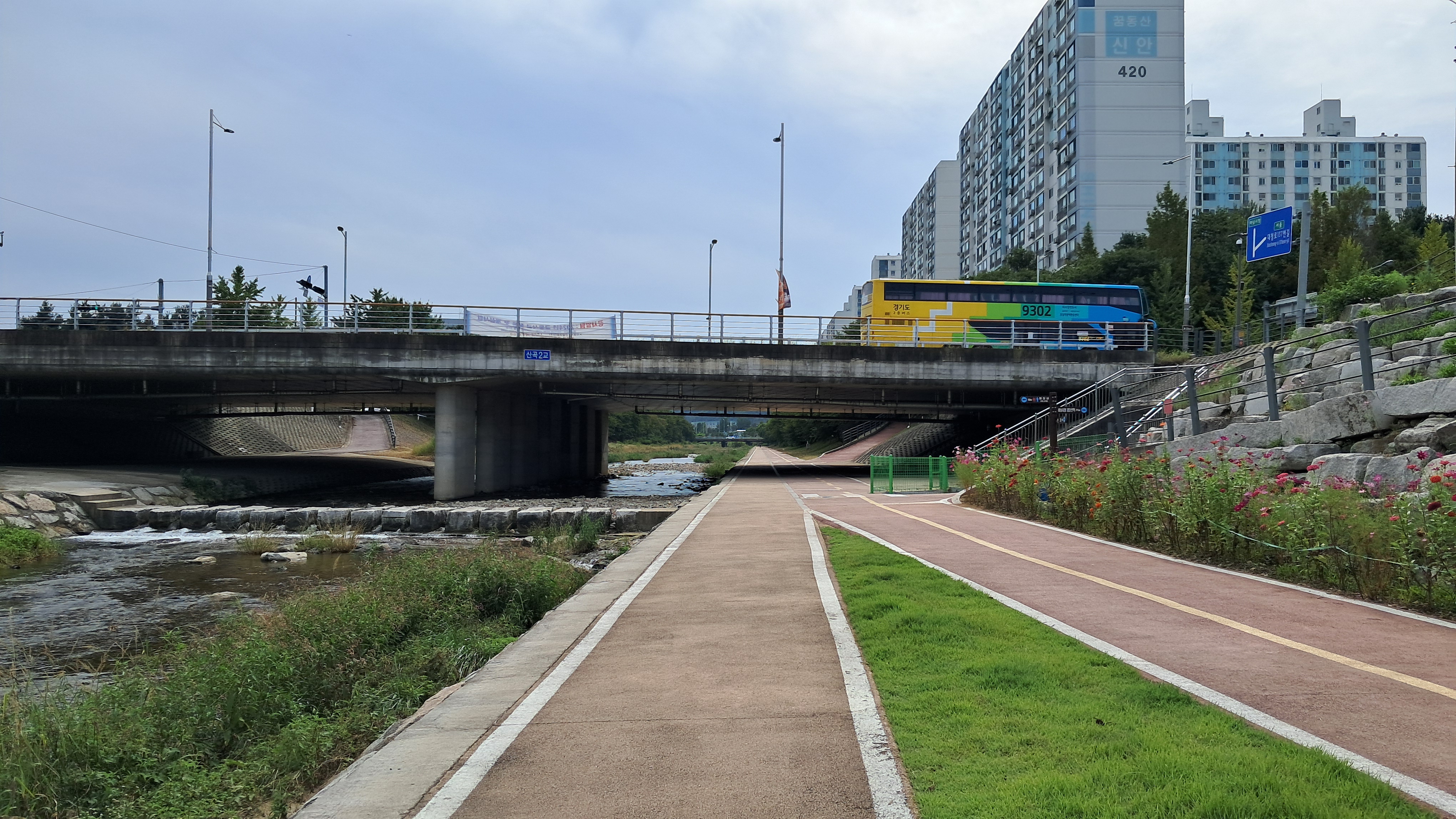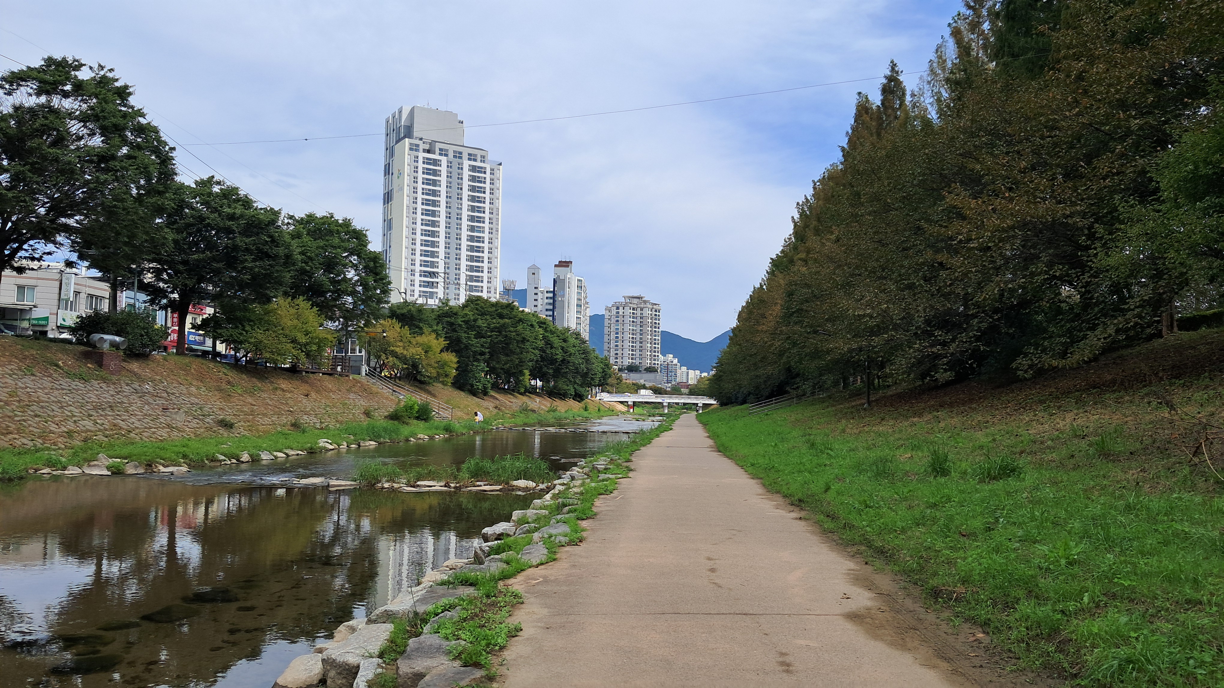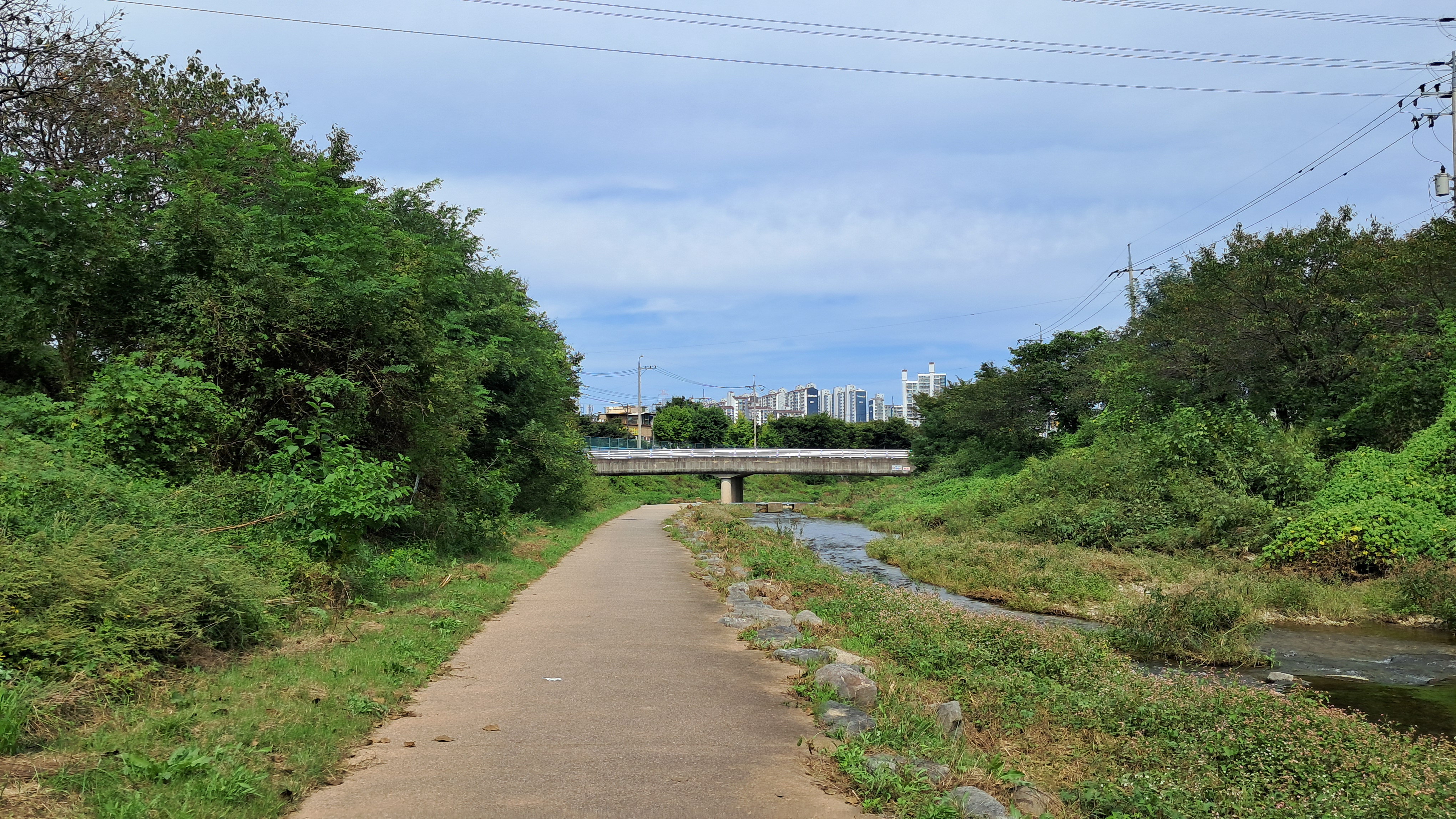 아파트 단지 사이의 하천길을 따라 계속 걸어갑니다.