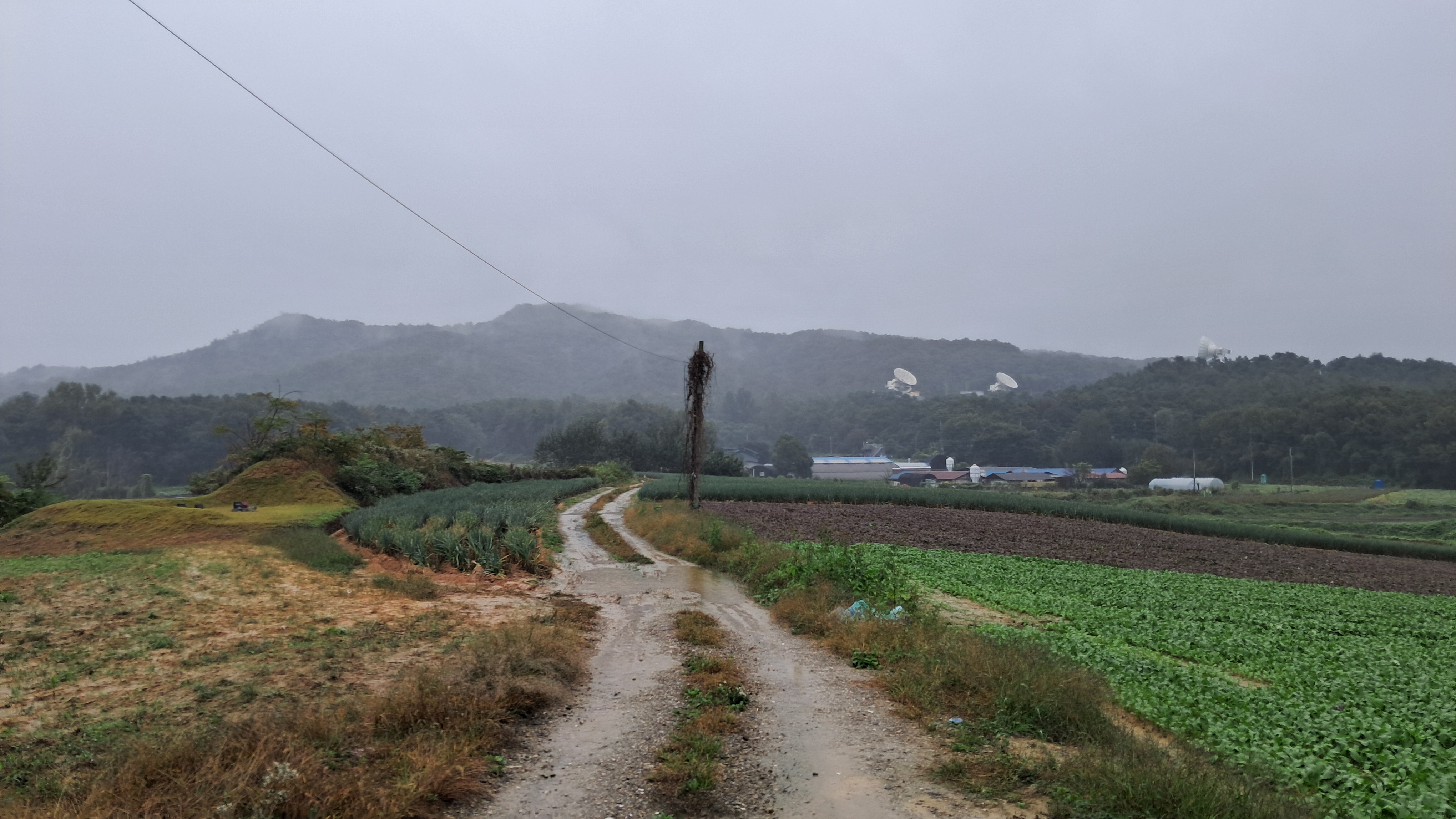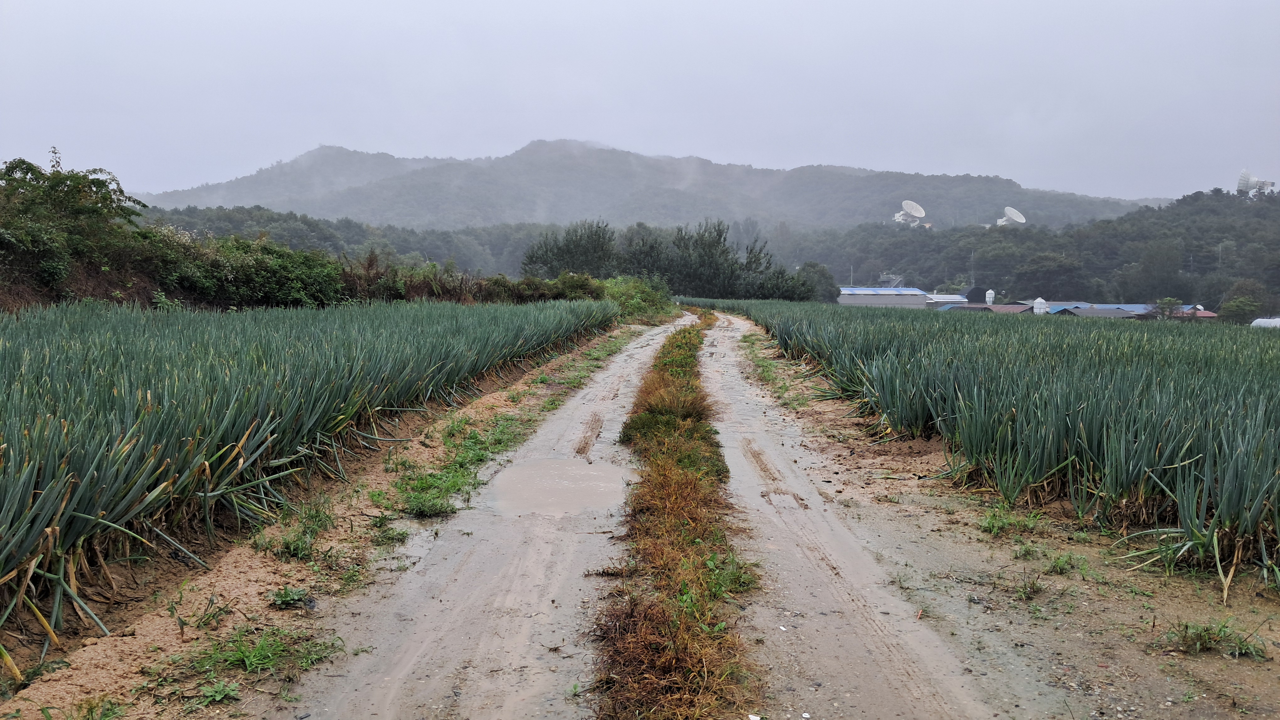 양쪽의 파밭에서 풍겨오는 파냄새가 가득하고 몽환적으로 보이는 눈앞의 산이 있습니다.