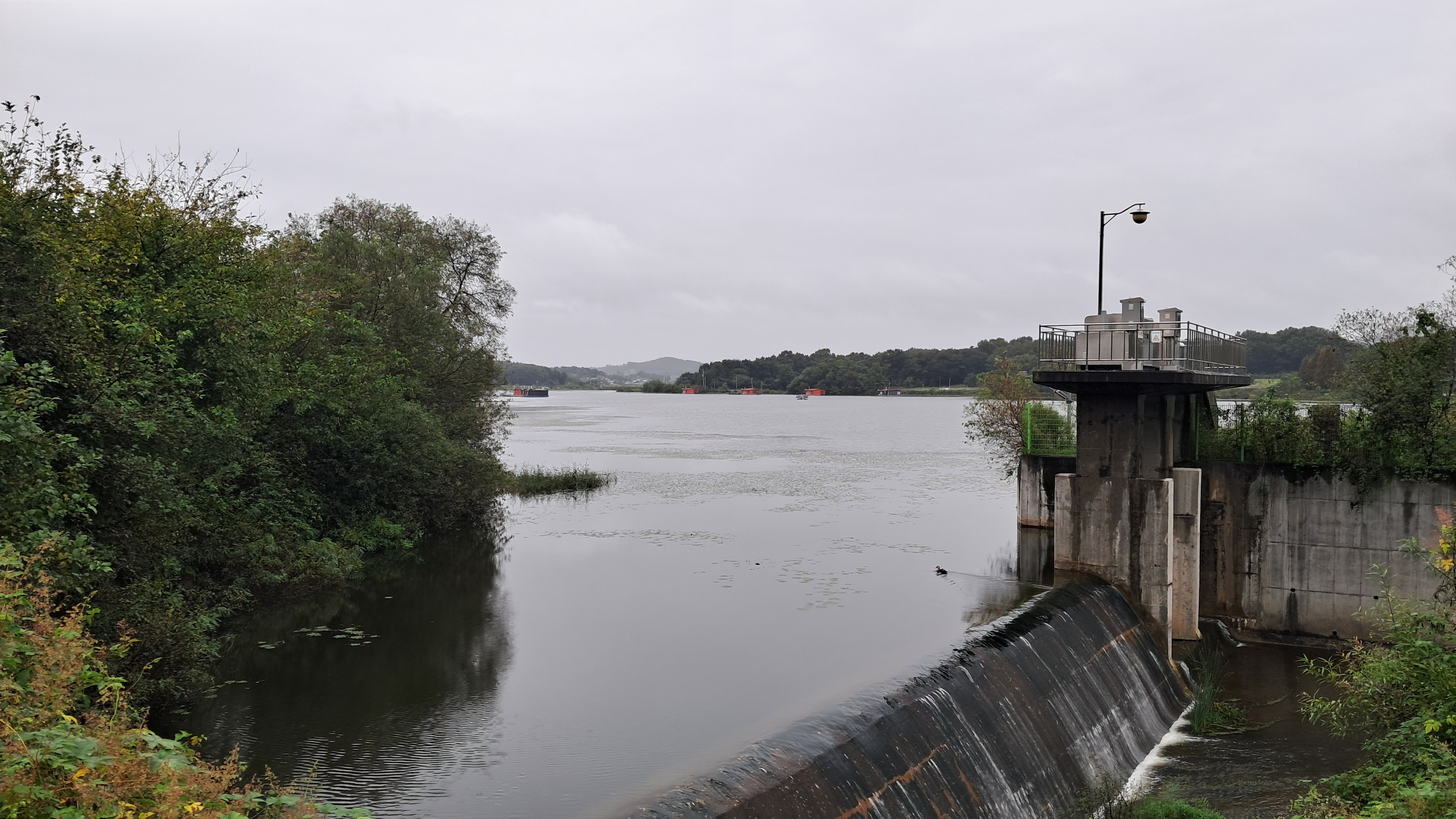 회색 구름에 호수가 회색빛으로 드리워집니다.