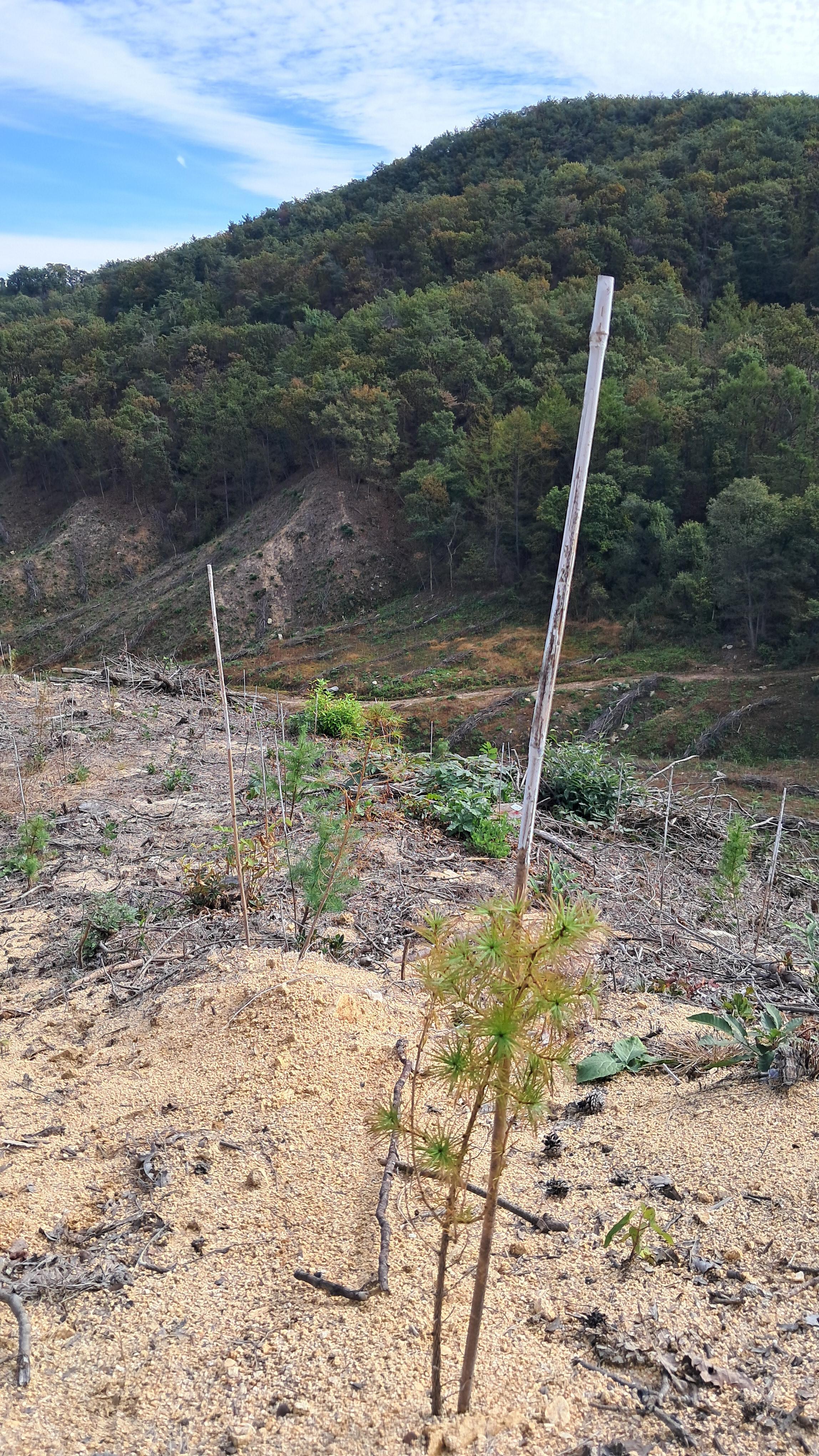 가늘고 작은 나무들이 헐벗은 산의 비탈에 심어져 있습니다.