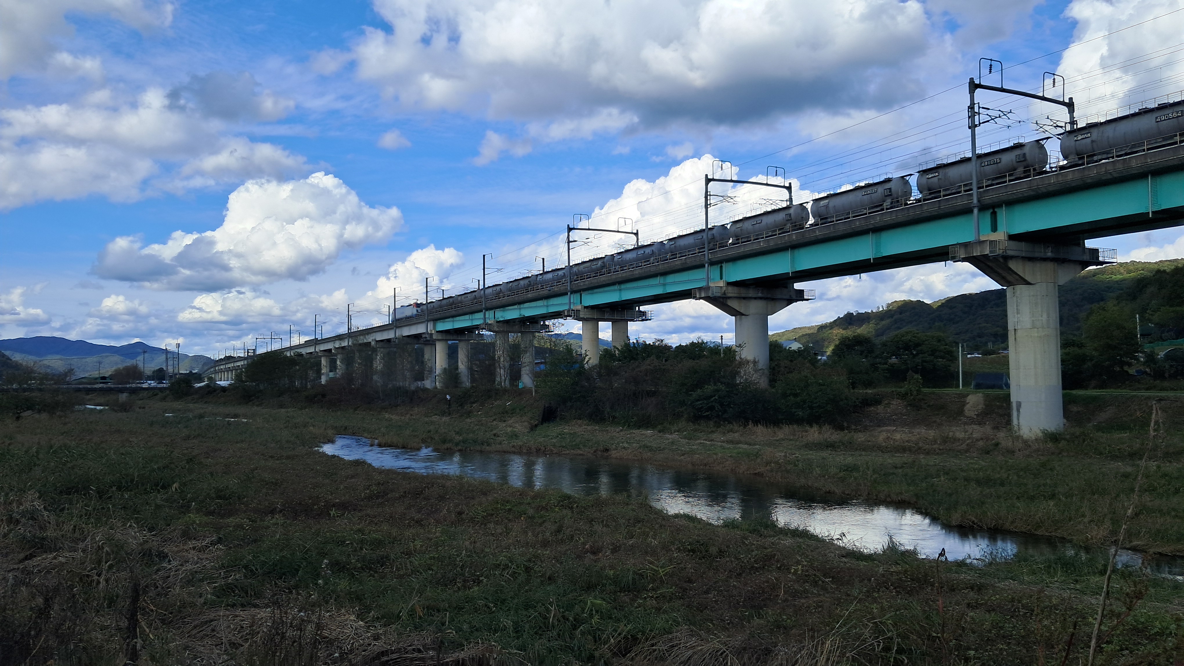하천과 그 너머의 중앙선 선로와 함께 갑니다.