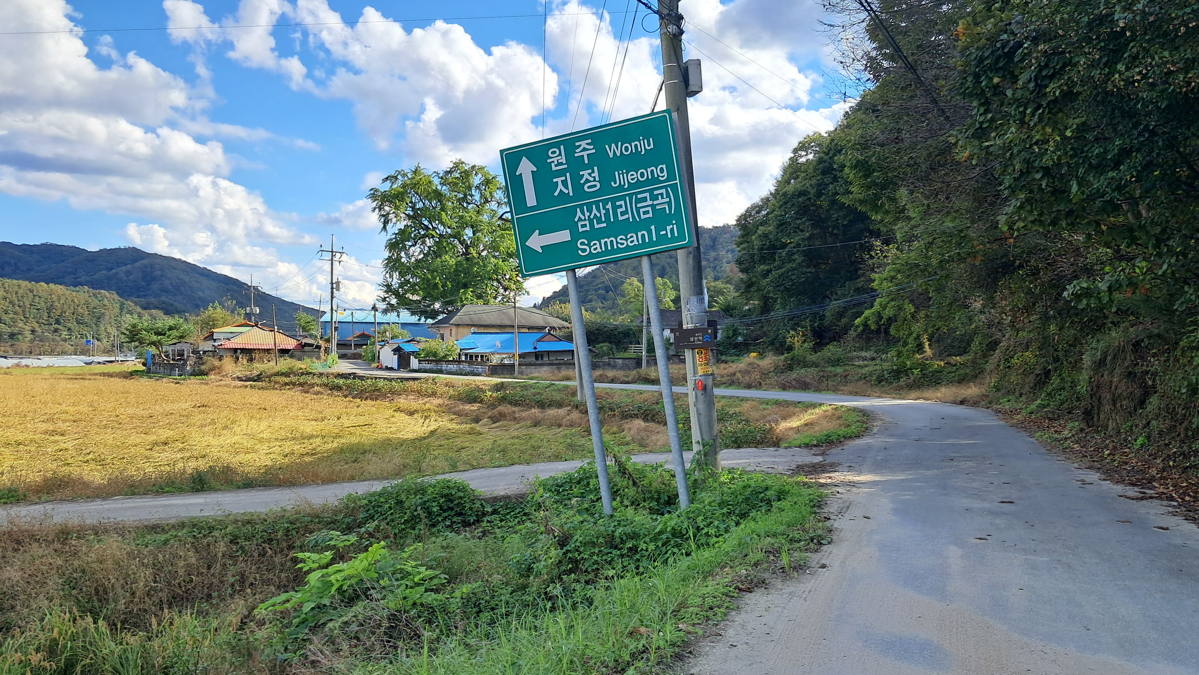 기울어진 원주 방면의 도로표지판이 경기도의 경계가 가까워졌음을 더욱 실감 나게 합니다.