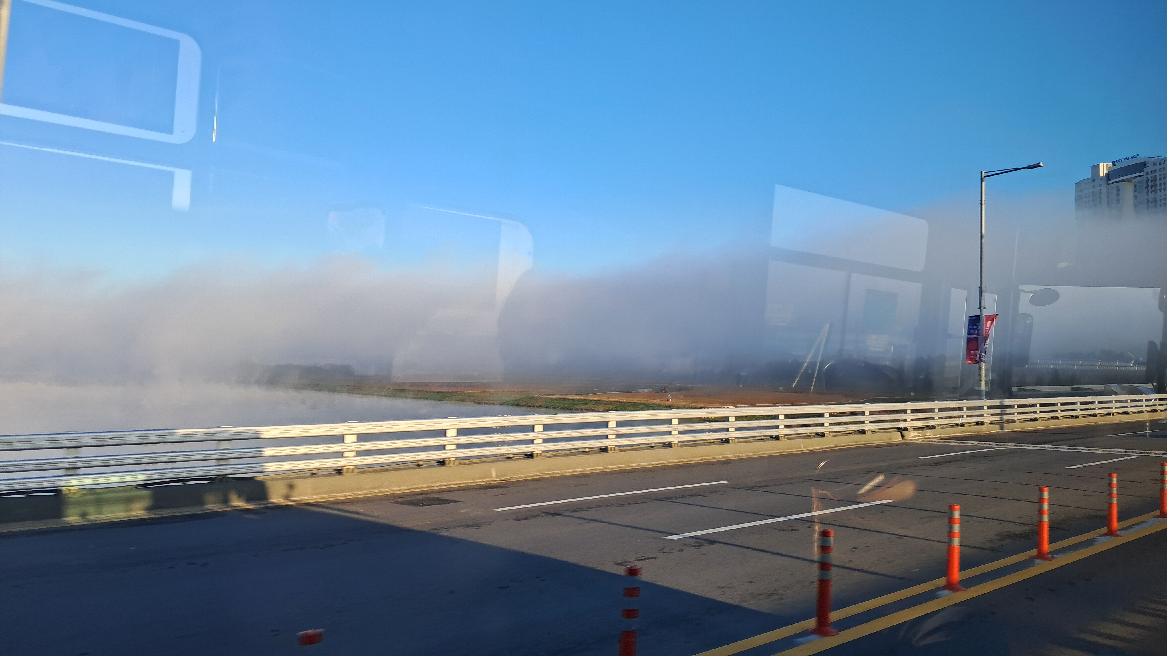 여주대교를 건너면서부터 안개로 가득한 도로를 따라 버스는 달려갑니다.