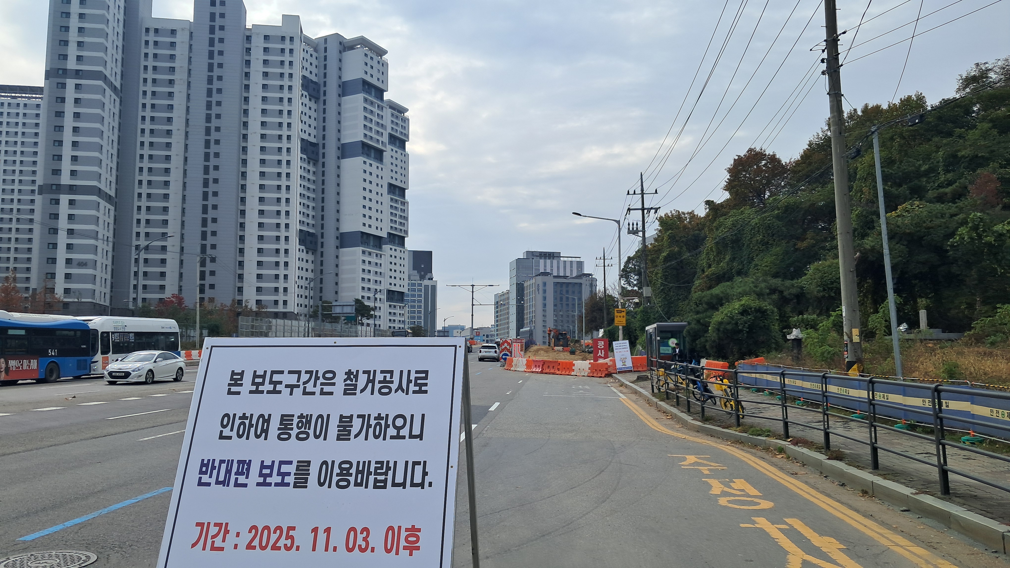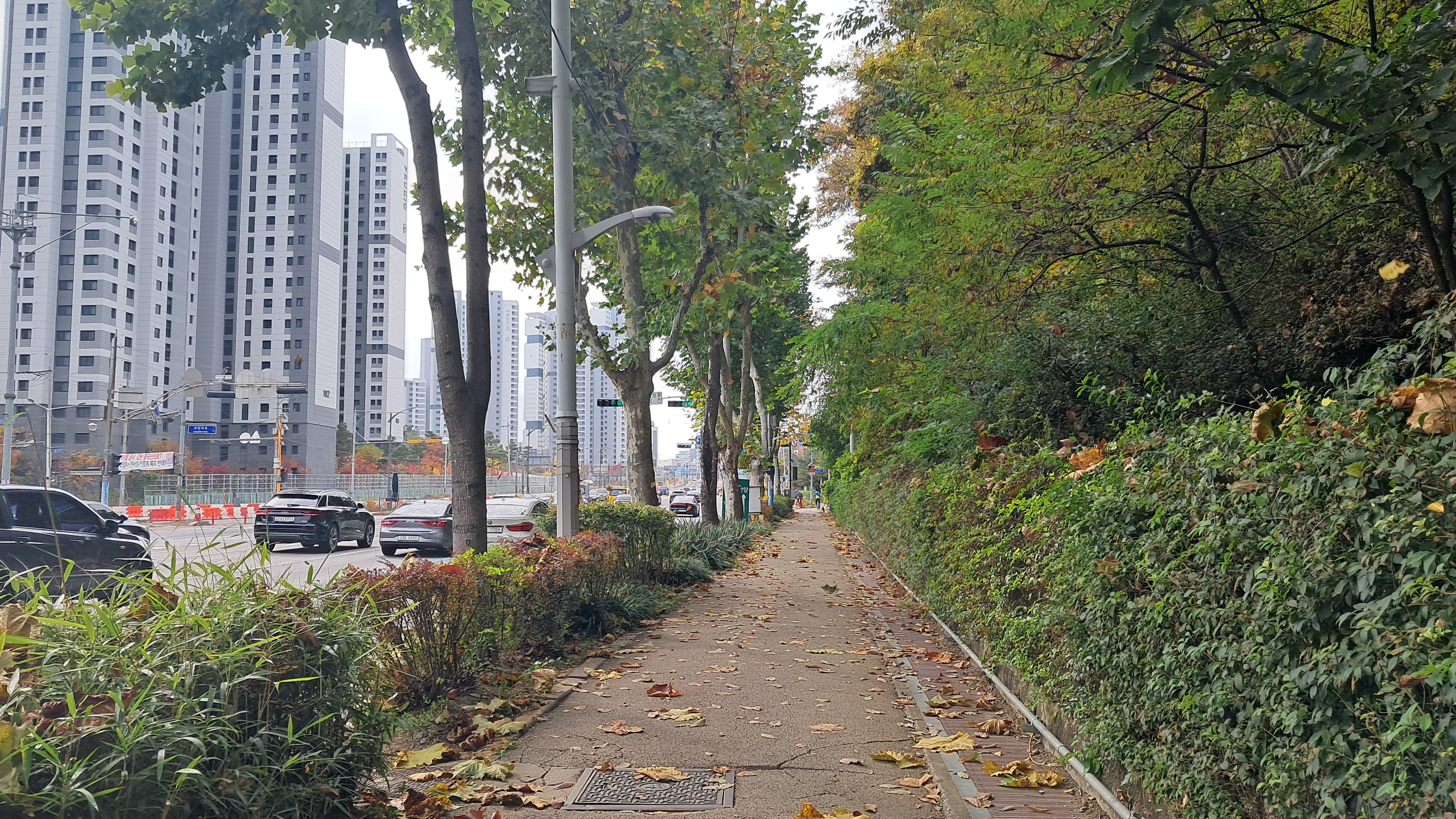 어쩔 수 없이 반대편 인도로 건너가서 걷습니다.