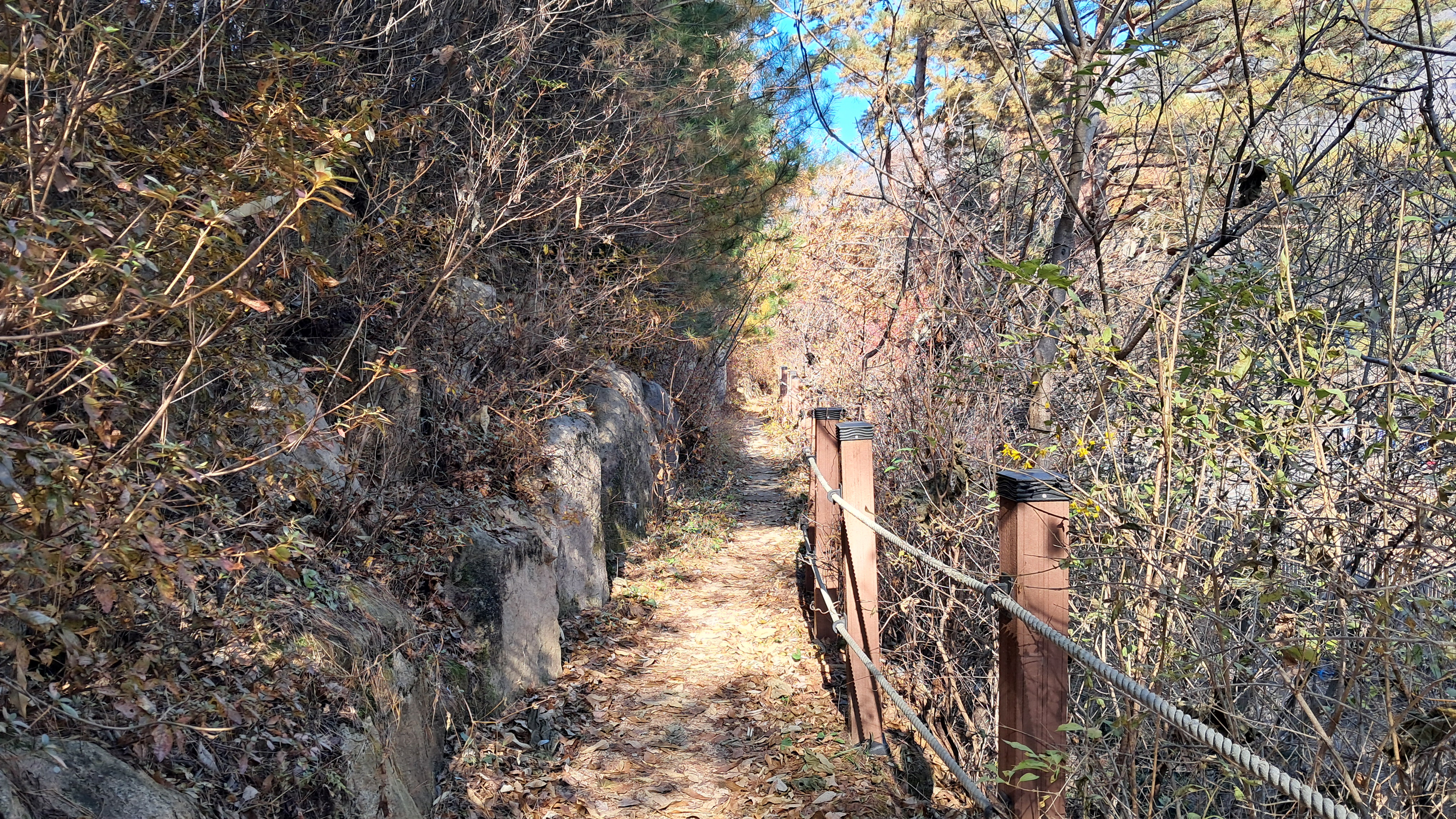 나뭇잎이 떨어졌지만 산속길이 그늘을 만들어 주어 걷기에 좋습니다.