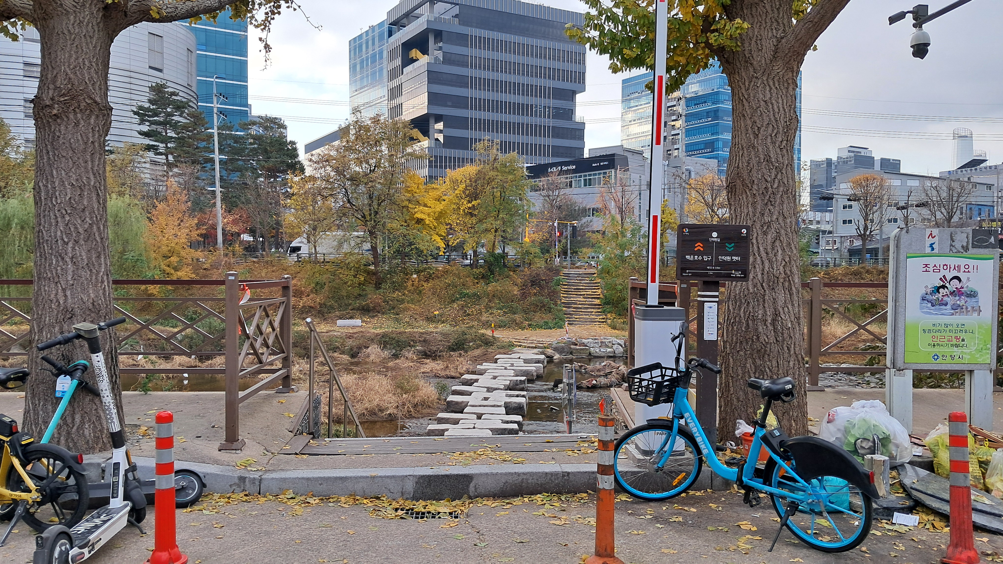 하천이 나뉜 곳에서 우측다리를 건너서 이어갑니다.