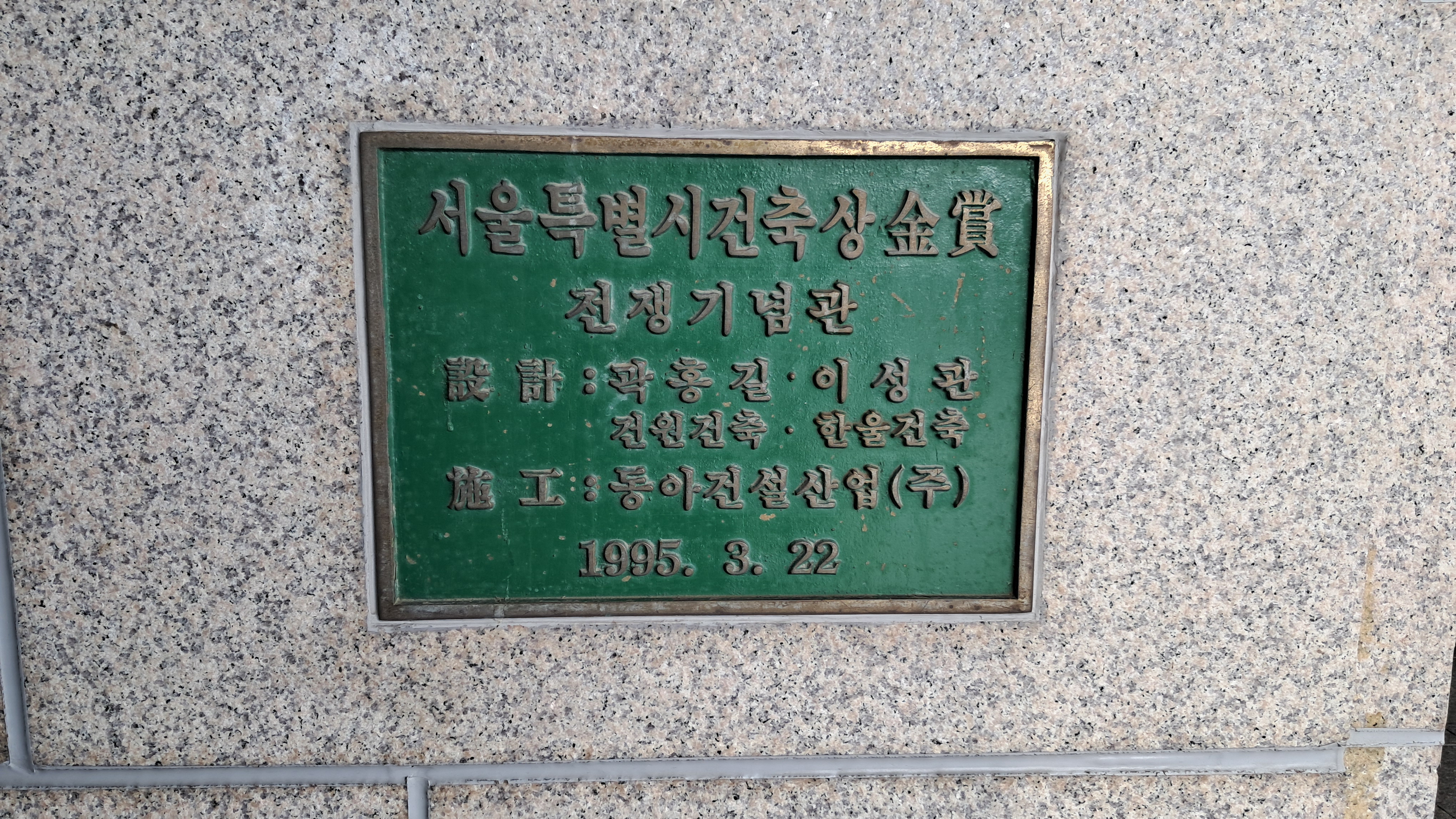 벽면에는 전쟁기념관이 서울특별시 건축금상을 수상한 명판이 붙어있습니다.