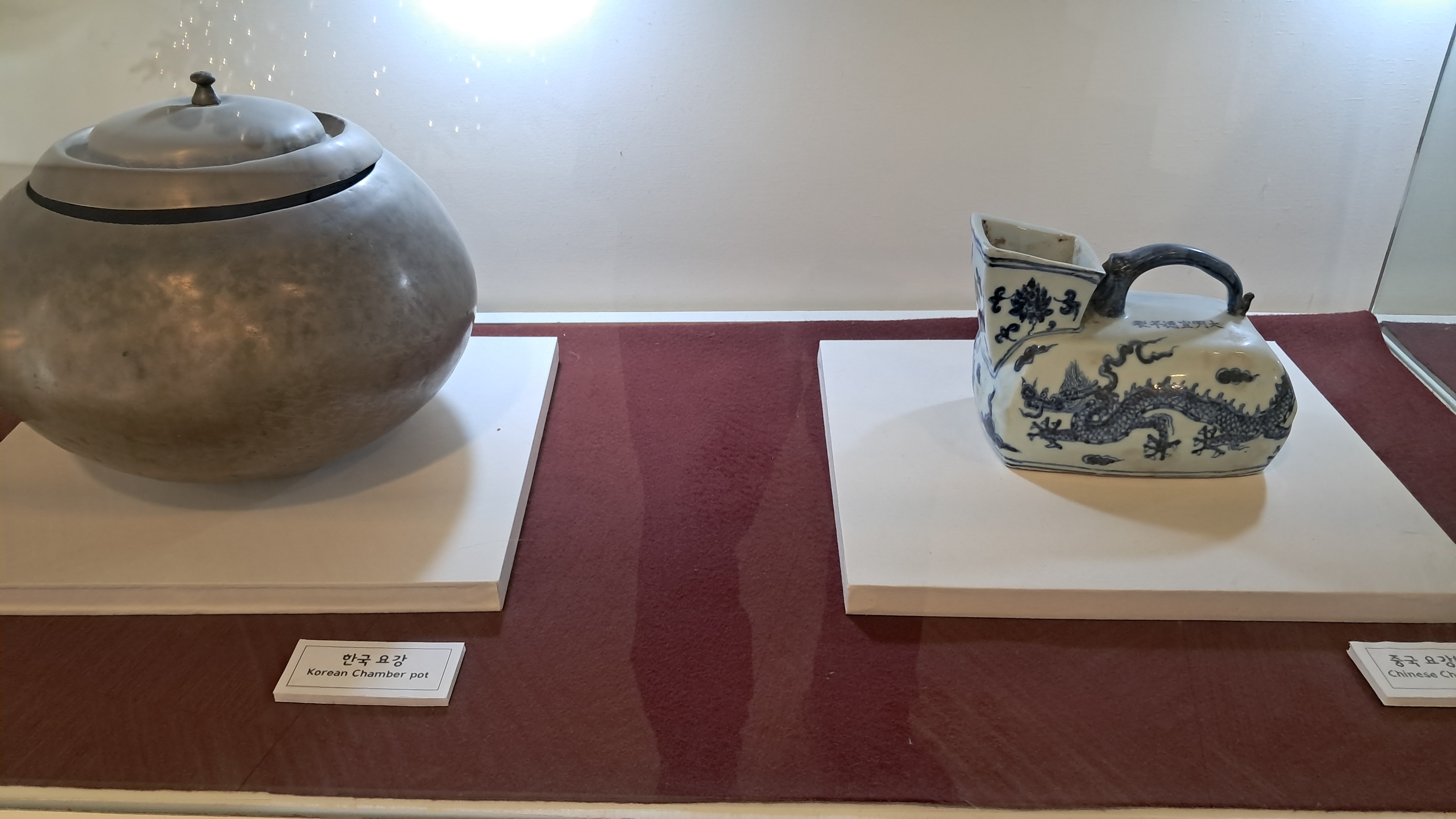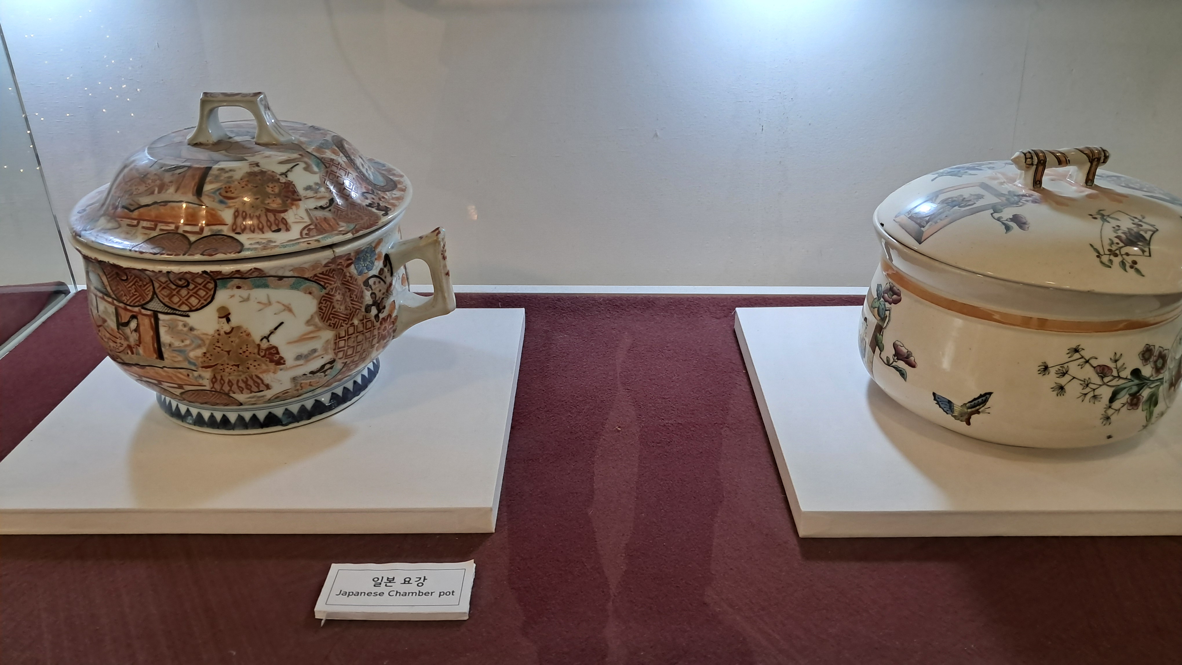 우리나라, 중국, 일본의 요강이 전시되어 있습니다.