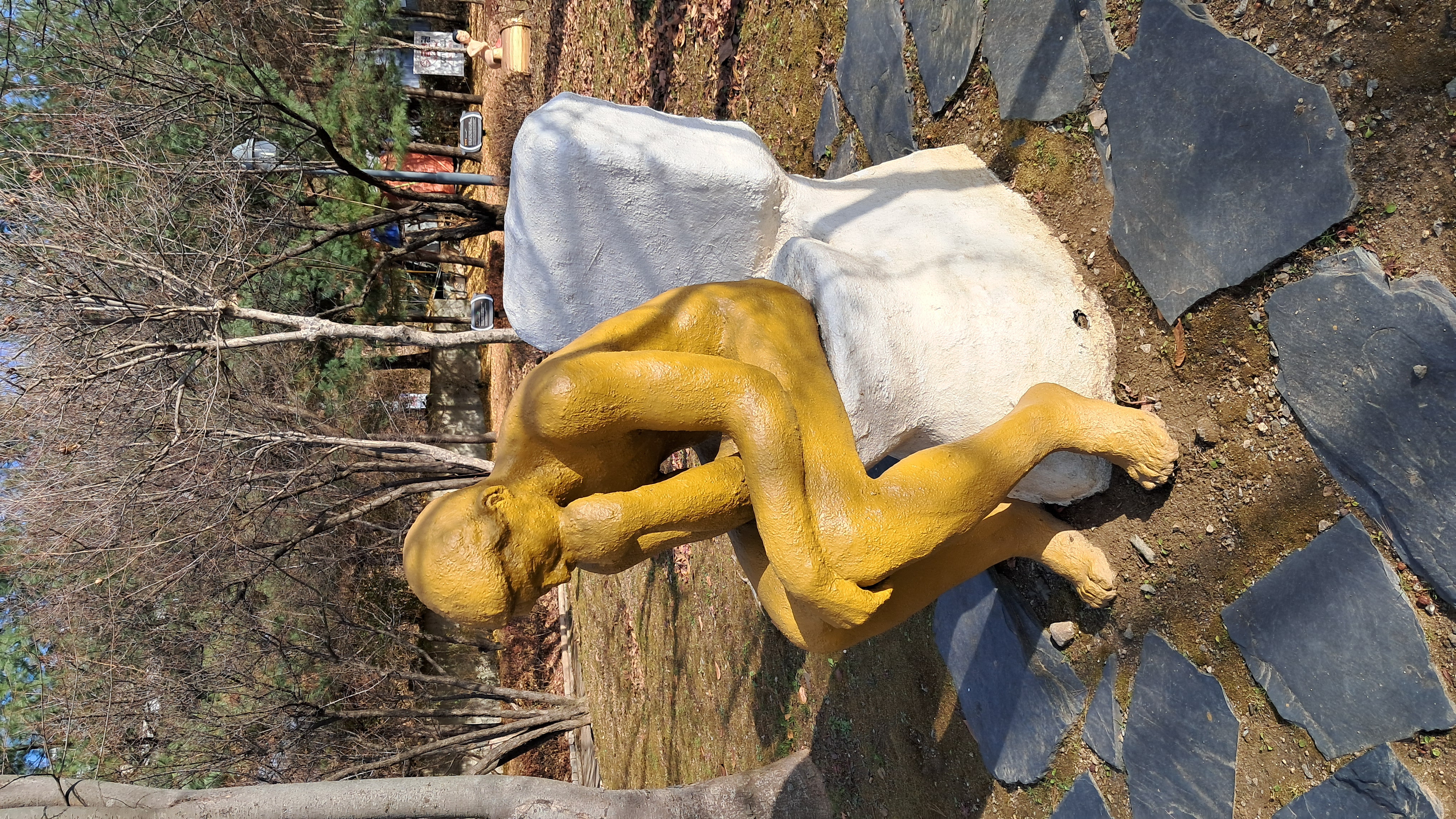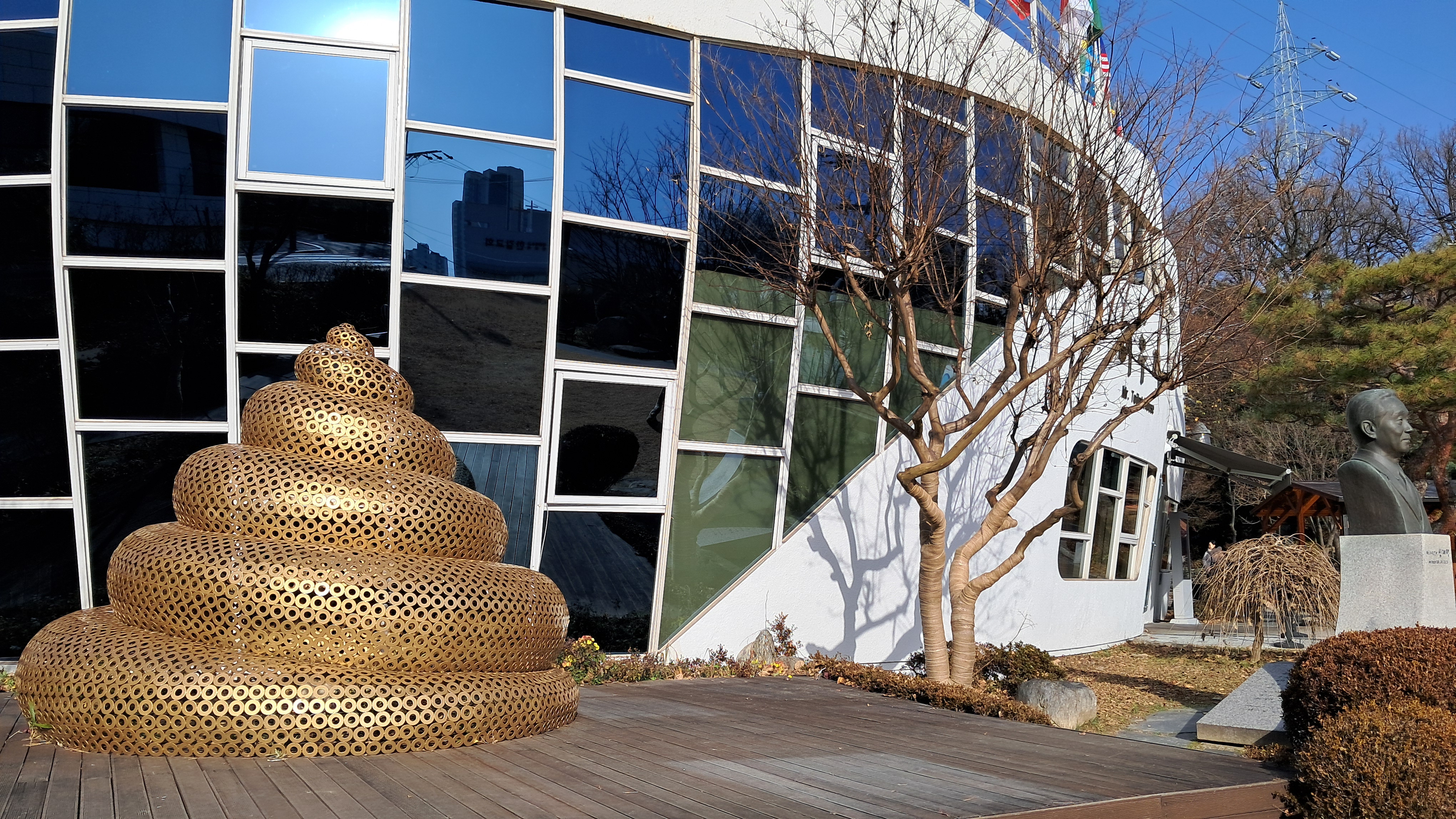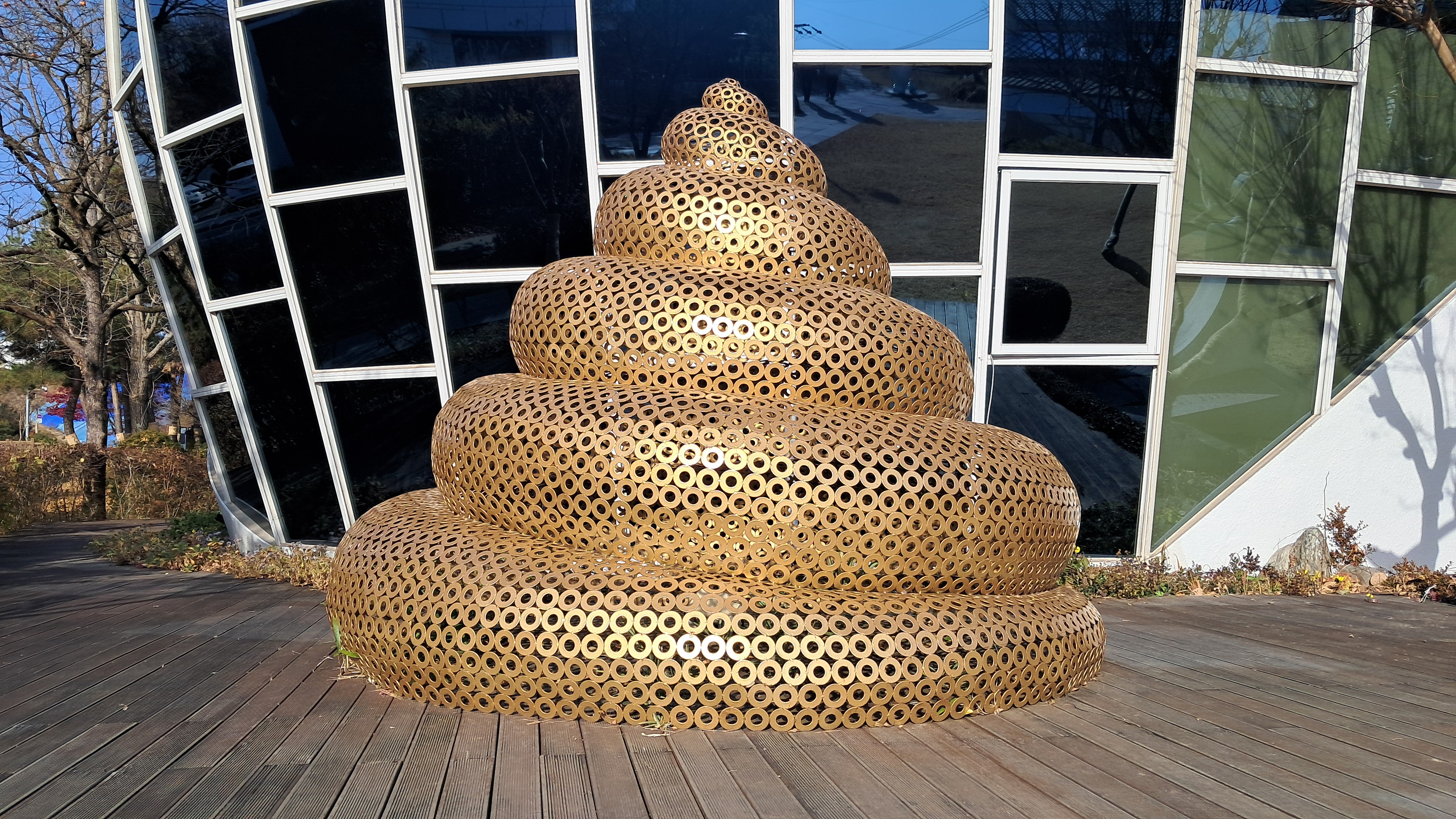구멍 난 둥근 원형 동전모양의 금속으로 황금색 똥의 조형물이 만들어져 있습니다.