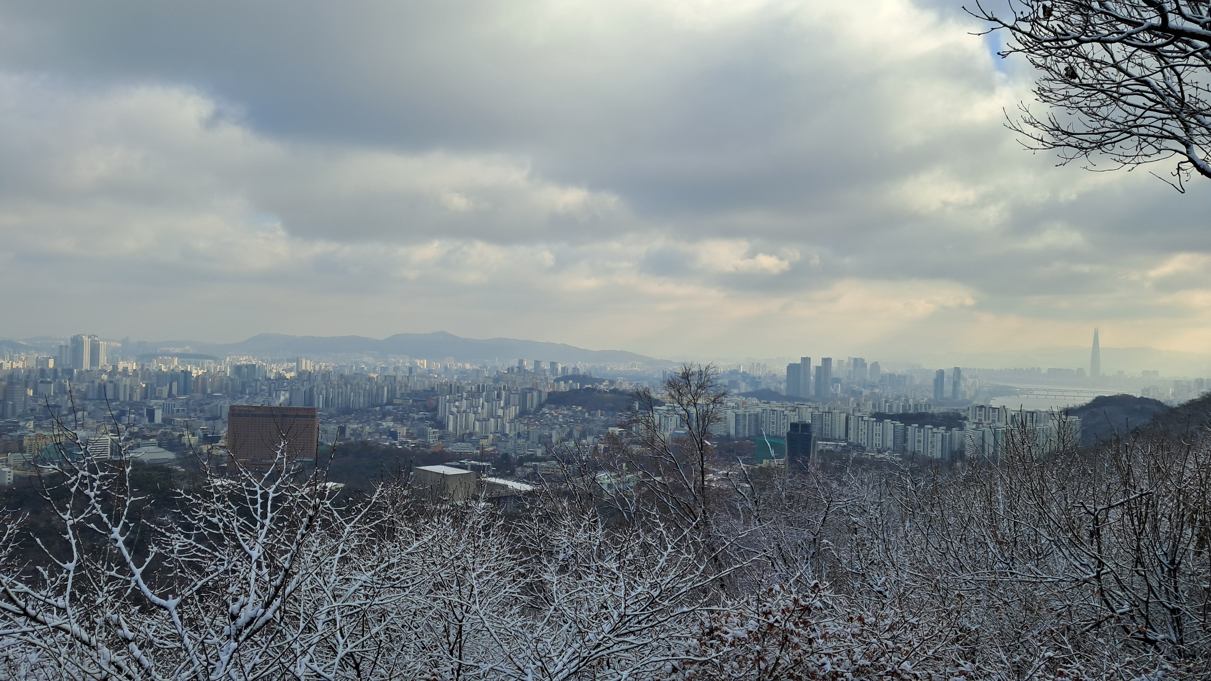 눈 내린 서울시내의 멋진 전망이 펼쳐집니다.