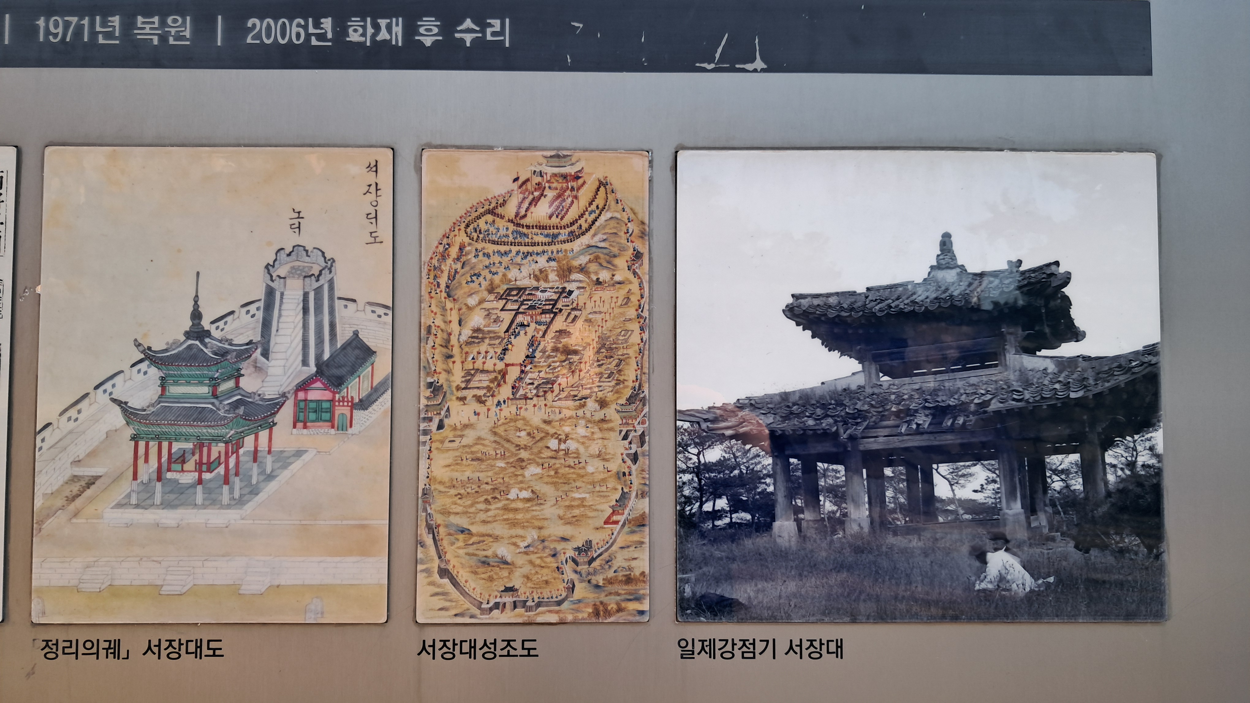 안내표지판에 서장대의 원래모습 그림과 오래 전의 모습 사진을 볼 수 있습니다.
