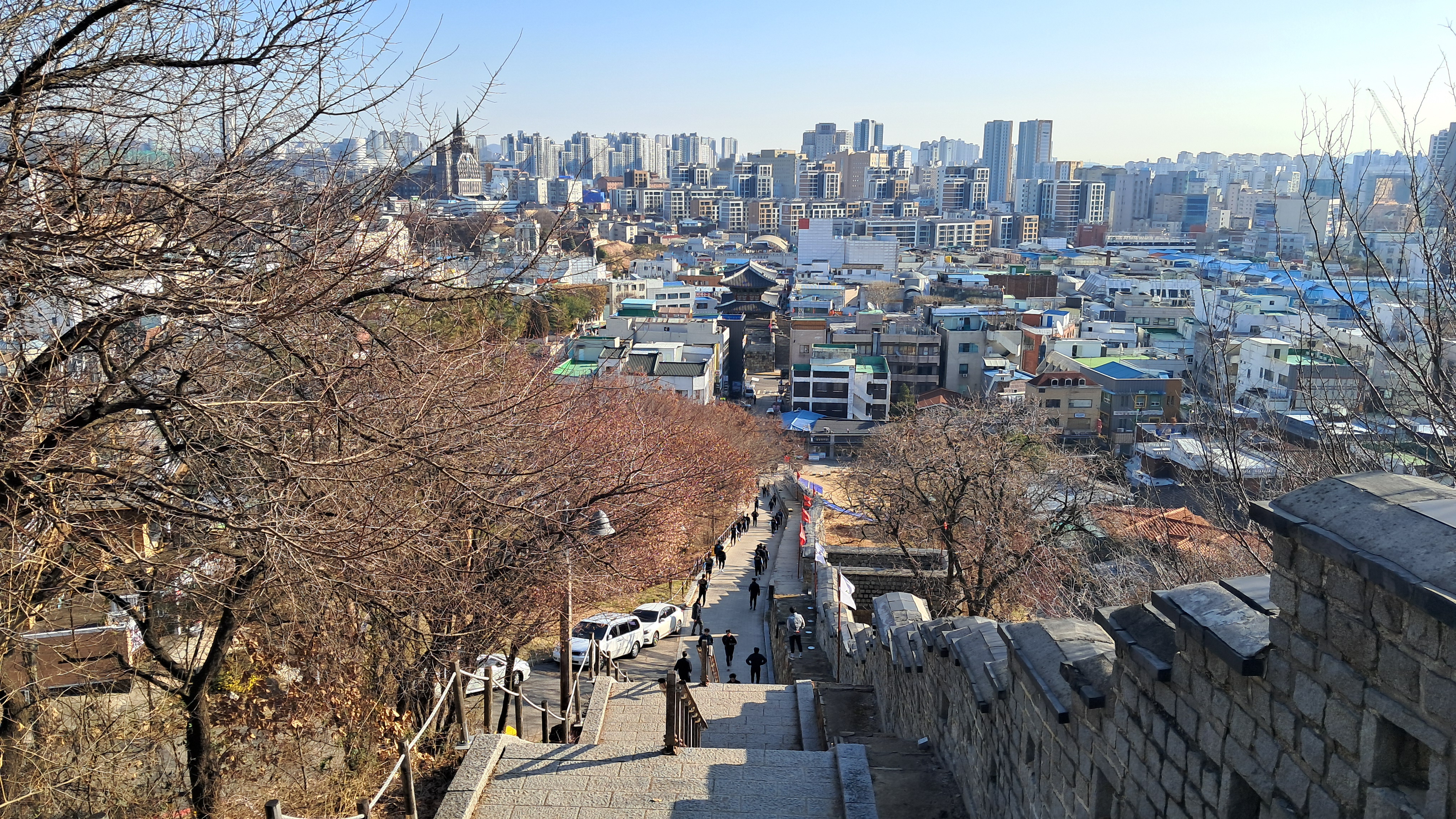 서장대에서 많이 내려와서인지 성곽과 시내가 가깝습니다.
