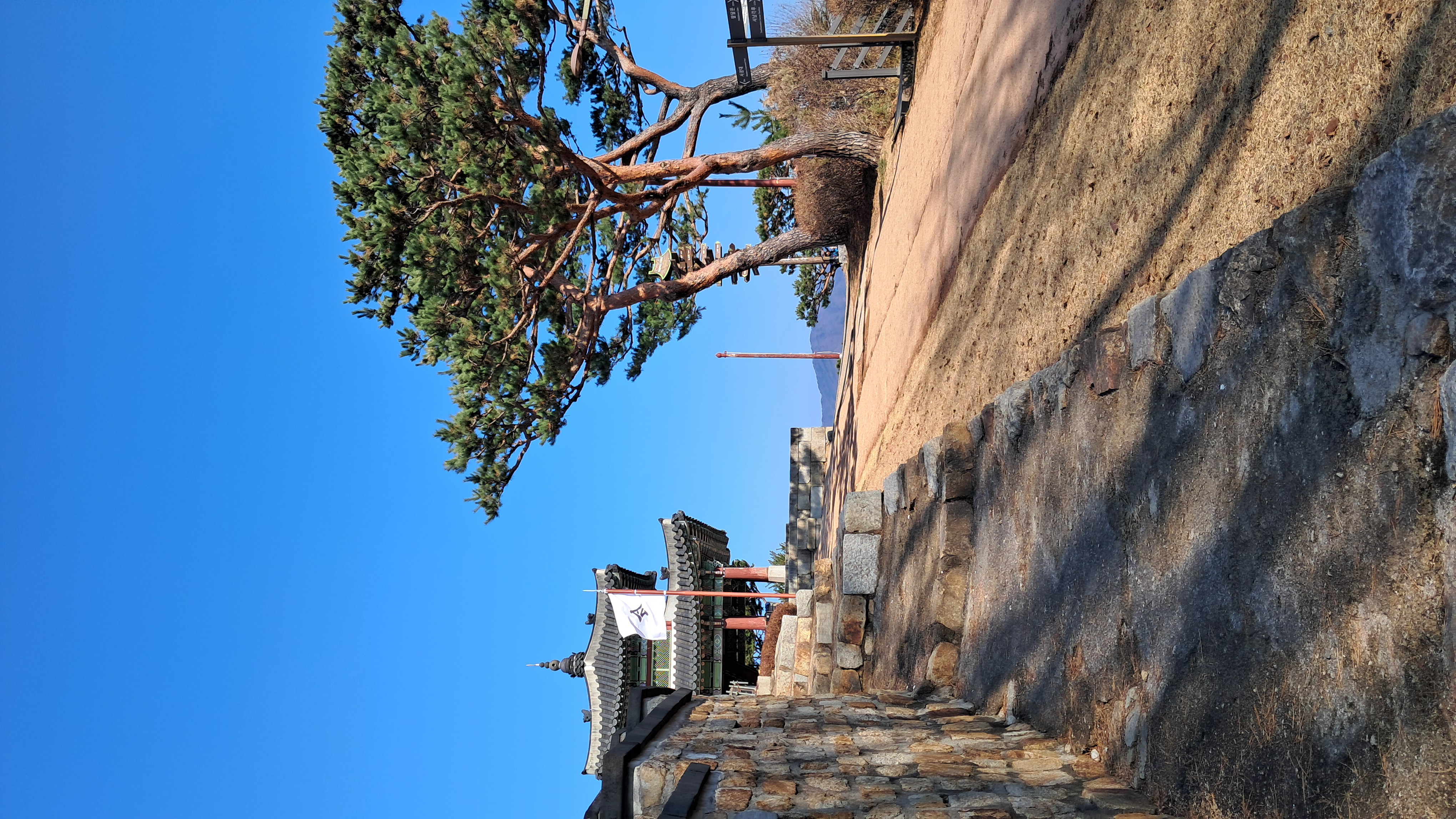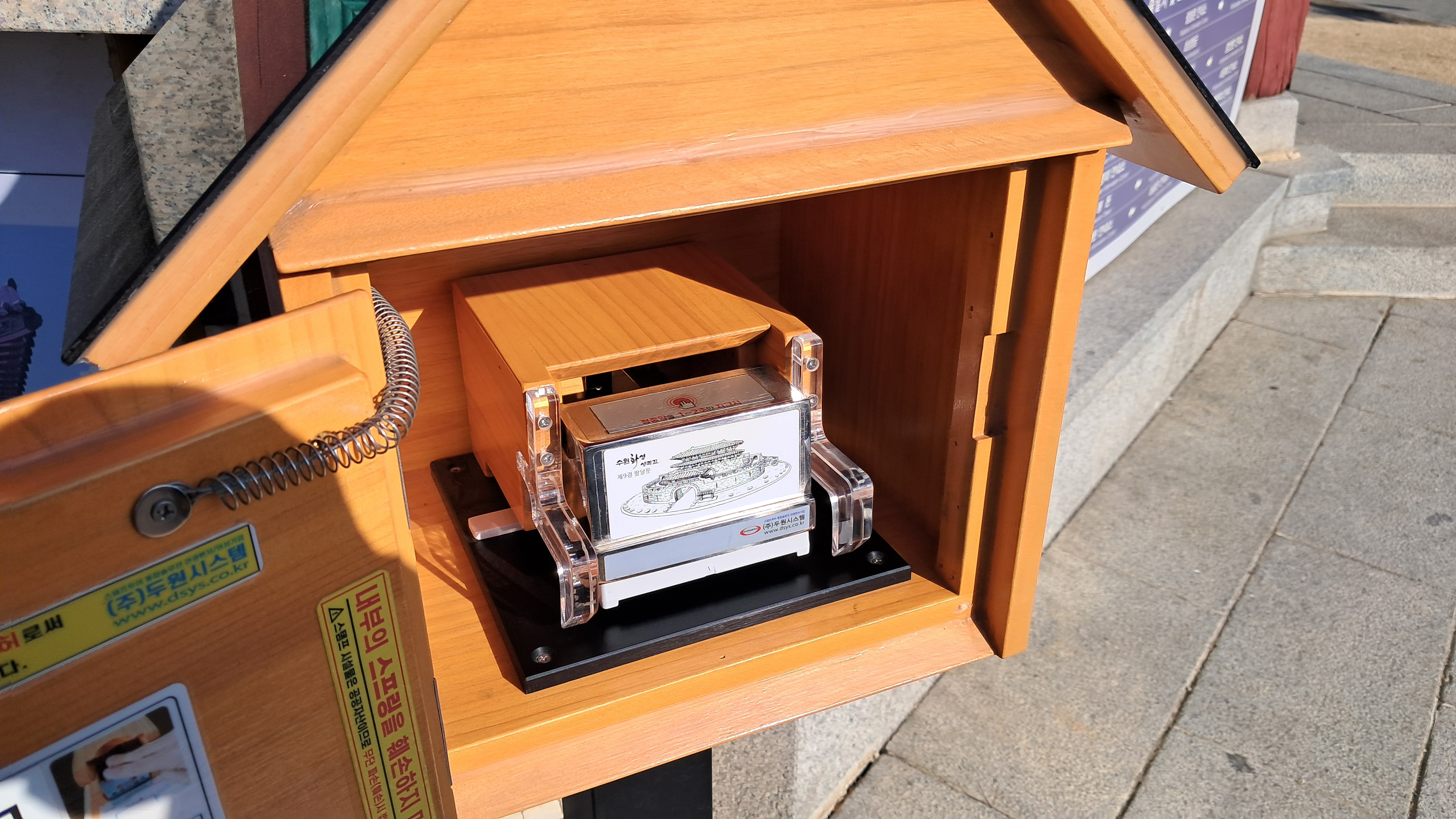 성 안쪽 도로 쪽을 바라보니 기와로된 건축물 앞에 스탬프함이 보입니다.
