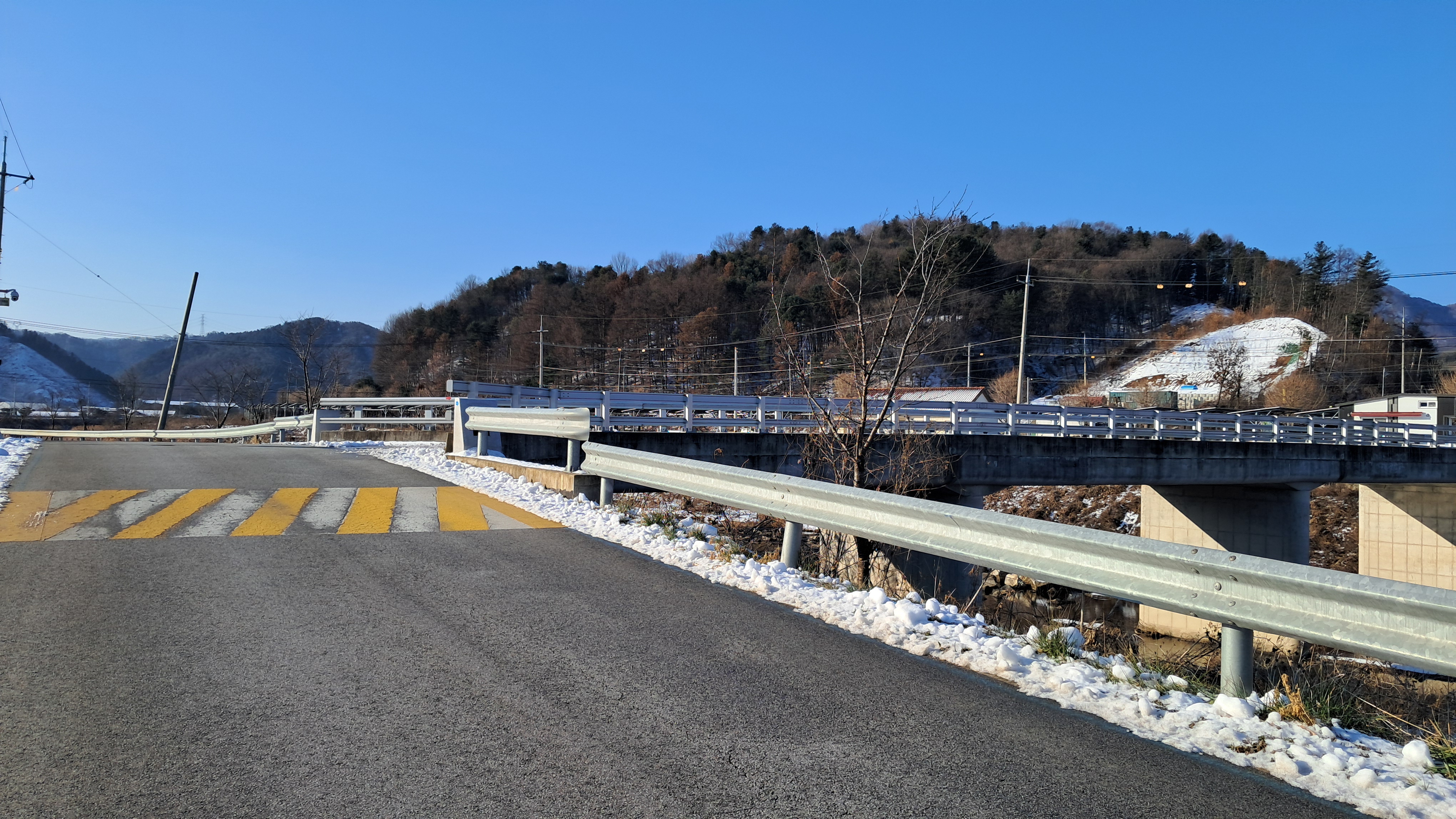 가평방향으로 흘러내려가는 달전천과 눈 쌓인 산의 경치를 잠시 감상합니다.