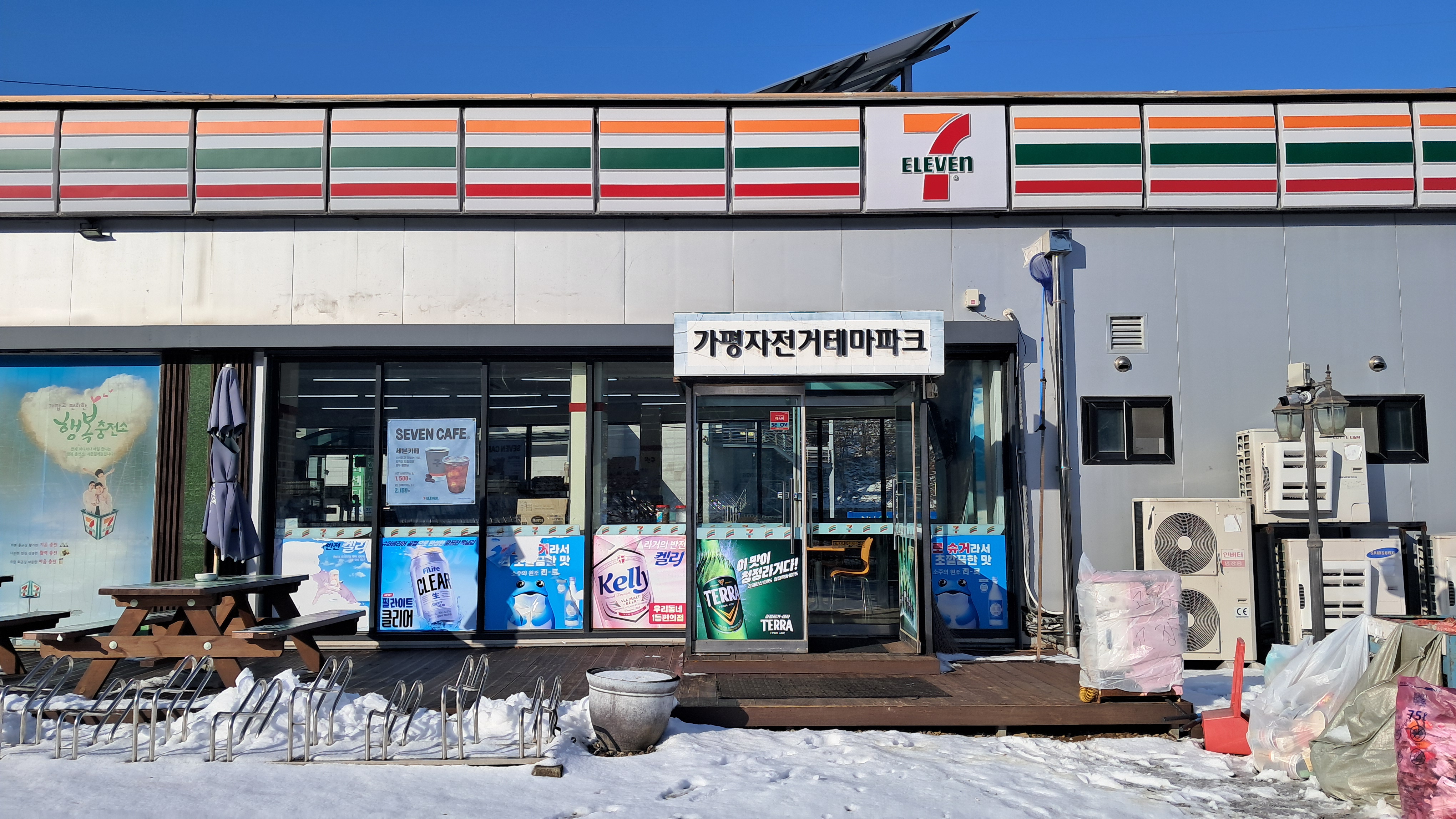 큰 편의점이 자전거길 바로 옆에 위치해 있습니다.