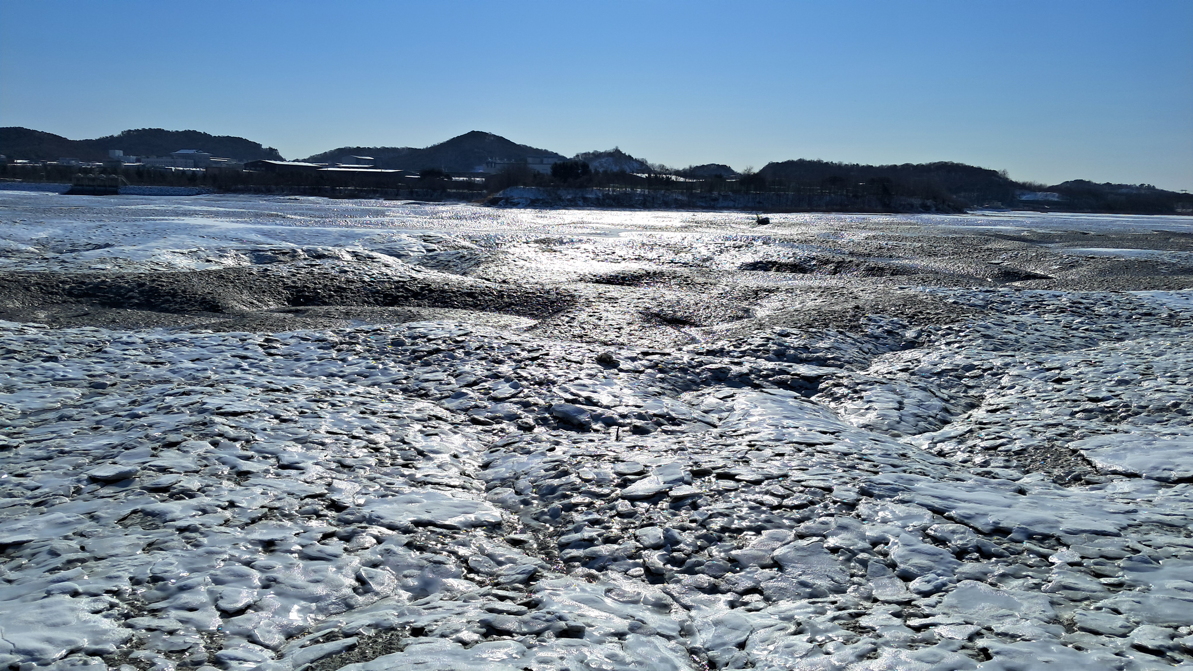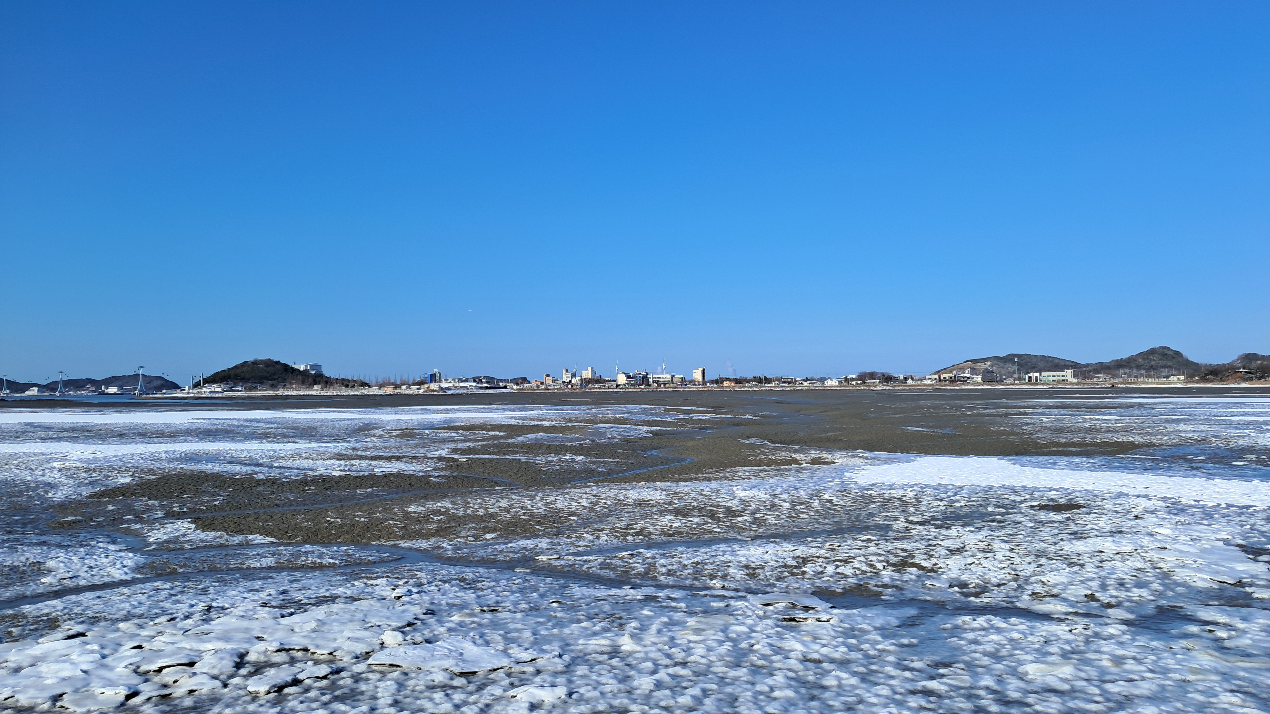 가까이에서 해안을 보니 얼음이 꽝꽝 얼어붙은 상태입니다.