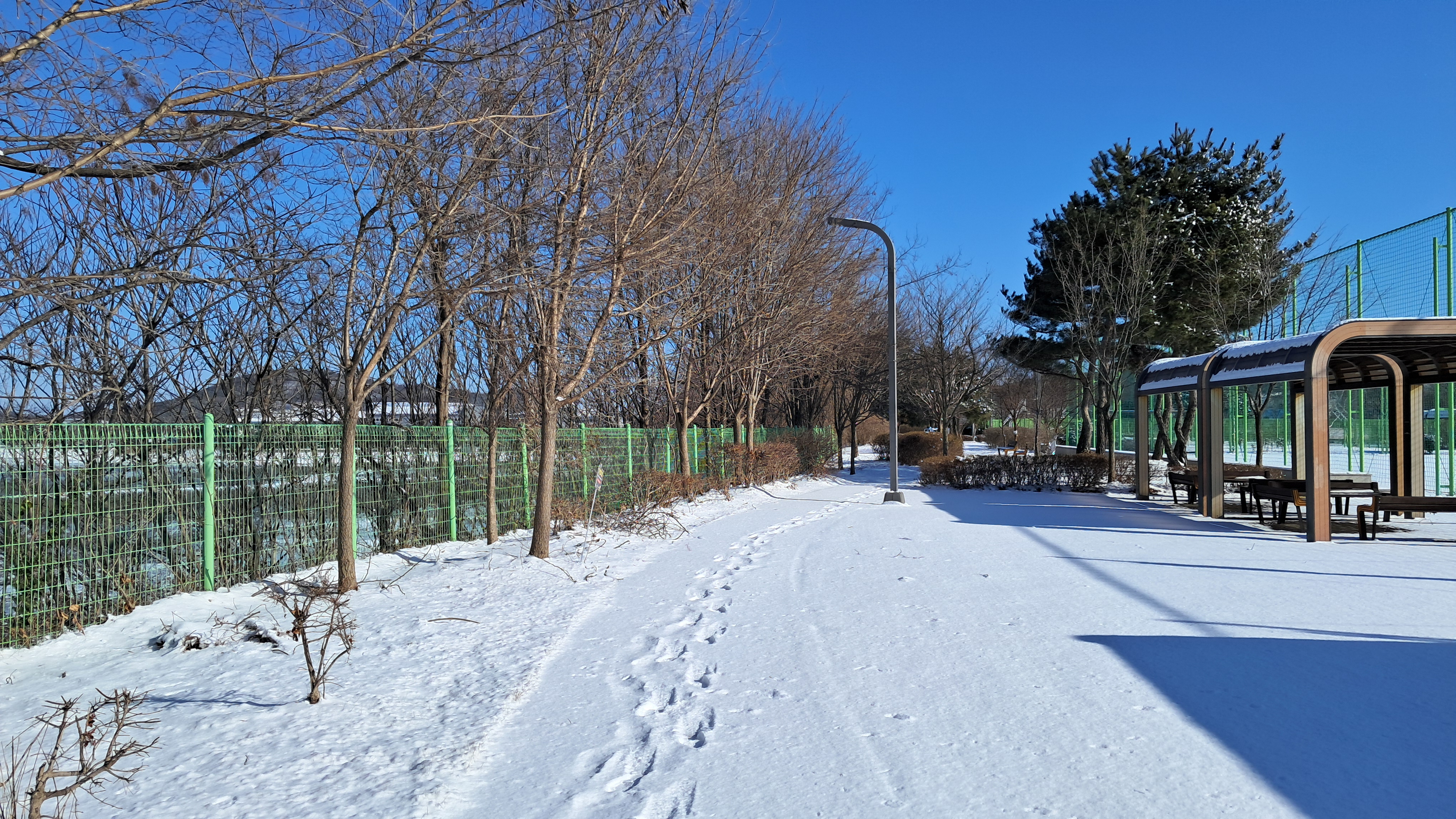눈길보다는 배수로 망을 밟고 좀 더 편안히 걸어갑니다.
