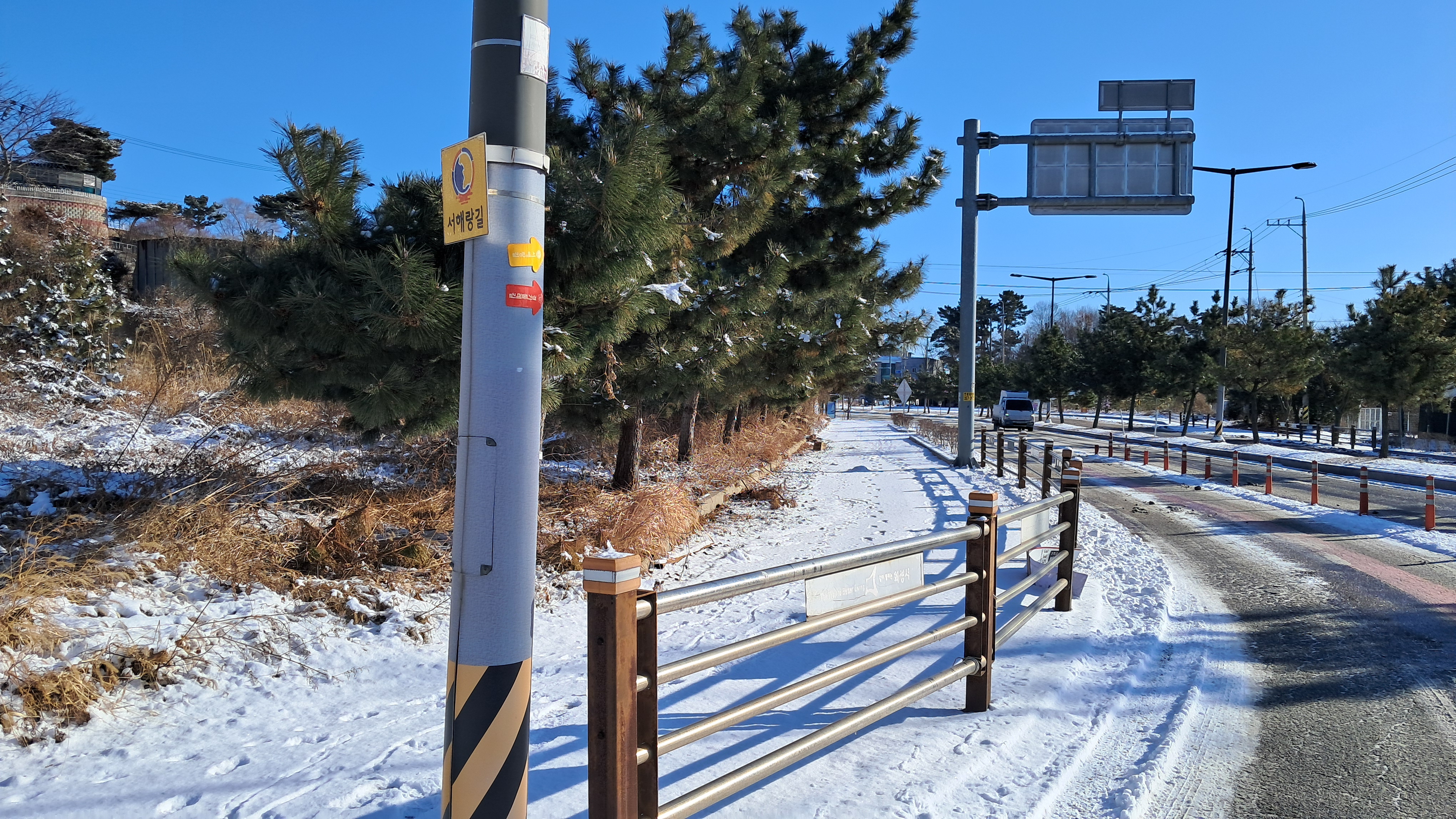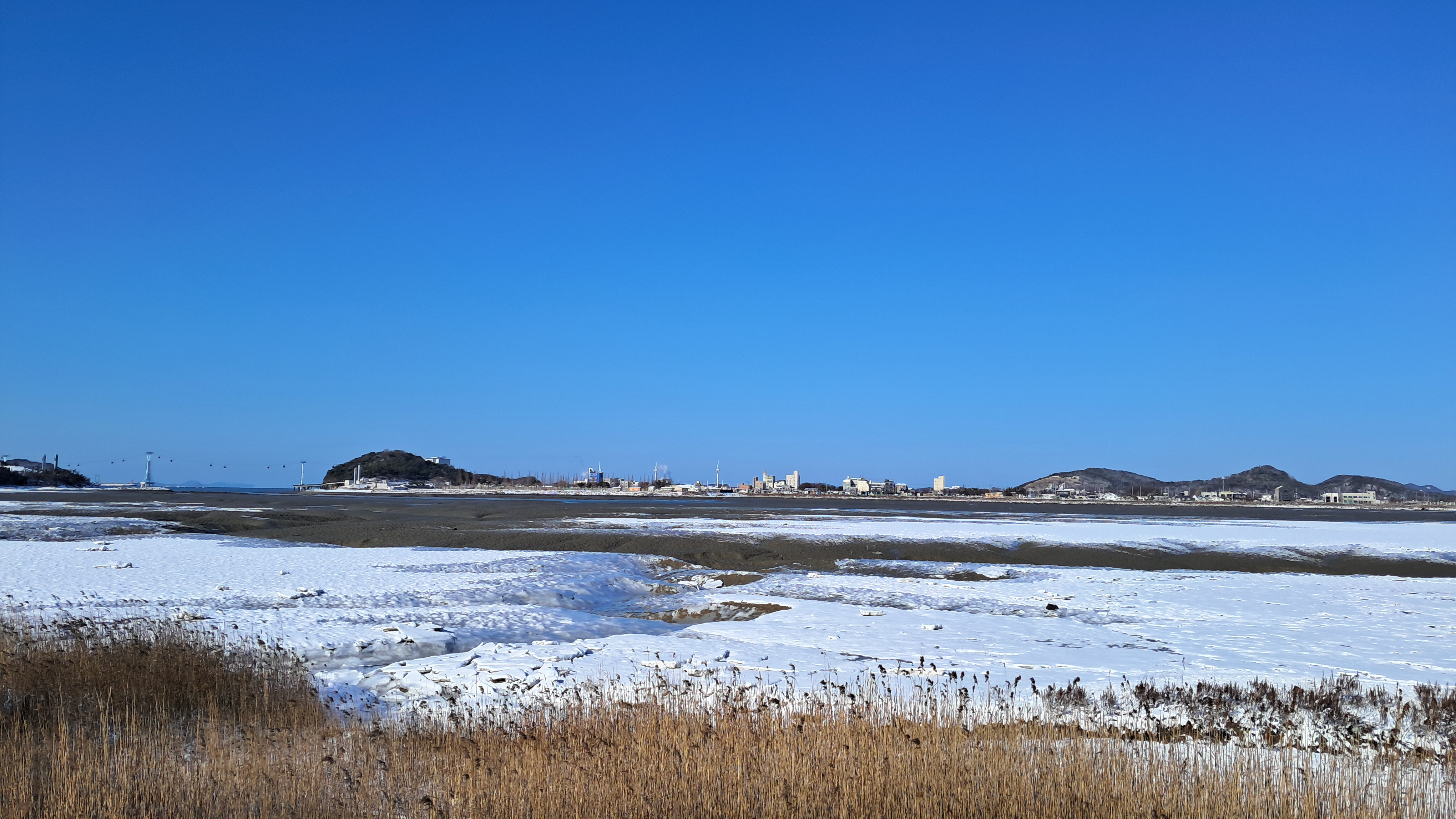 흰 눈이 쌓여 추위가 더 느껴지는 겨울의 해안입니다.