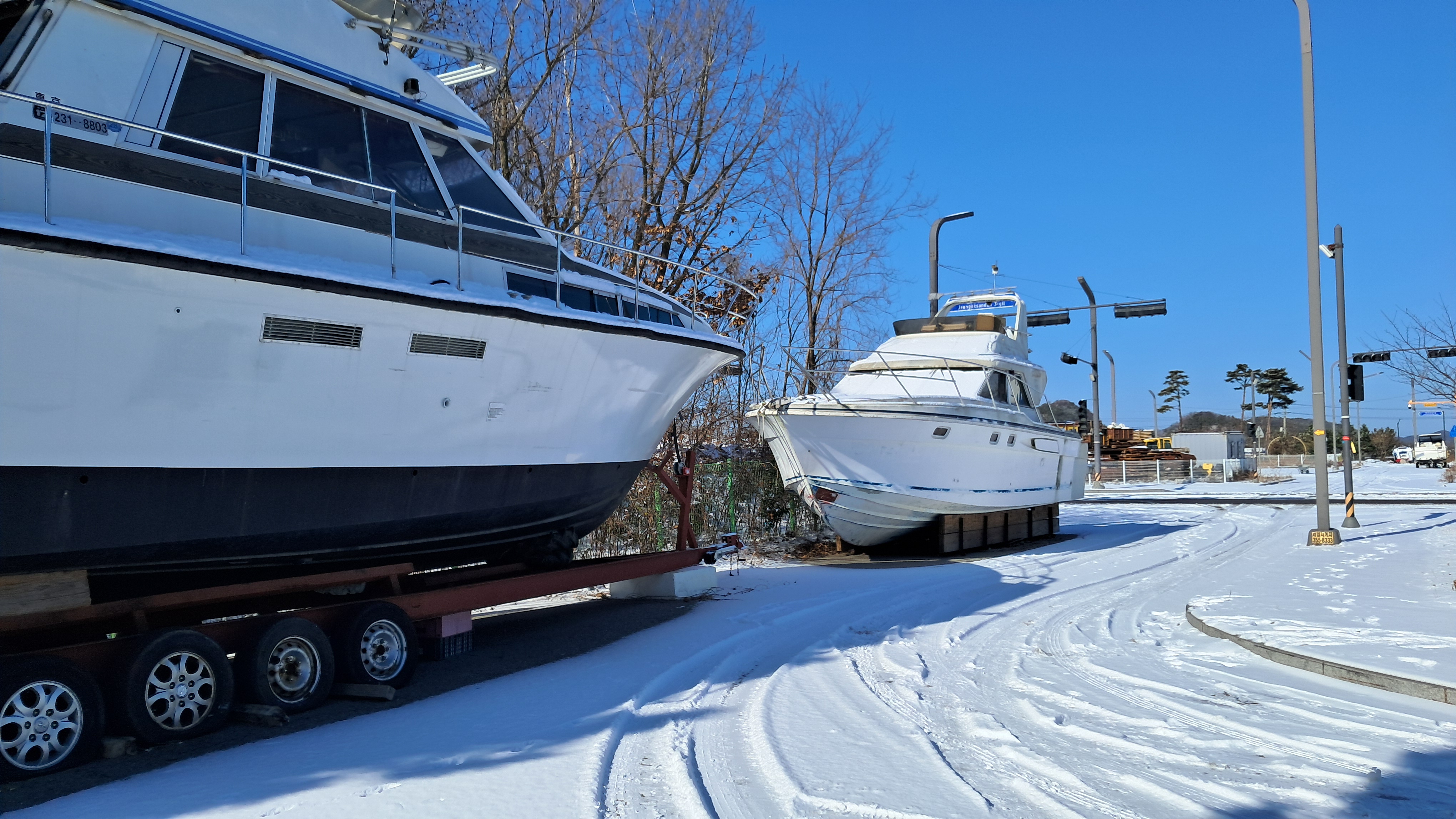 타이어 바람이 빠진 트레일러 위의 배를 보니 땅 위에 오래 있었던 모양입니다.