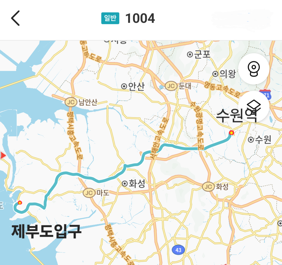 지난주 제부도입구에서 수원방향으로 가는 1004번 버스를 타고 고색역에서 수인분당선으로 귀가했습니다.